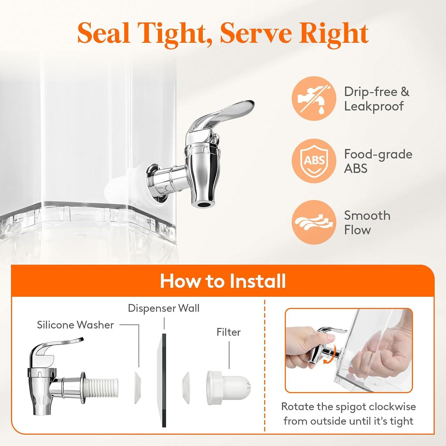 Leak-proof Sealing: Equipped with a thick silicone washer to prevent leaks around the spigot; made from premium ABS for smooth water flow and drip-free dispensing, the spigot keeps your table clean; NOTE: to prevent leaks, ensure the spigot is securely tightened by rotating it clockwise from the outside