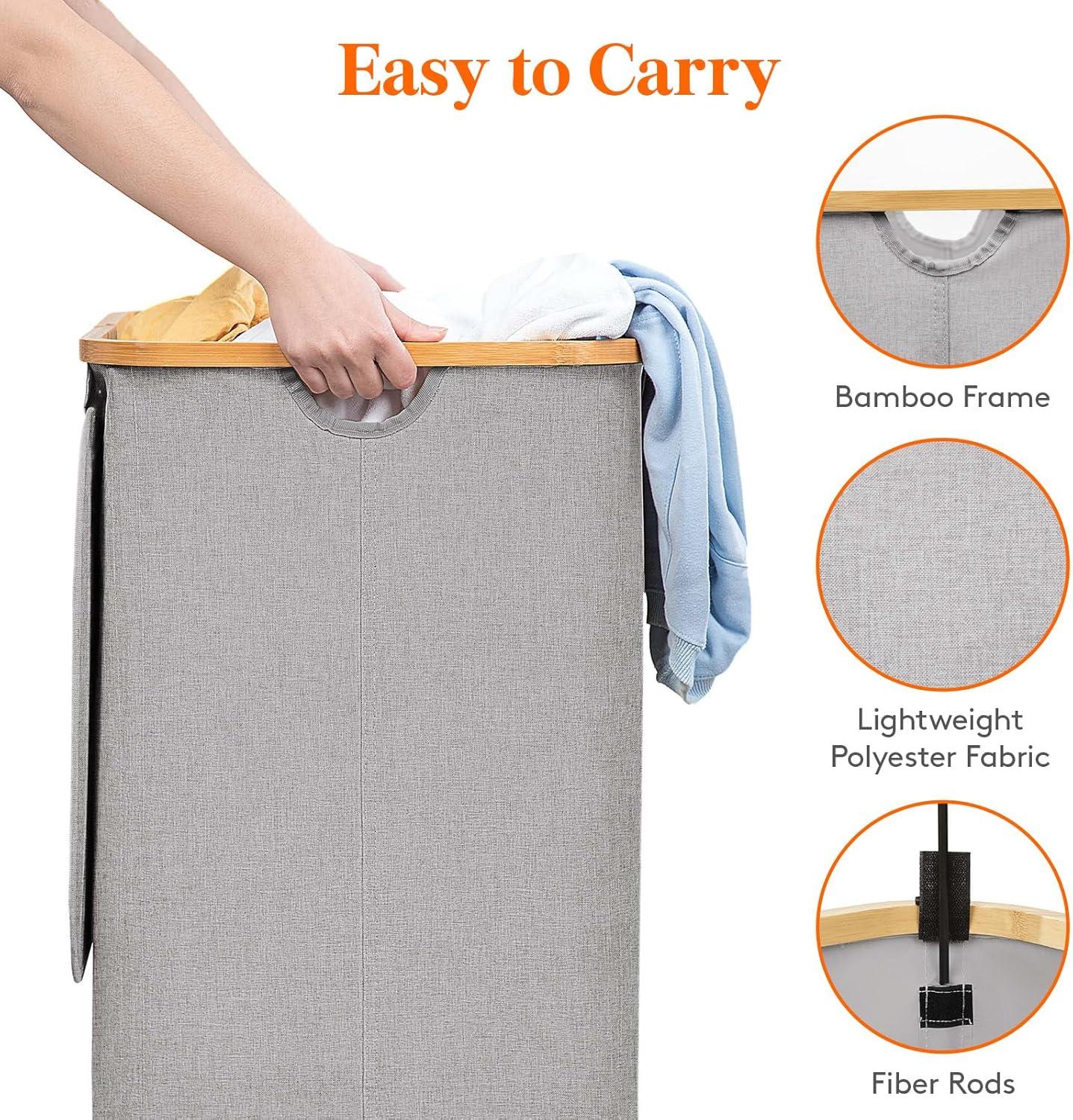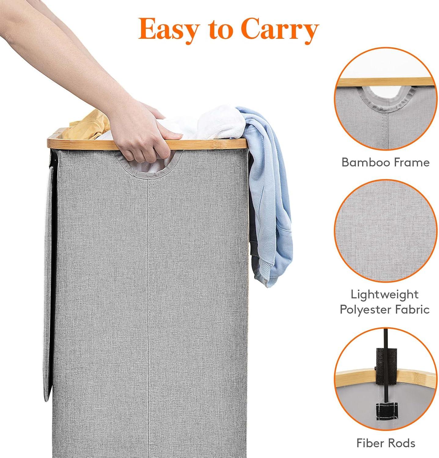 Easy to Carry: Made of high quality polyester fabric and bamboo, this laundry bin is lightweight and easy to carry. Two bamboo handles provide firm and steady grip when moving from one room to another.