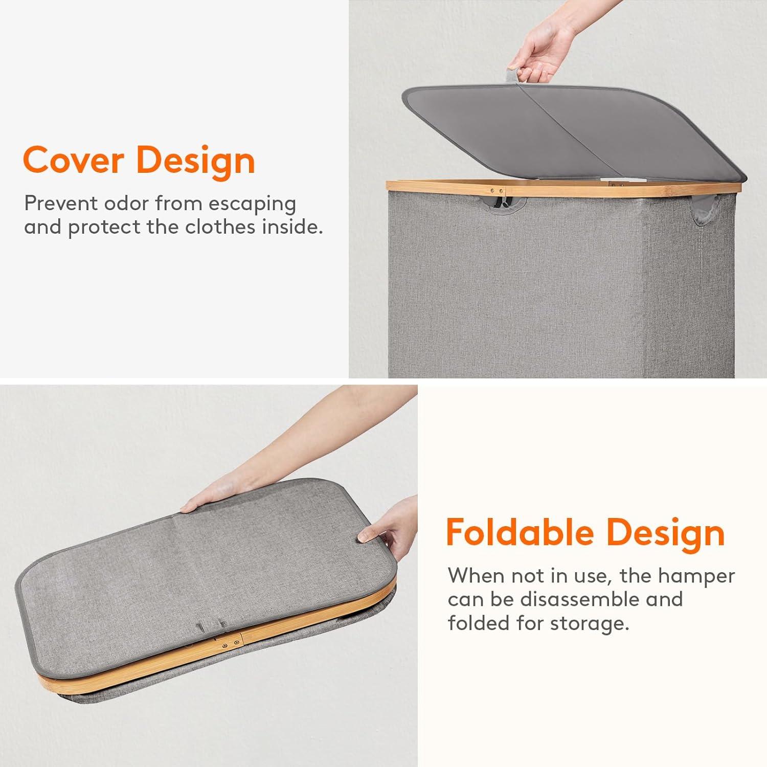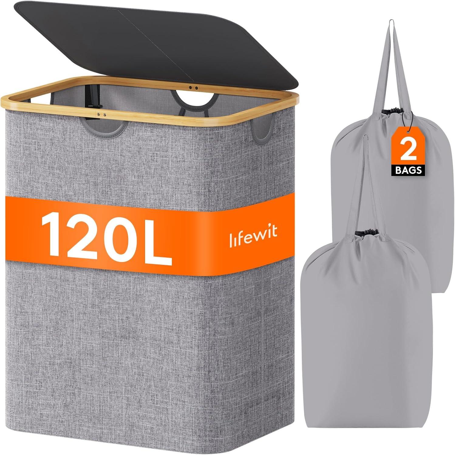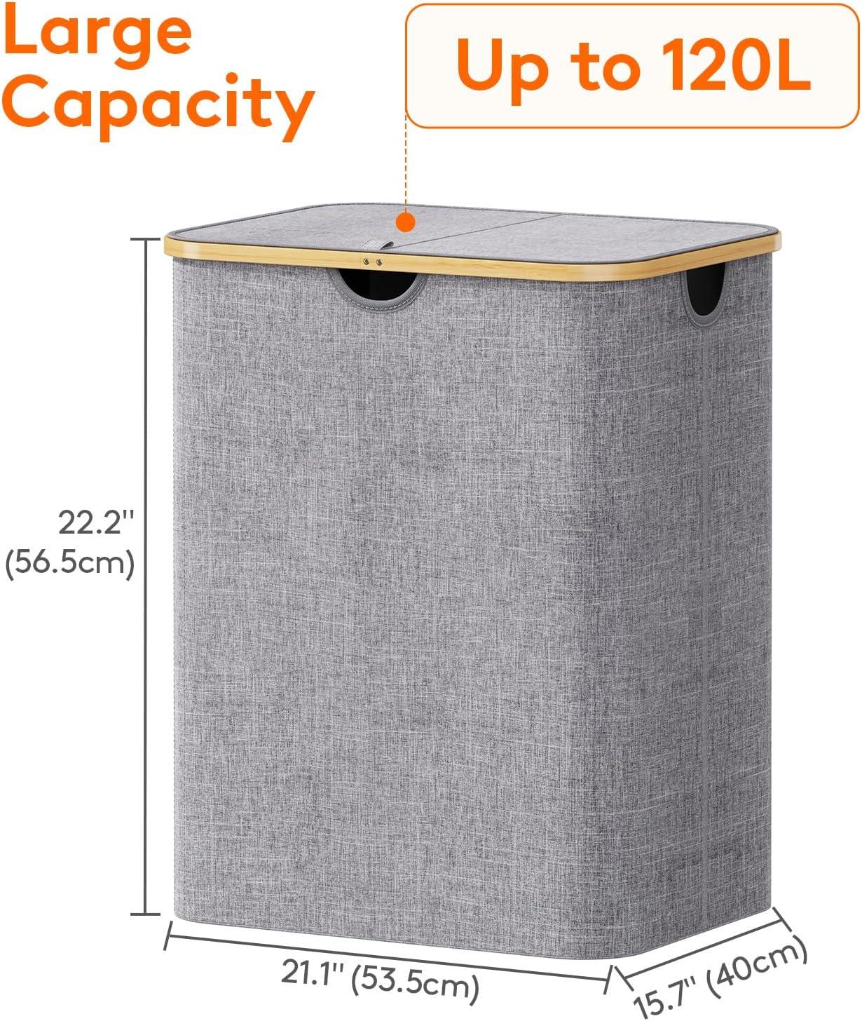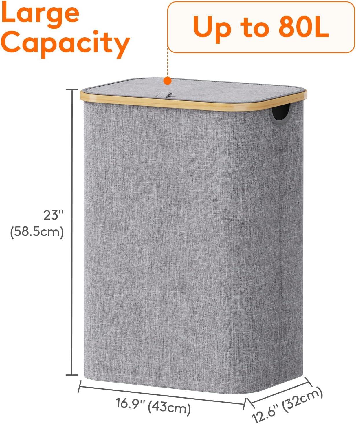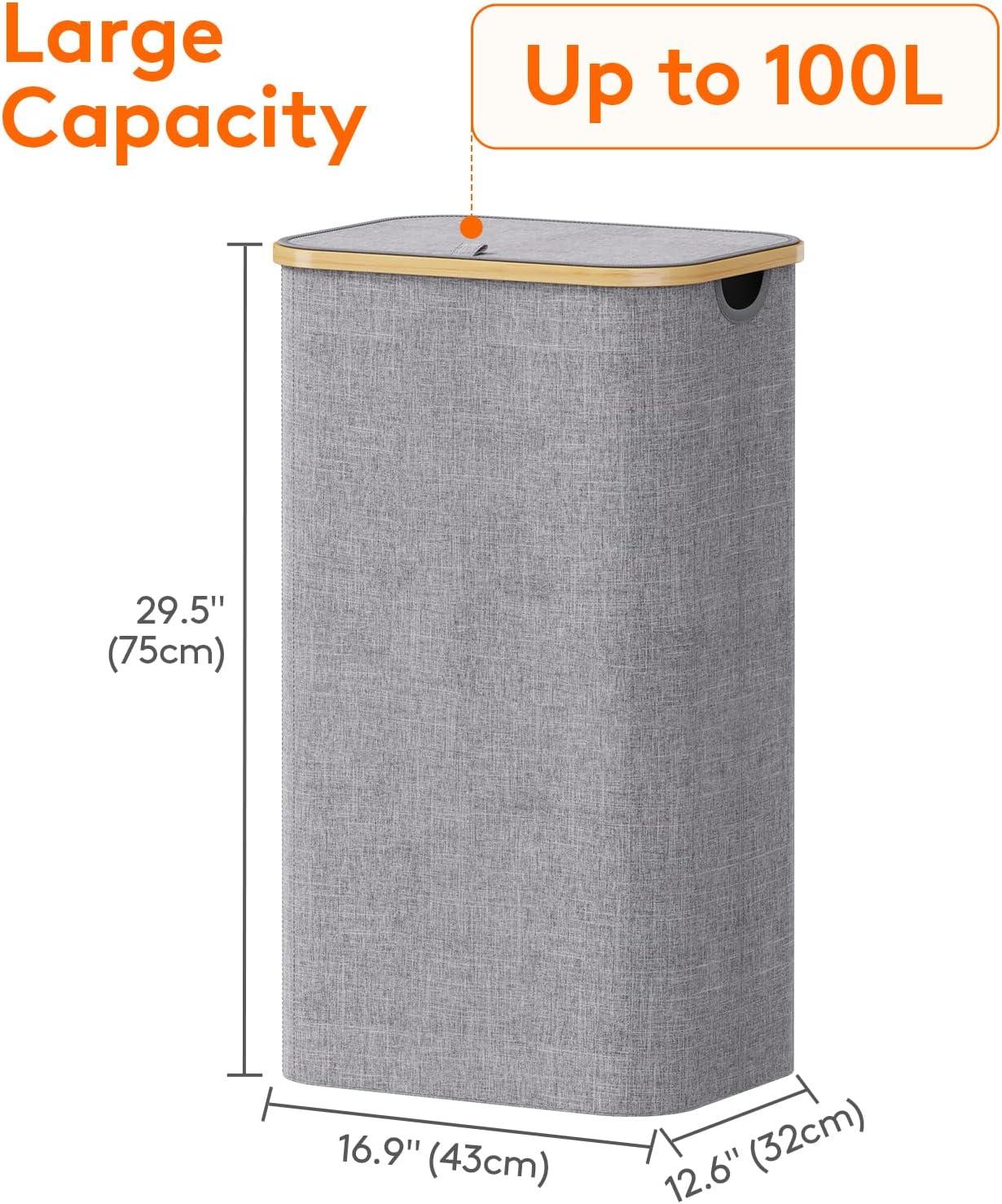 Lifewit 100L Laundry Basket with Lid, Clothes Hampers for Laundry with Bamboo Handles and A Removable Bag, Large Foldable Laundry Hamper for Bedroom, Bathroom, Dorm, Laundry Room, Gray(Light Gray)