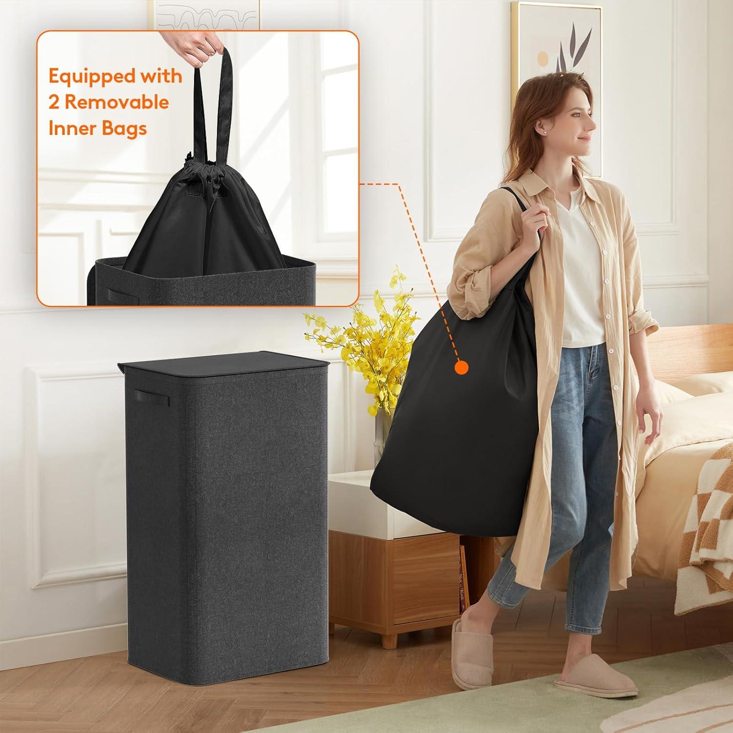 Removable Inner Bags: The hamper is equipped with two lined bags, allowing for easy portability when detached from the laundry basket, you don't need to move the main laundry basket, just remove the built-in removable laundry bag for washing. Additionally, the lid design of the basket effectively prevents the spread of odors, ensuring a tidy environment.