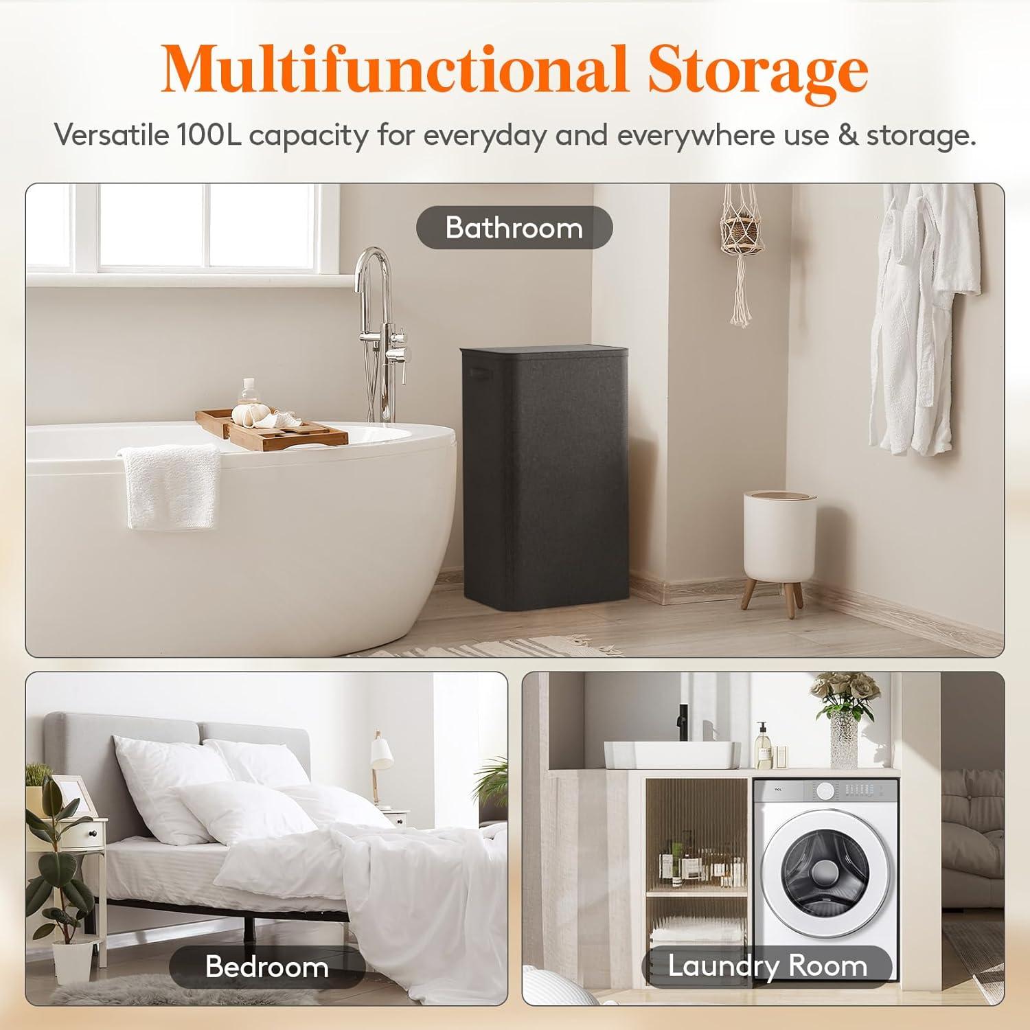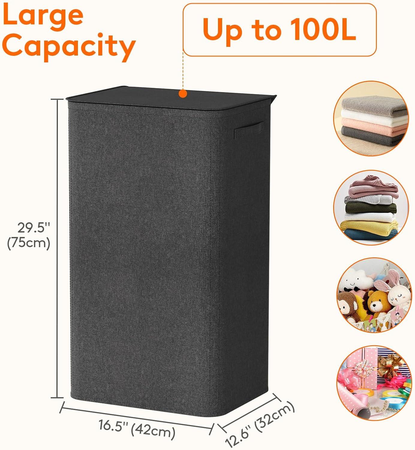 Large Capacity: Measuring at 16.5″(42cm) x 12.6″(33cm) x 29.5″(75cm) and boasting a generous capacity of 100L, our large laundry basket effortlessly accommodates 2-2.5 loads of clothes. It stands stronger, remains more stable, and offers an even greater capacity.
