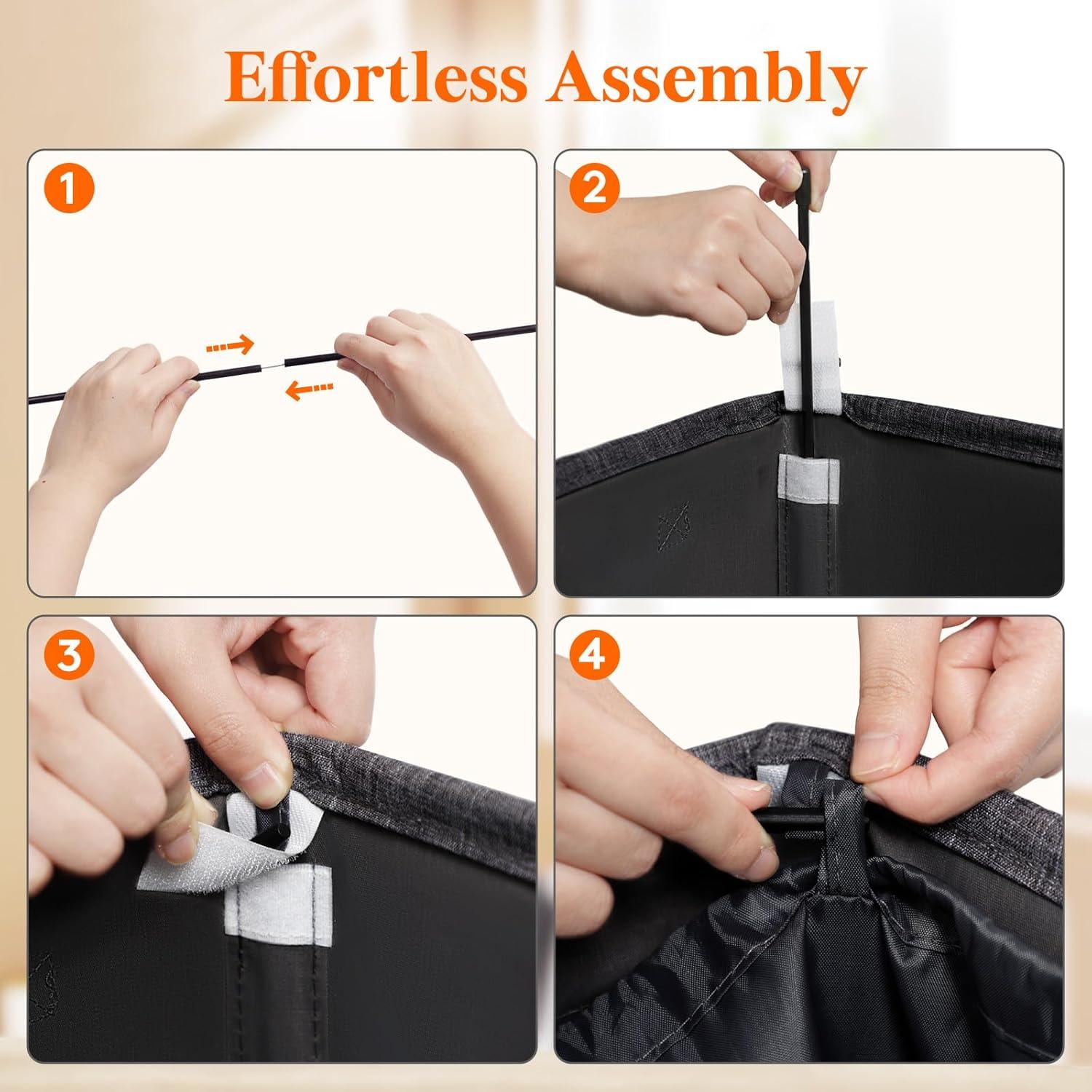 Effortless Assembly and Compact Folding: Simply insert the 4 rods into the corners, and the basket will stand upright with ease. Even when empty, our laundry basket remains firmly in place, thanks to the reliable support of 4 sturdy rods, it will neither collapse nor twist. Plus, when not in use, simply remove the poles and fold it for compact storage.