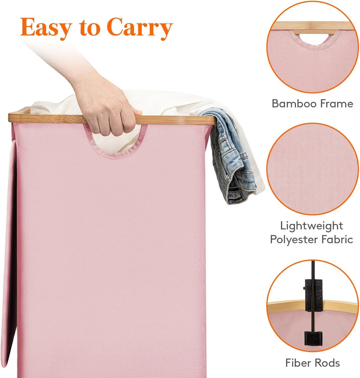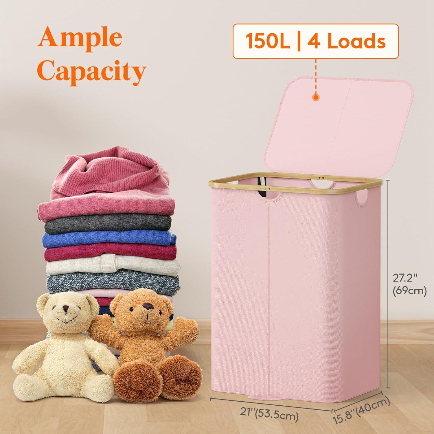 Lifewit 120L Double Laundry Hamper with Lid, Large Dual Laundry Basket Removable Bags, 2 Sections Aesthetic Clothes Hampers for Laundry with Bamboo Handles for Bedroom Bathroom Dorm, Black(Pink)