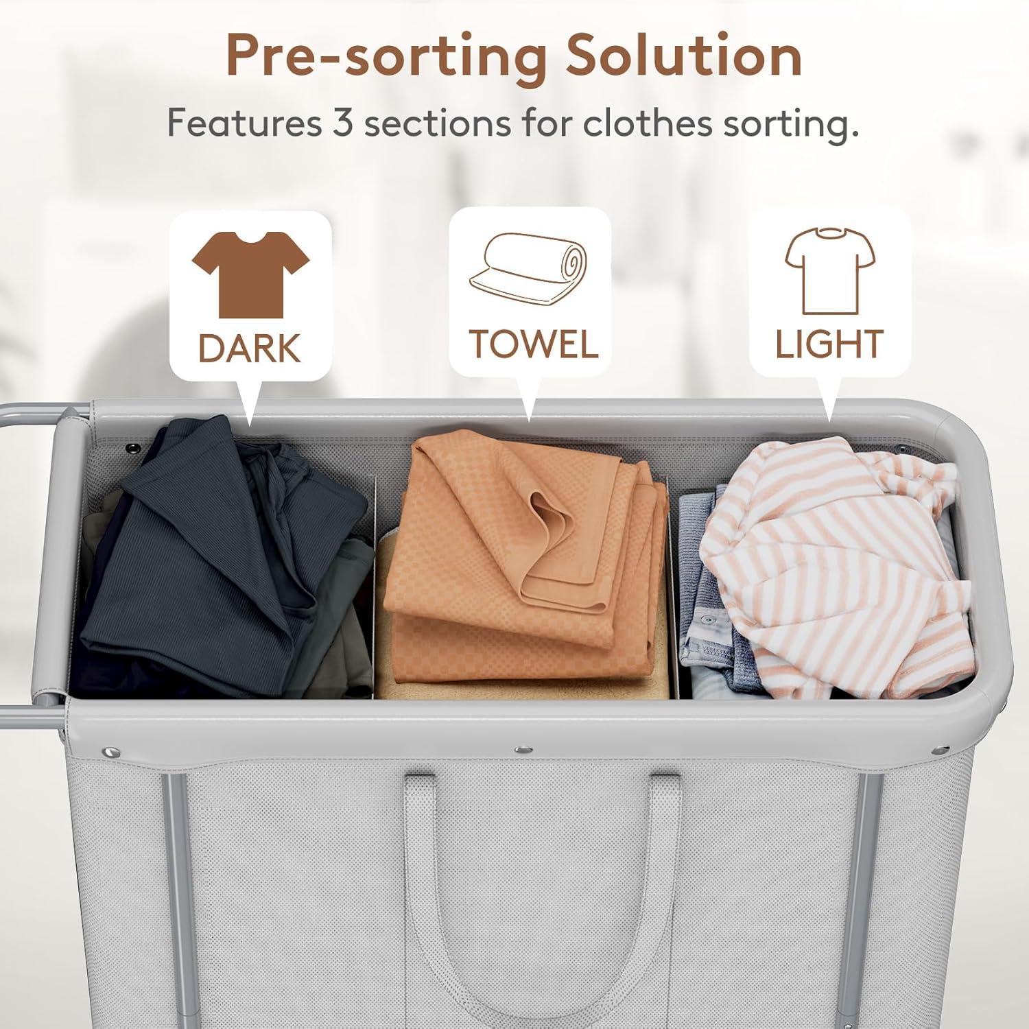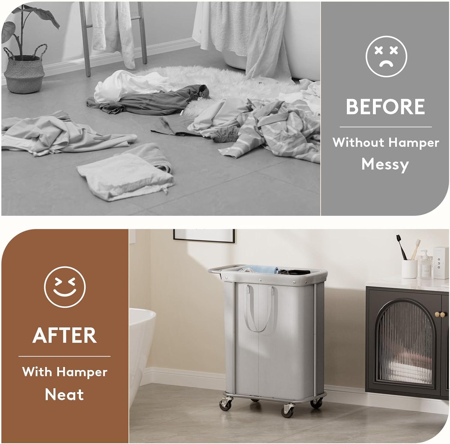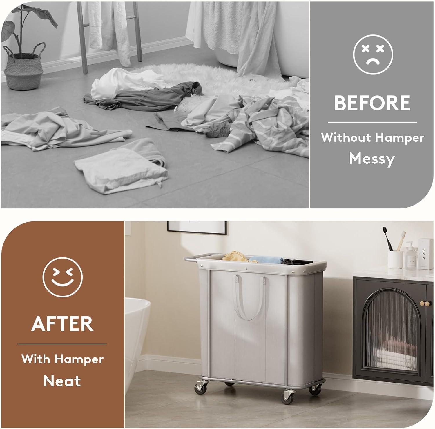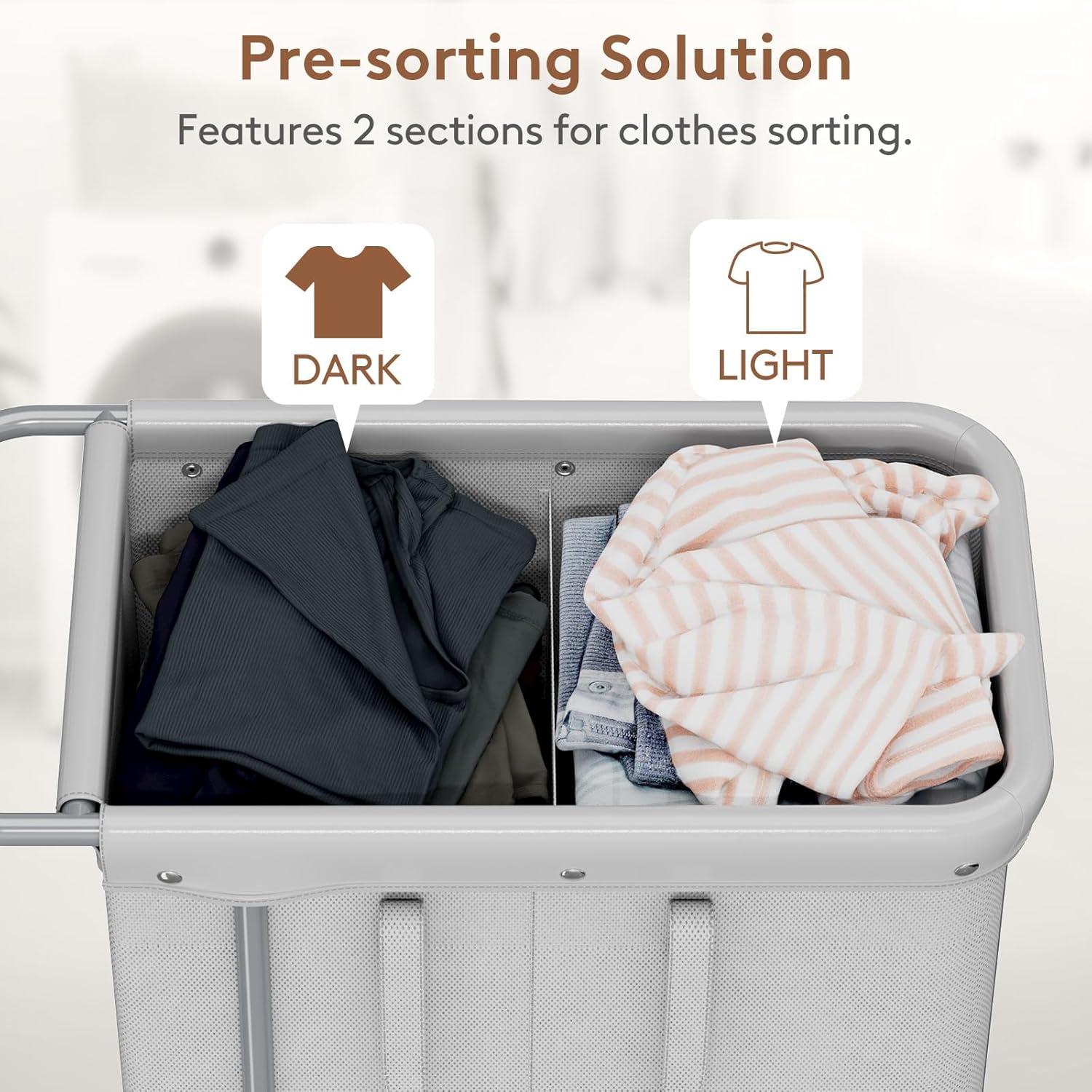 Lifewit 150L Large Laundry Basket with Wheels, Tall 2 Section Laundry Hamper Organizer, Rolling Laundry Cart with Steel Frame & Removable Bag for Luandry Room Bathroom Bedroom, White(Silver Gray)