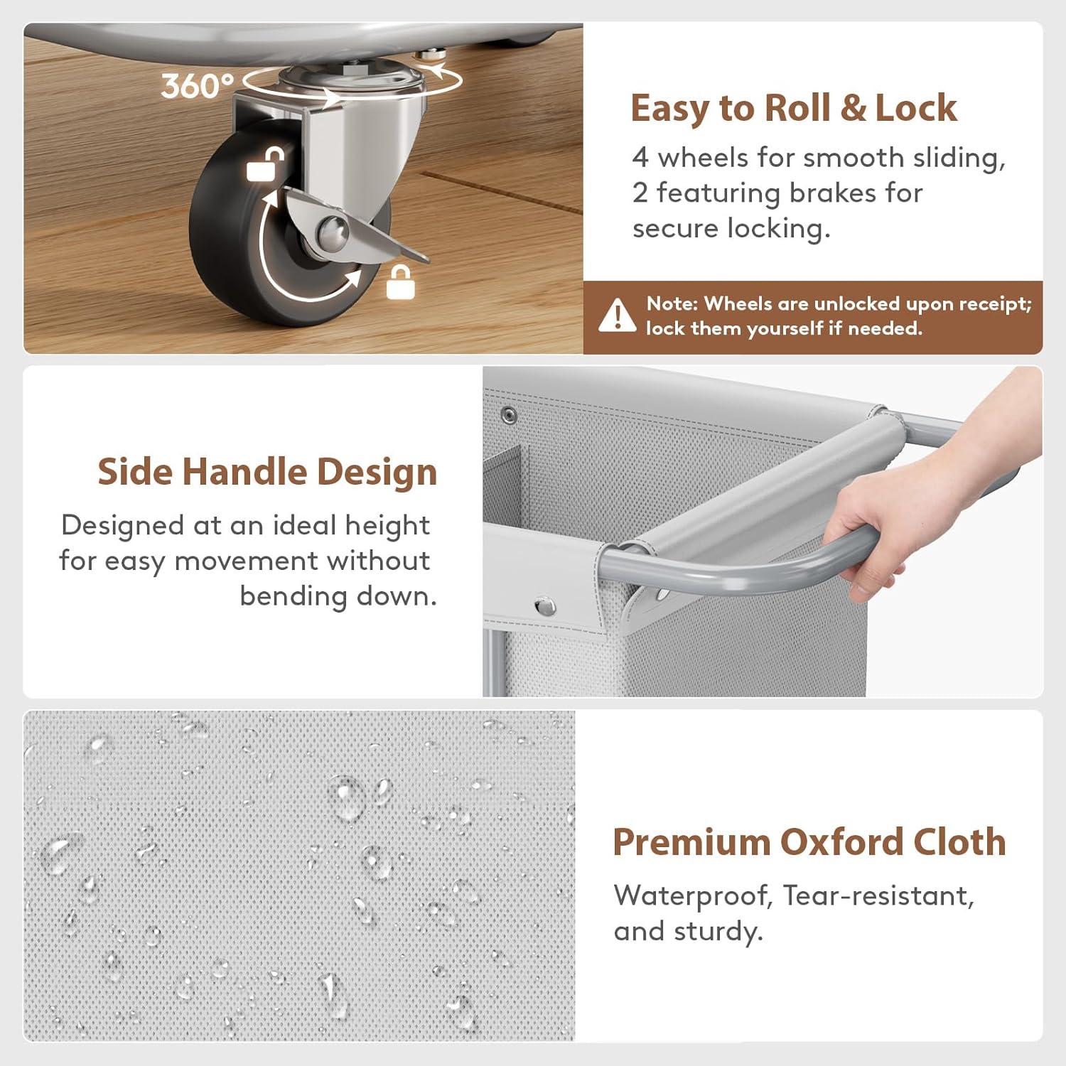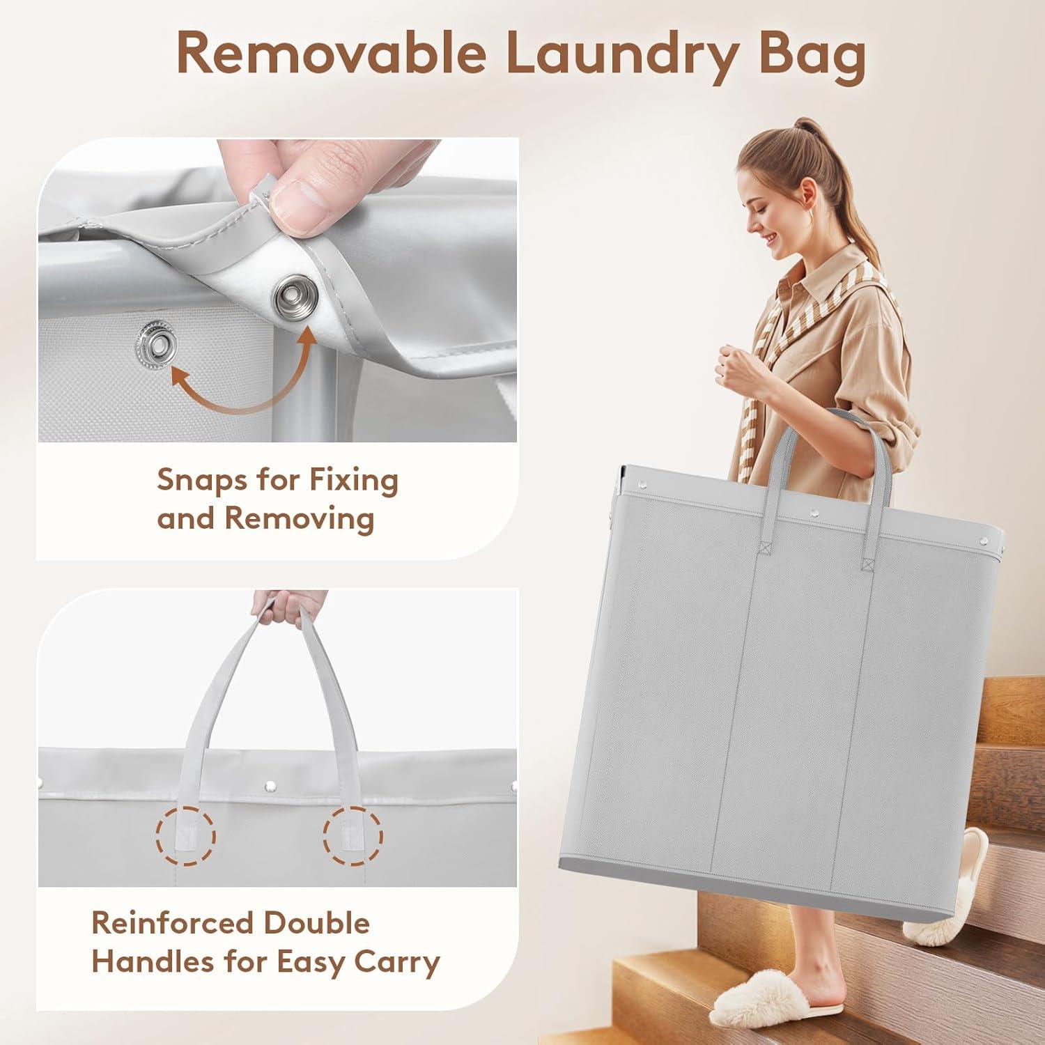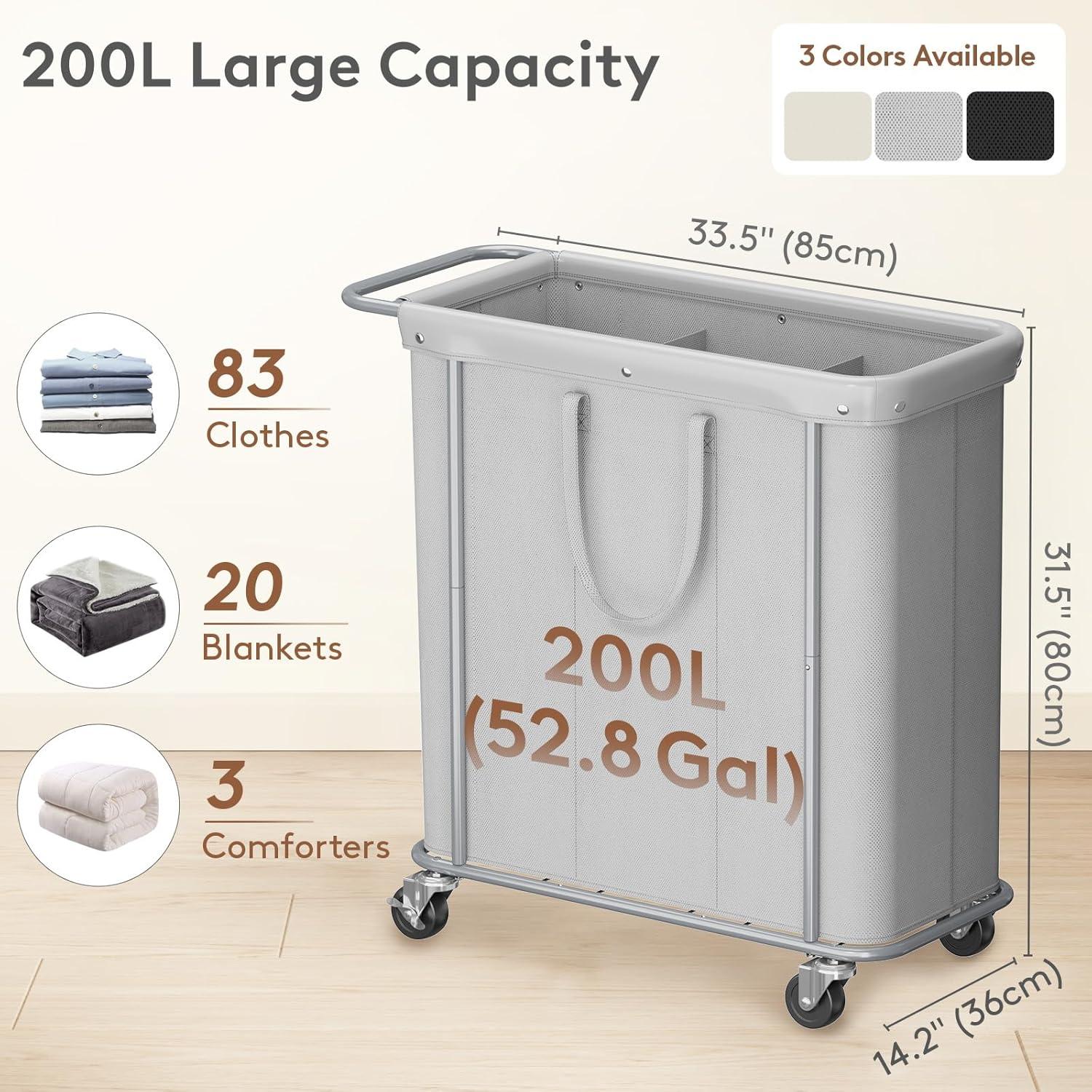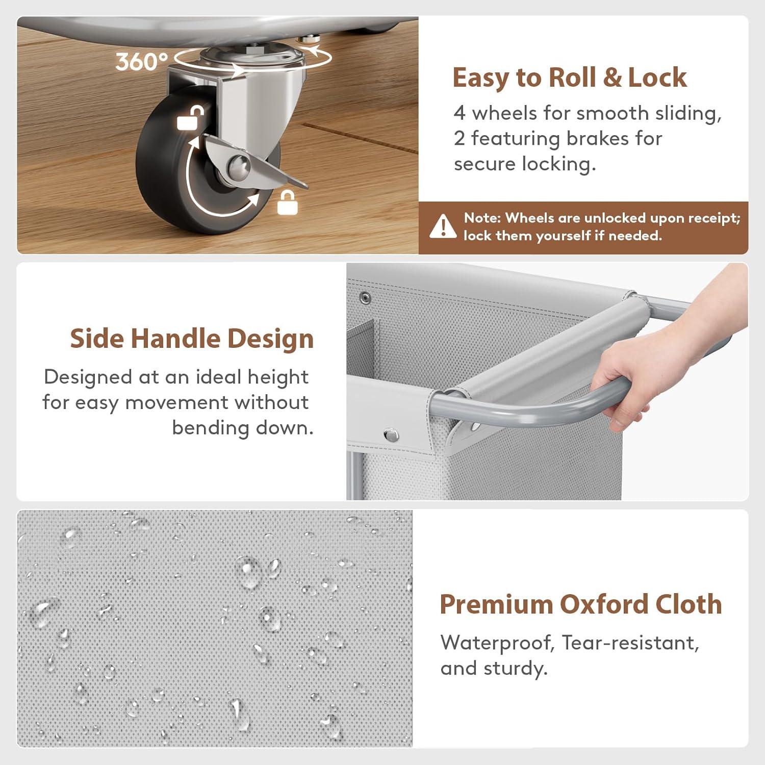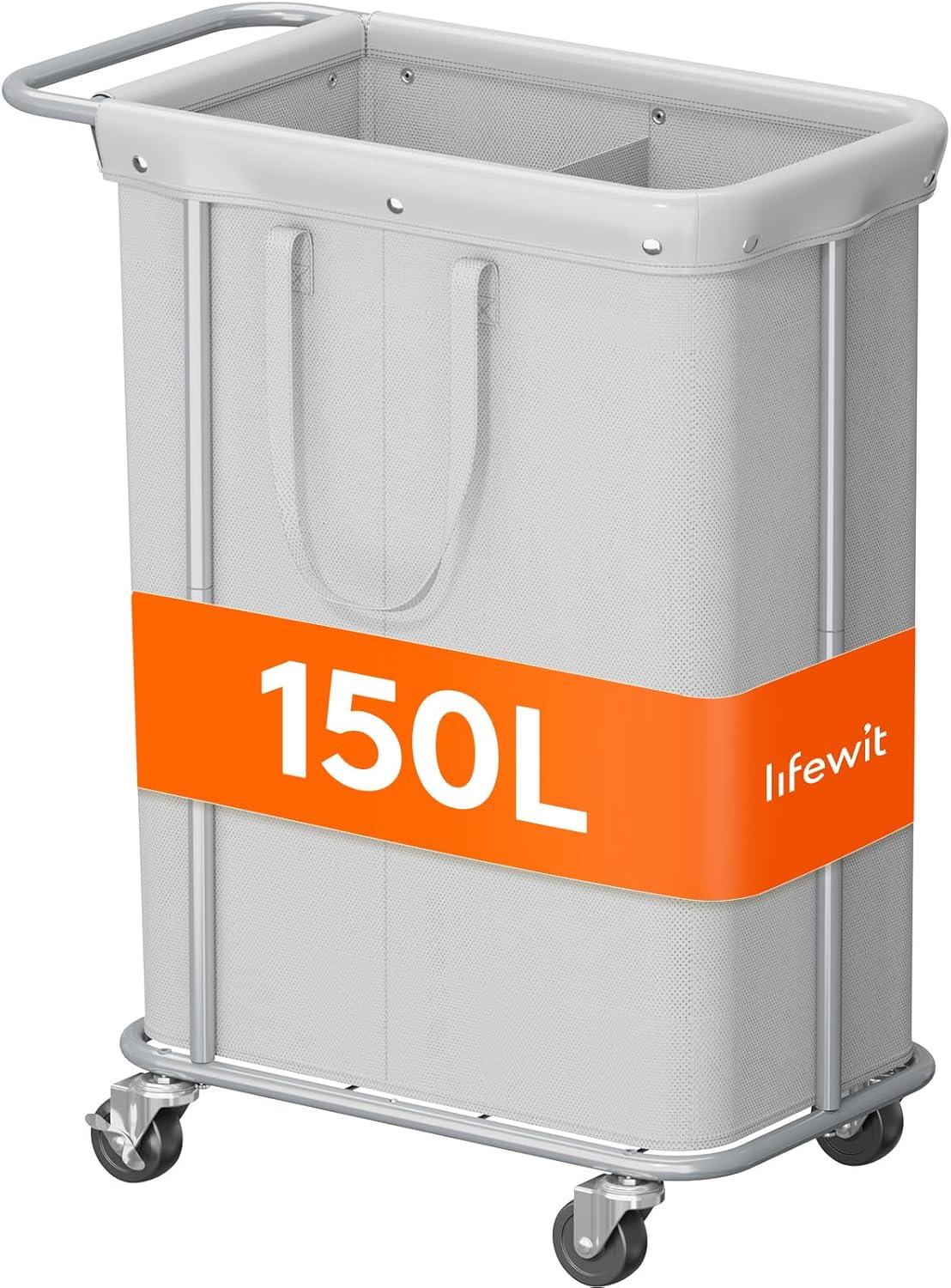 Lifewit 150L Large Laundry Basket with Wheels, Tall 2 Section Laundry Hamper Organizer, Rolling Laundry Cart with Steel Frame & Removable Bag for Luandry Room Bathroom Bedroom, White(Silver Gray)