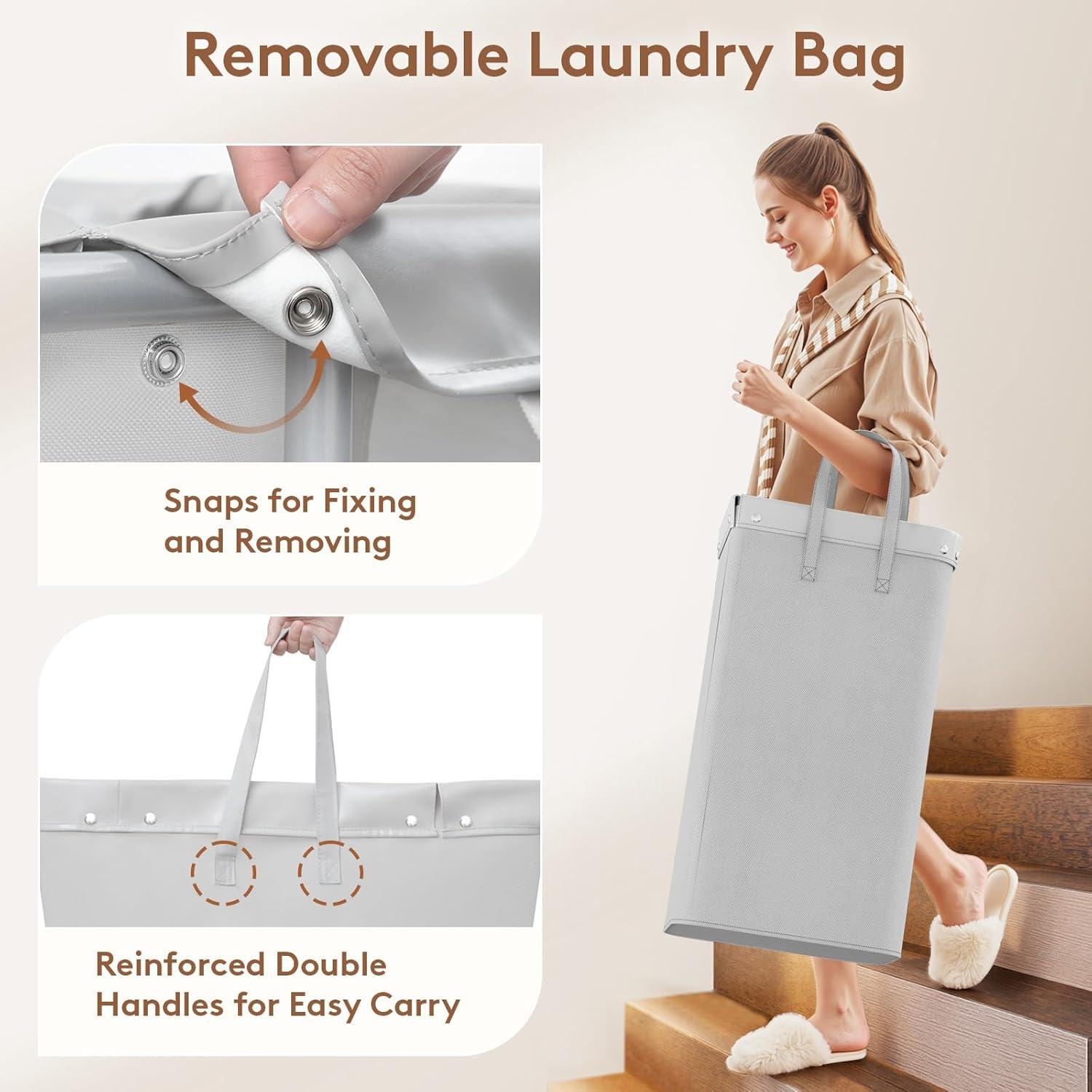 Removable and Fixed Laundry Bag: Simply unsnap to remove. Dual handles make carrying to the laundry room easy. Securely attached with snaps—stays in place. No slips, no hassle
