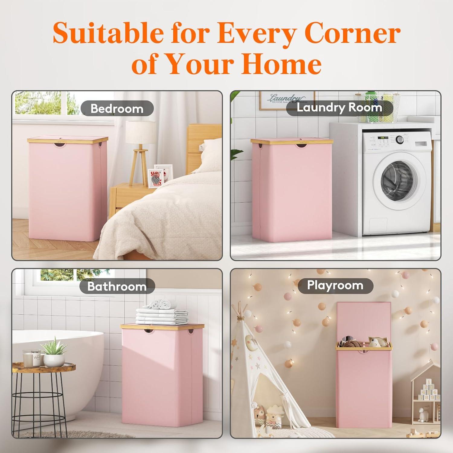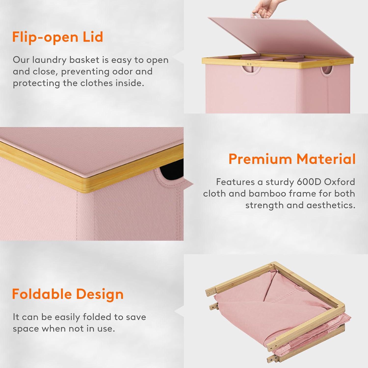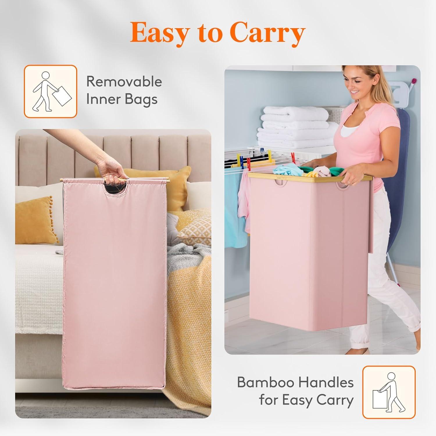 Lifewit 160L Double Laundry Hamper with Lid, Extra Large Bamboo Laundry Basket Dirty Clothes Hamper, 2 Section Laundry Bin Organizer for Laundry Room Bedroom with 2 Removable Liners & Bags, Black(Pink)