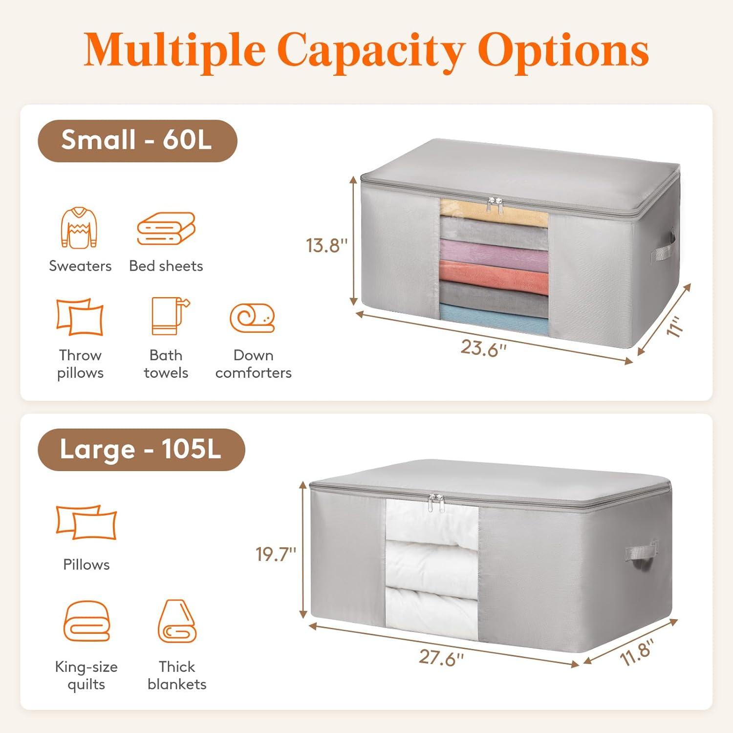 Multiple Capacity Options: Available in two sizes. Small: 23.6″×13.8″×11″ (60L), perfect for sweaters, bed sheets, throw pillows, bath towels, and down comforters. Large: 27.6″×19.7″×11.8″ (105L), ideal for king-size quilts, thick blankets, and pillows