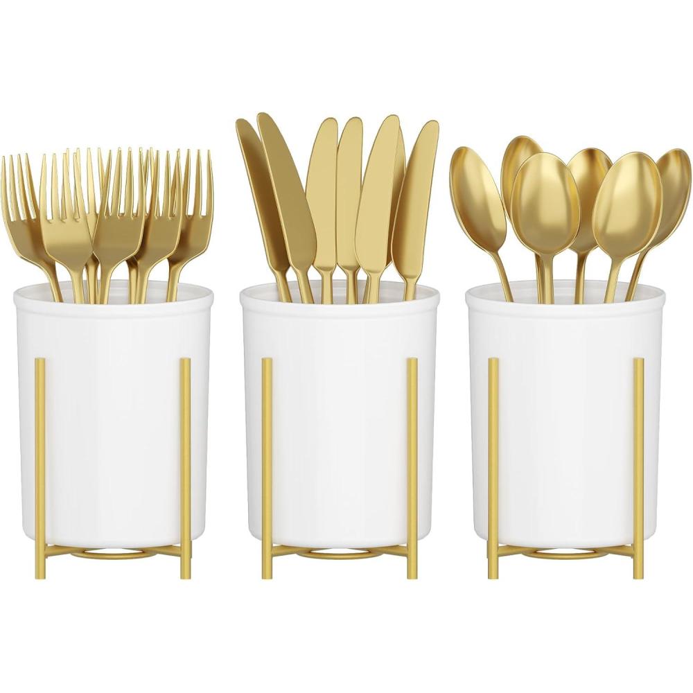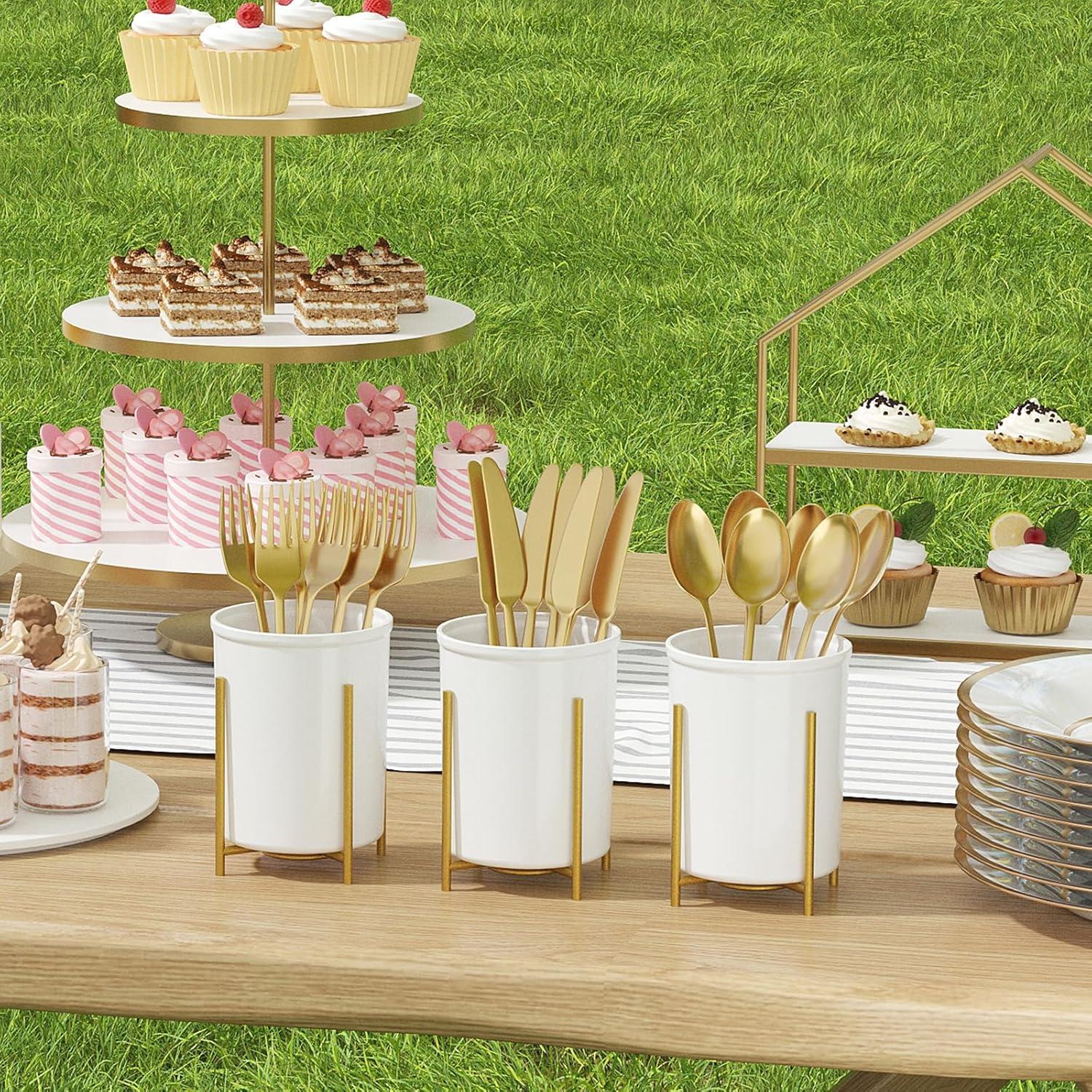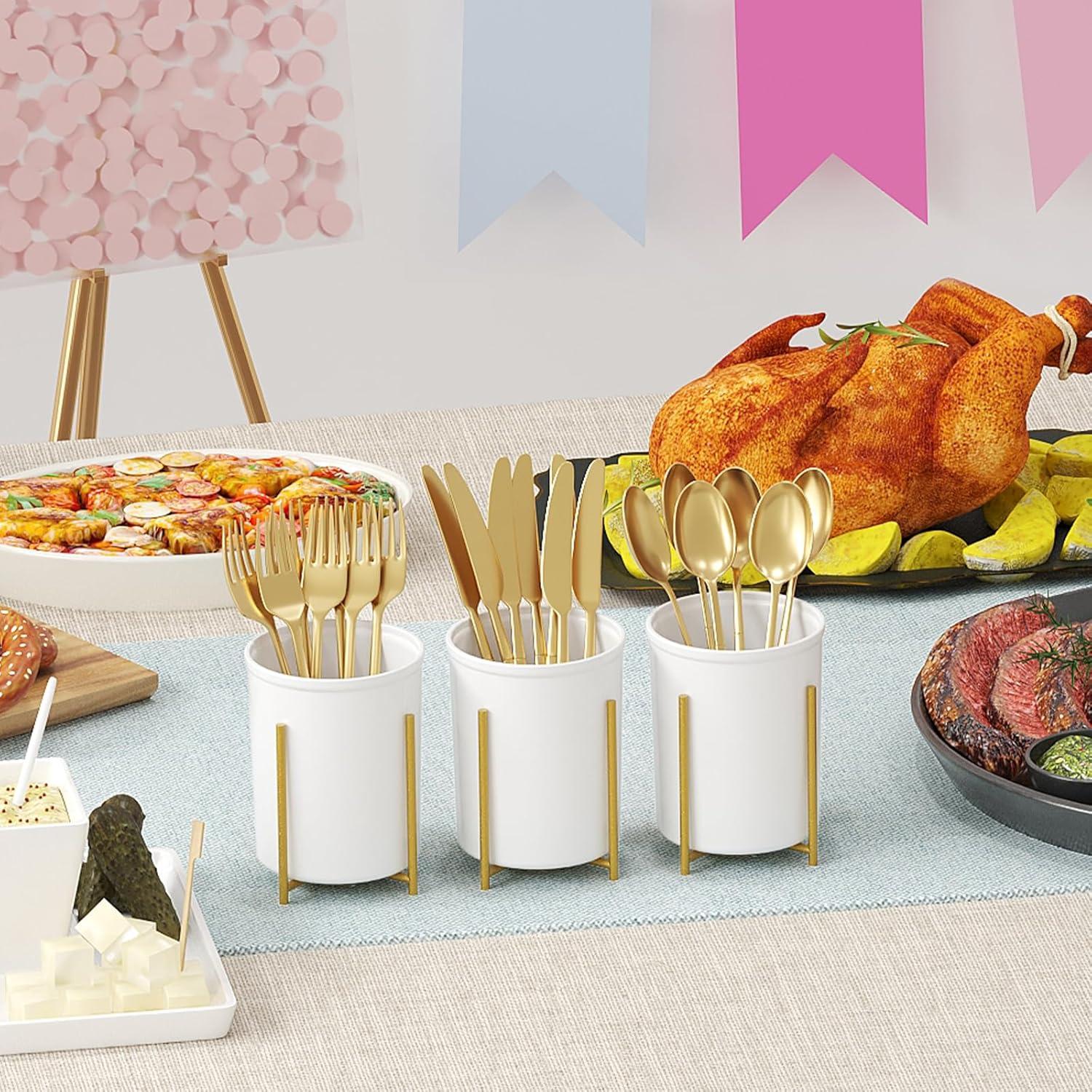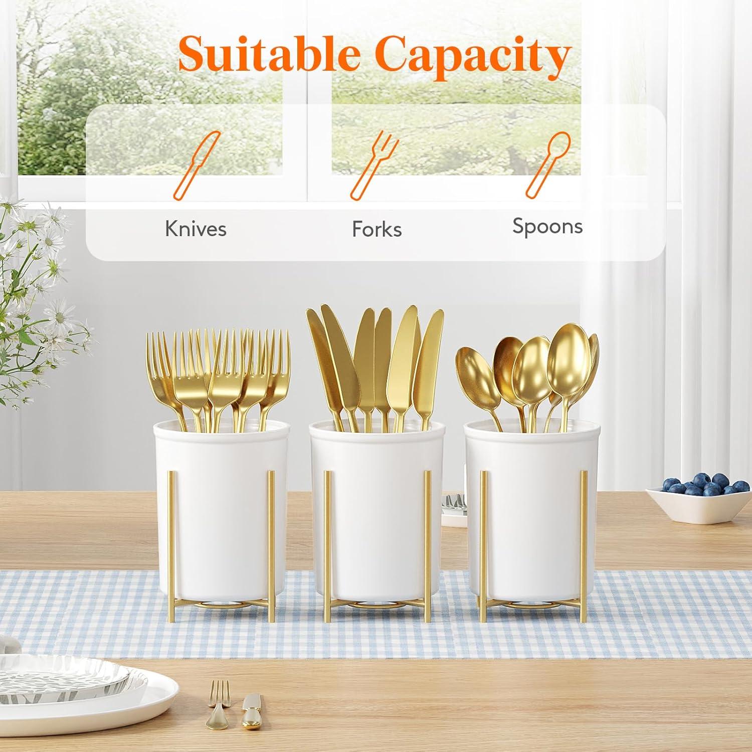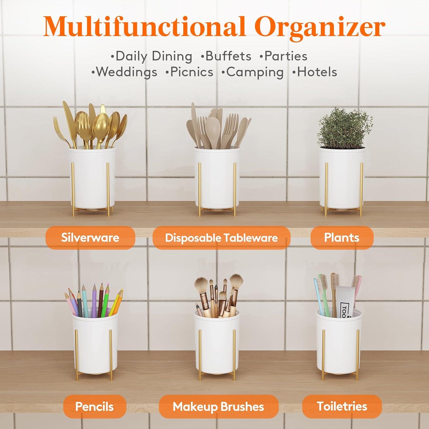 Elegant & Sturdy: Crafted from food-grade PP material with a golden metal stand, this utensil holder offers stability and minimizes tipping when placing or retrieving utensils. Its elegant and stylish appearance makes it a great decoration for kitchens, dining tables, and parties