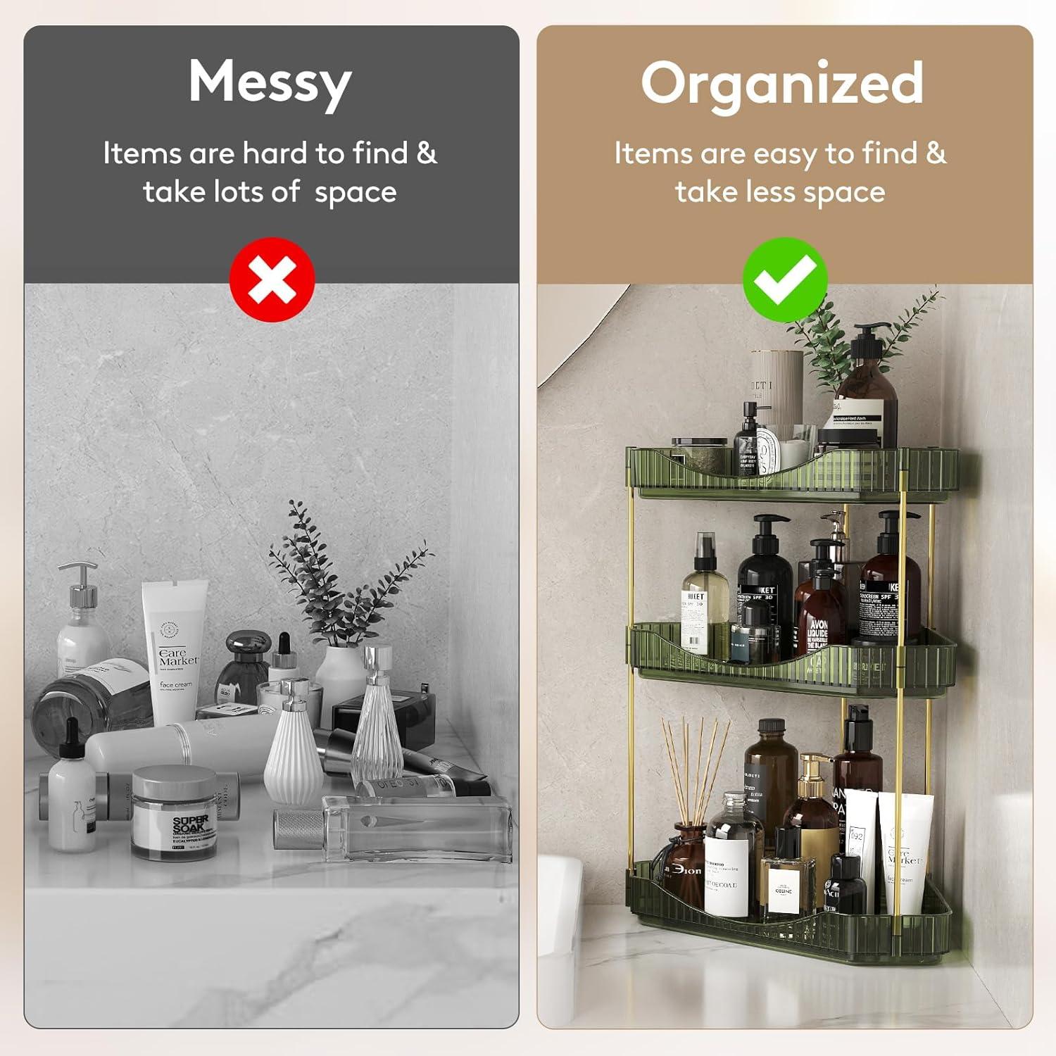 Perfect Use of Corner Space: The 90-degree right angle design fits corner spaces perfectly; corner bathroom counter organizer effectively utilizes the previously unused corner space, making a more organized living area.
