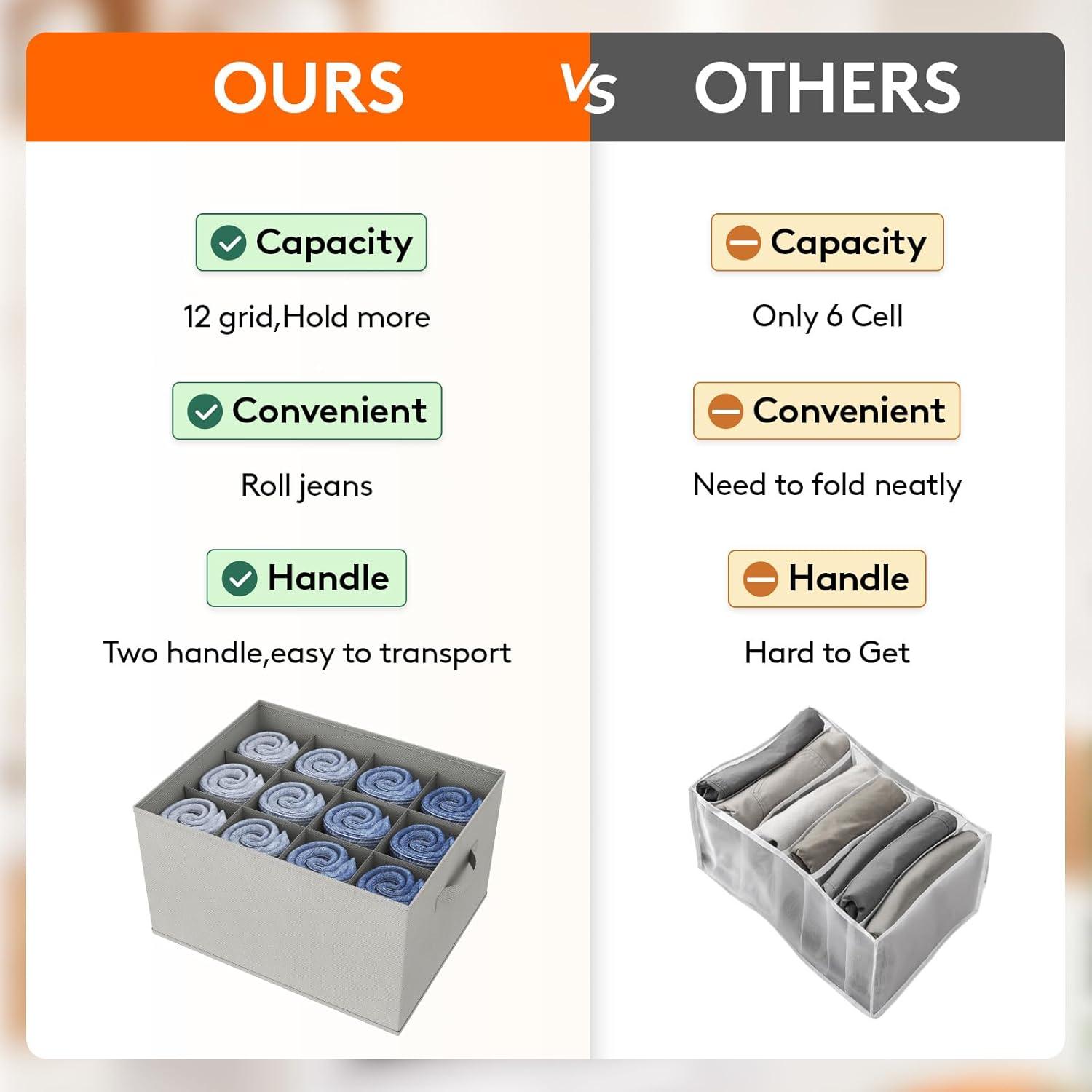 Easy to Access: The jeans organizer has handles on both sides, which streamlines wardrobe organization, allowing for easy retrieval and convenient clothing selection. Whether placed in a closet, a spacious drawer, or tucked under the bed, locating your desired garments is a breeze