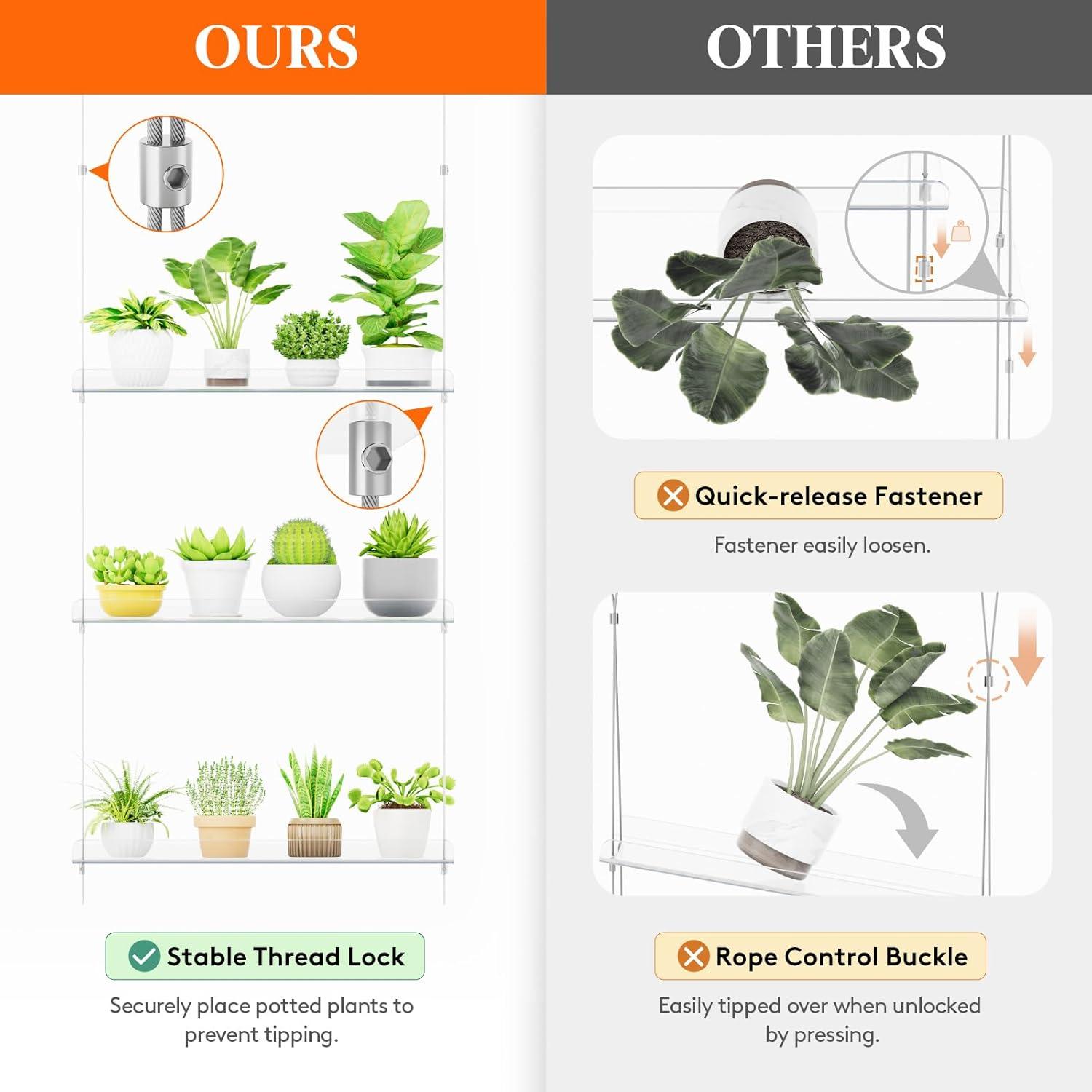 Stable Thread Lock: Utilizing a threaded lock and requiring a hex key for tightening, this hanging plant shelf offers stability and prevents tipping. Made of transparent plastic, promoting optimal indoor growing conditions for your plants