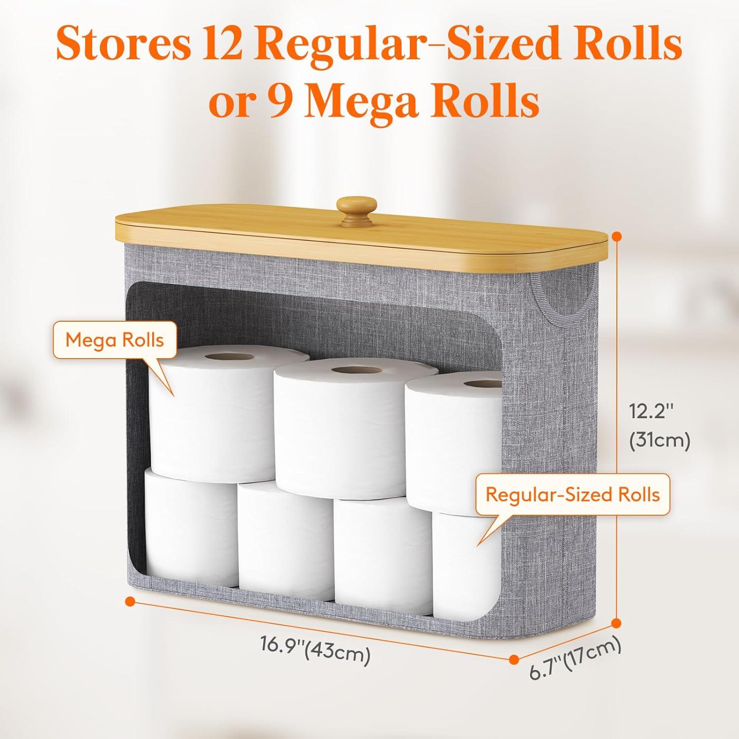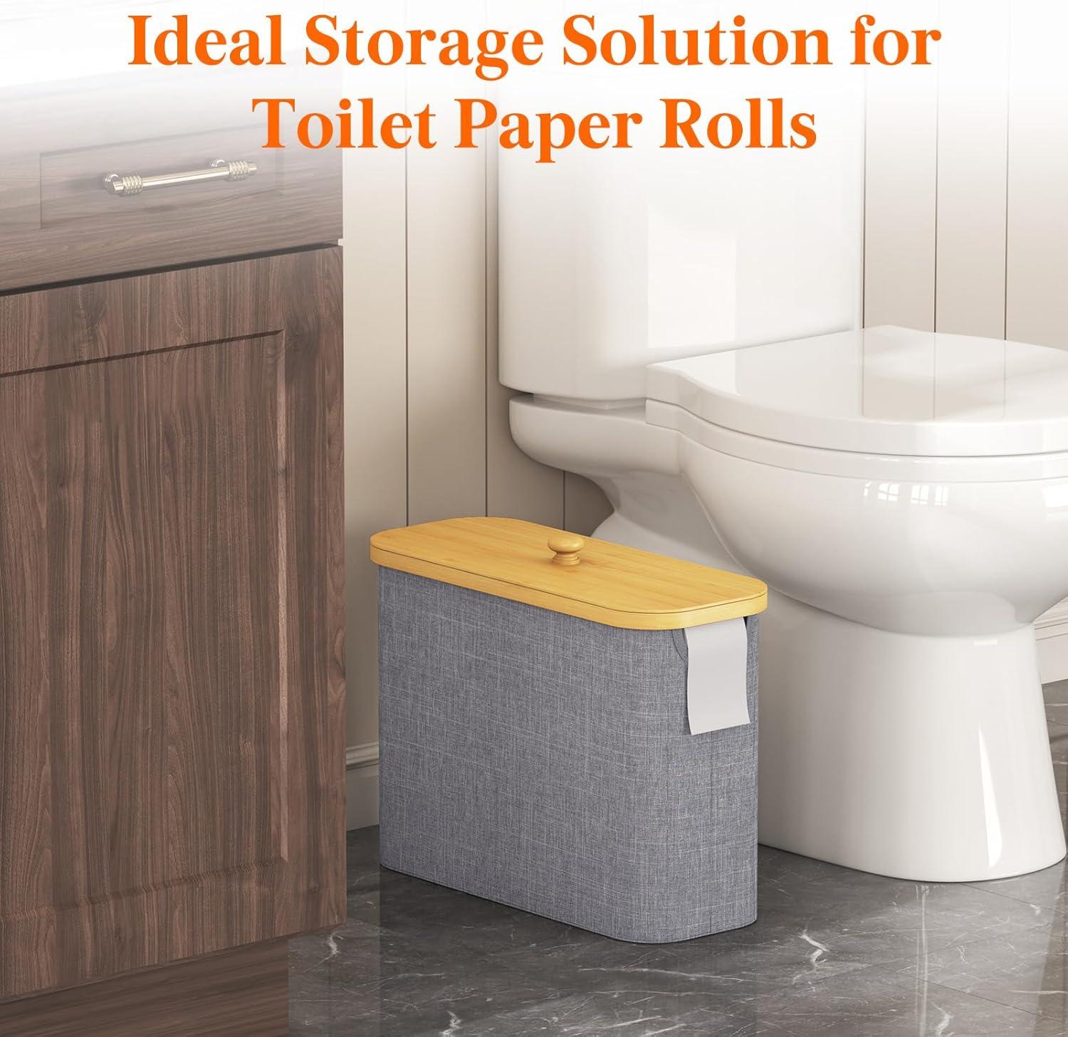 Large Capacity: Measuring 16.9”L x 6.7”W x 16.1”H, the narrow toilet paper storage with lid can hold up to 16 regular rolls or 12 mega rolls. Note: The exact amount of storage depends on the size of your toilet paper roll, the total volume may vary.