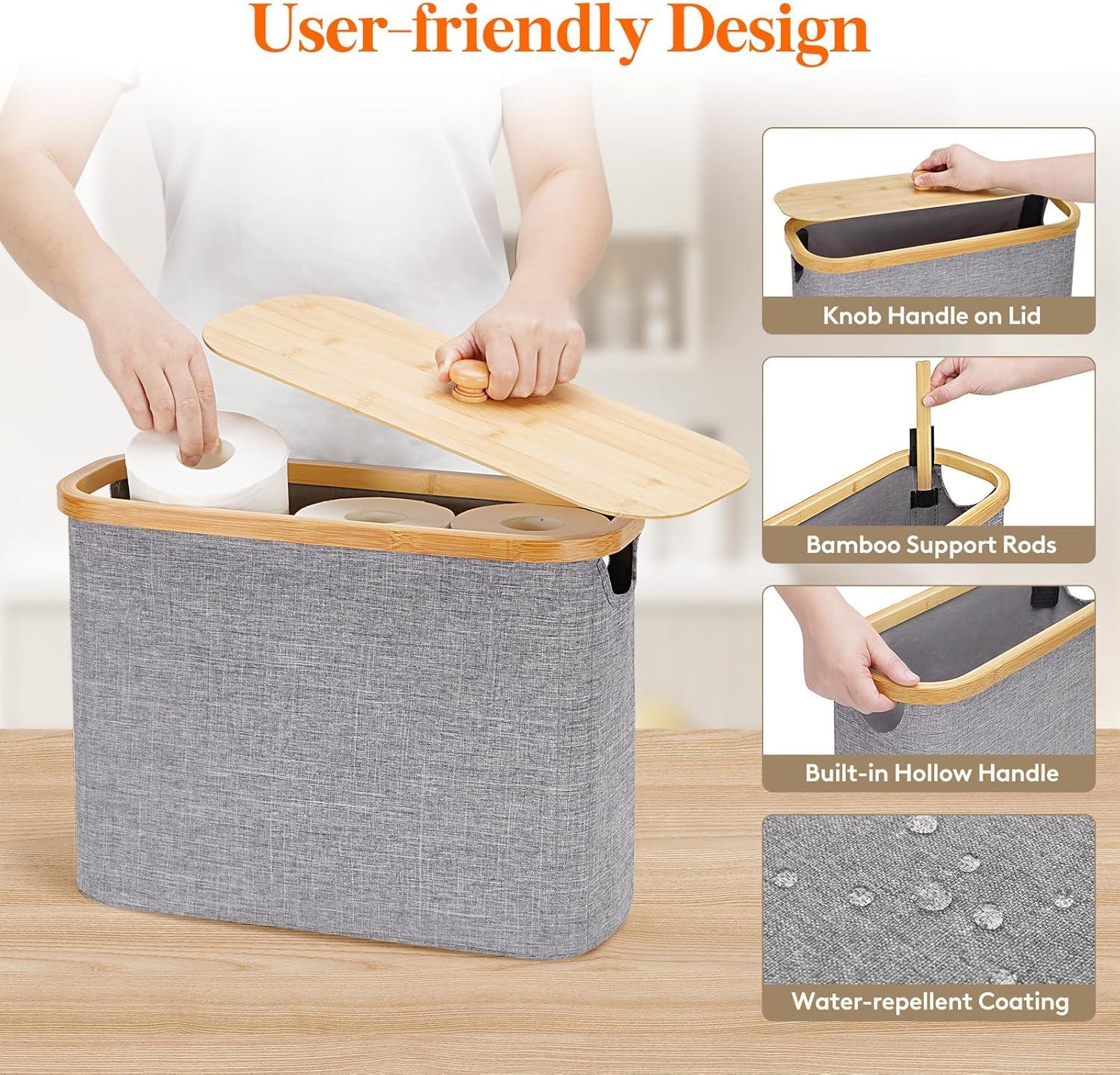 Lifewit 30L Toilet Paper Storage Holder for 12 to 16 Rolls, Free Standing Toilet Paper Basket Stand with Bamboo Lid, Collapsible Fabric Bathroom Organizer Box for Mega Rolls, Large, White(Dark Gray)