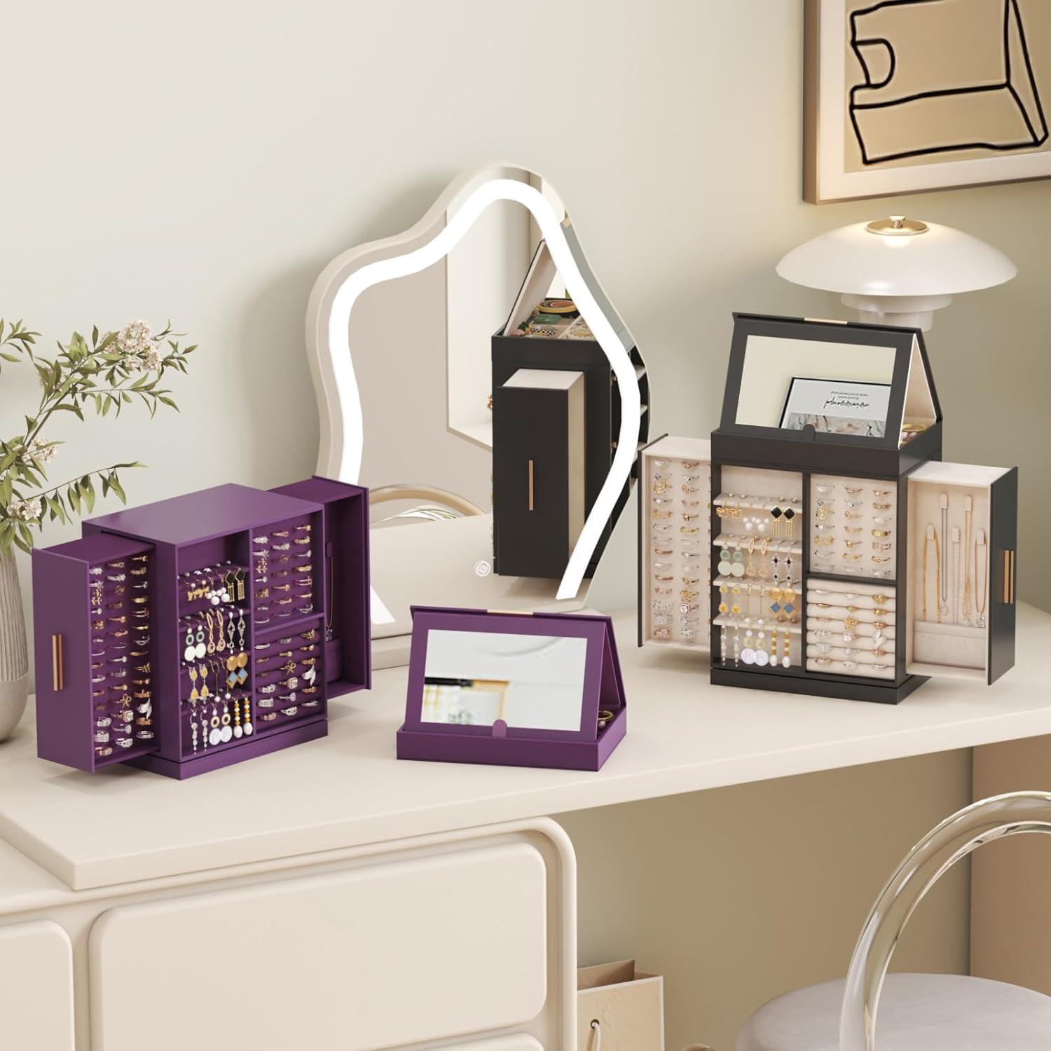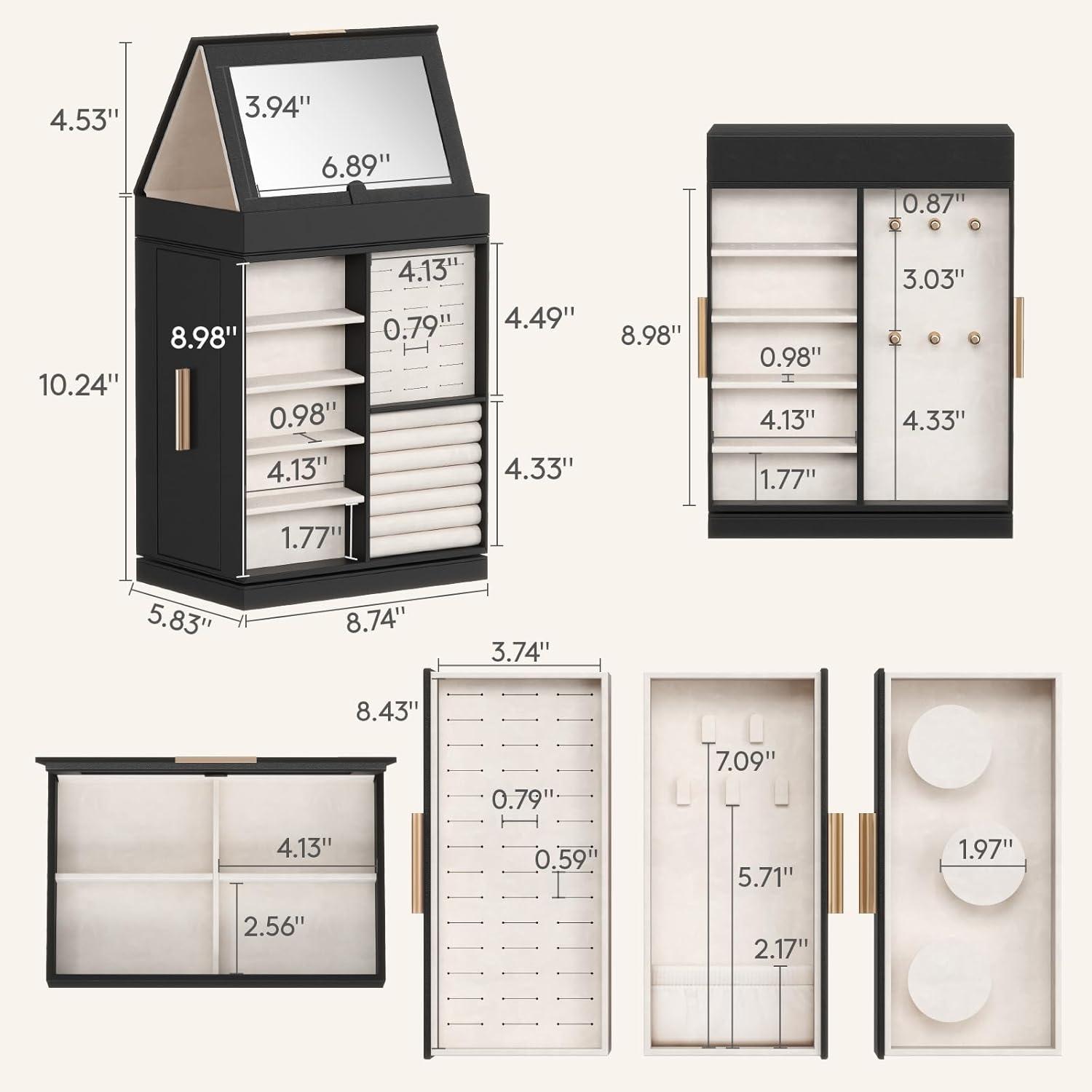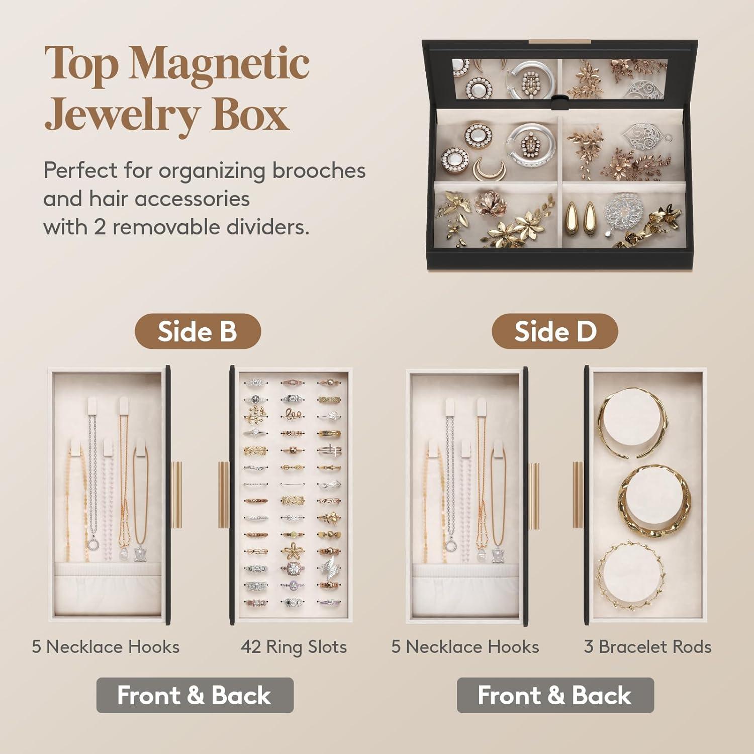 Adjustable Angle Mirror: The top features an additional magnetic jewelry box with a mirror, which can be used individually. The mirror can be easily adjusted to the perfect angle. Achieve your best look with effortless jewelry application