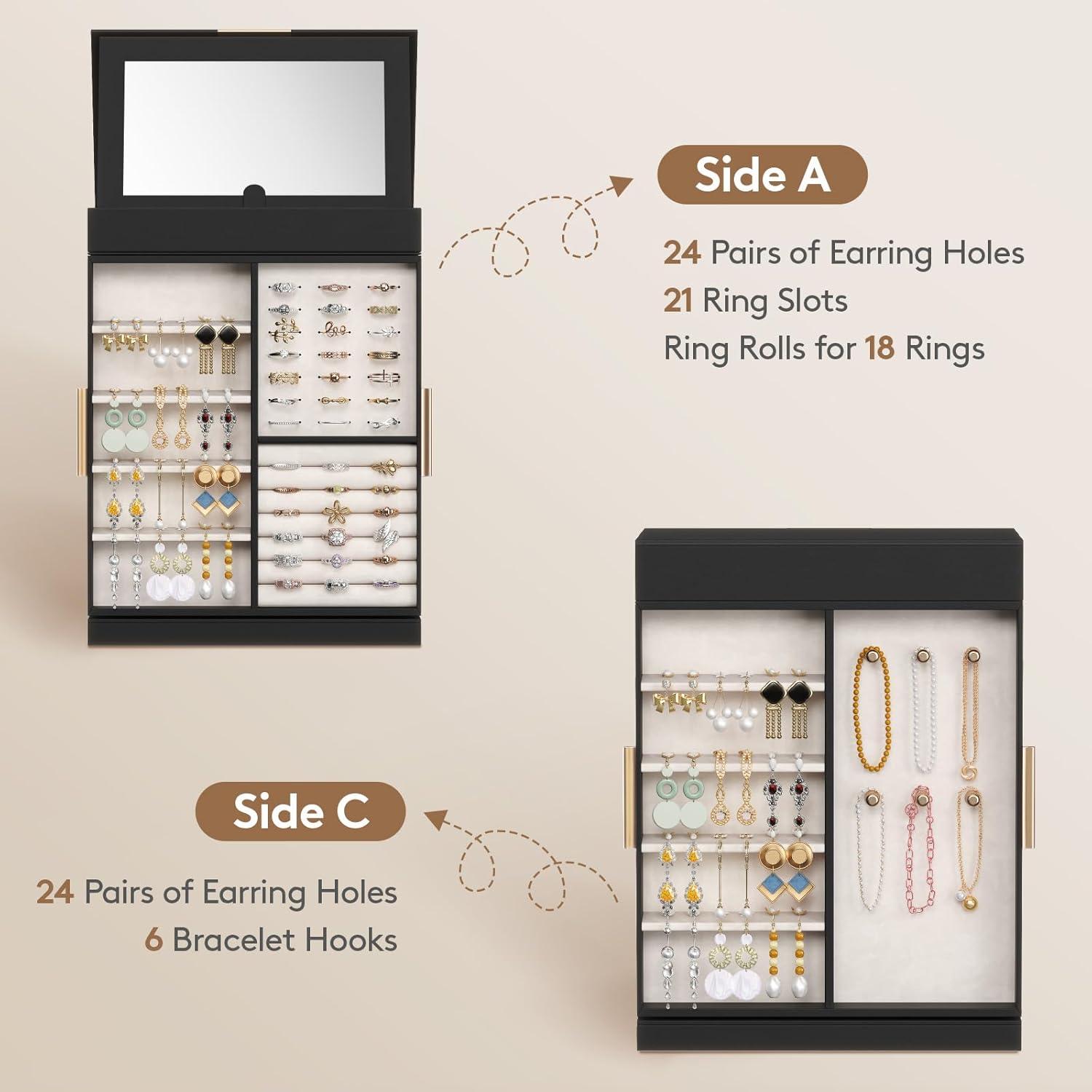 Spacious & Versatile: Measuring 8.7 x 5.6 x 11.2 inches, this jewelry holder offers 81 ring slots, 48 earring holes, 10 necklace hooks, 6 bracelet hooks, 3 bracelet or watch display rods, and four compartments for brooches, hair accessories, or watches