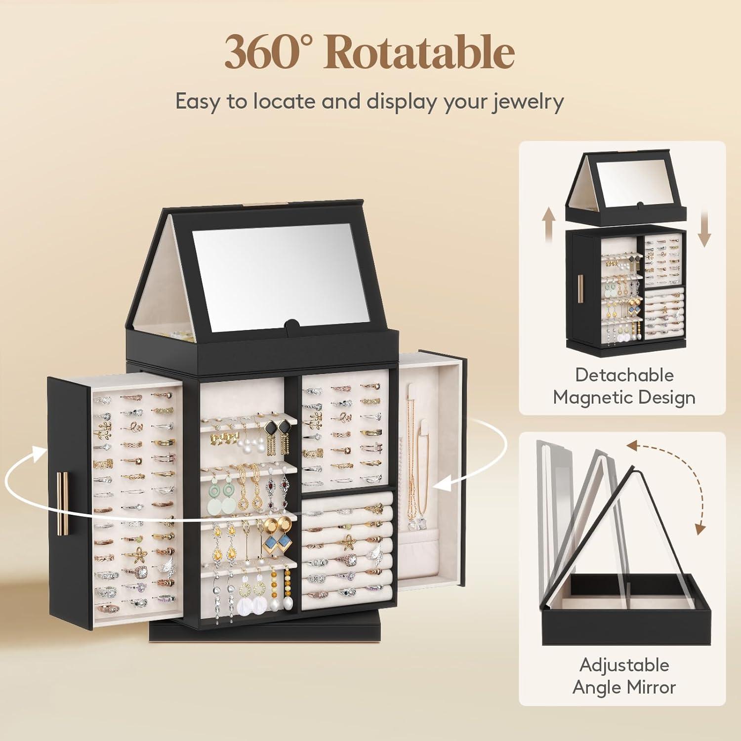 Lifewit 360° Rotating Jewelry Box, Top Magnetic Box wth Mirror, 2 Sides Plus 2 Large Drawers, Jewelry Organizer and Storage Case for Ring Necklace Earring Bracelet, Gift Idea, Creamy White(Inky Black)