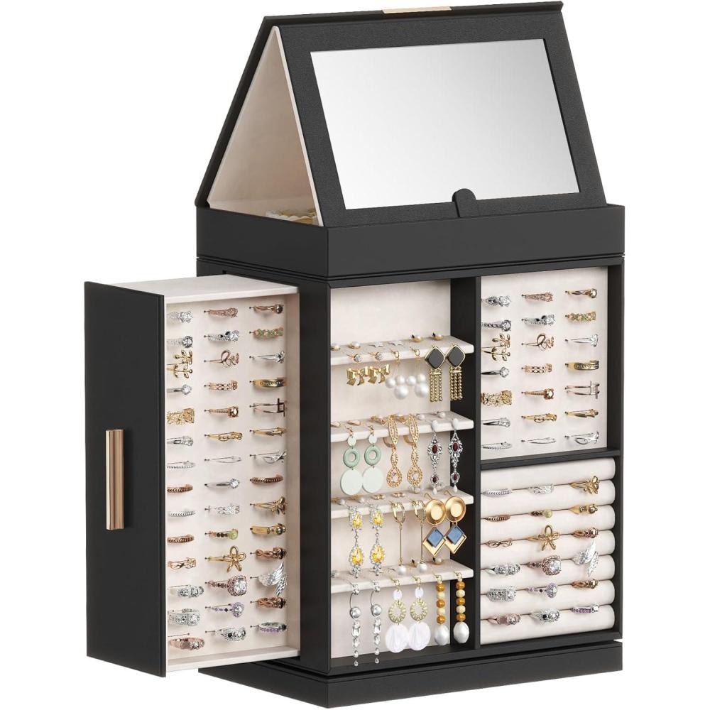 imageLifewit 360 Rotating Jewelry Box Top Magnetic Box wth Mirror 2 Sides Plus 2 Large Drawers Jewelry Organizer and Storage Case for Ring Necklace Earring Bracelet Gift Idea Creamy WhiteInky Black