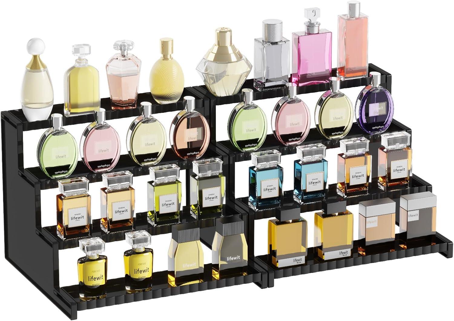 Perfume Organizer Choice: This 4-tier perfume stand with decorative fences effortlessly organizes and showcases your perfumes, elevating the aesthetics of your vanity while utilizing your dressing table space and making them easily accessible