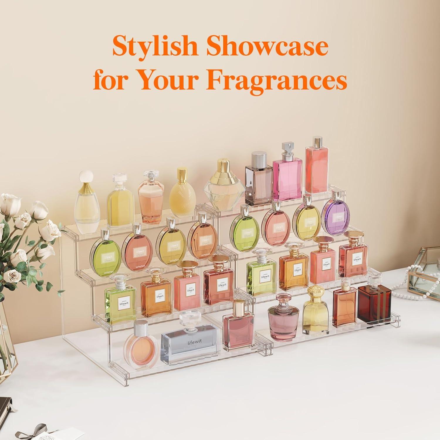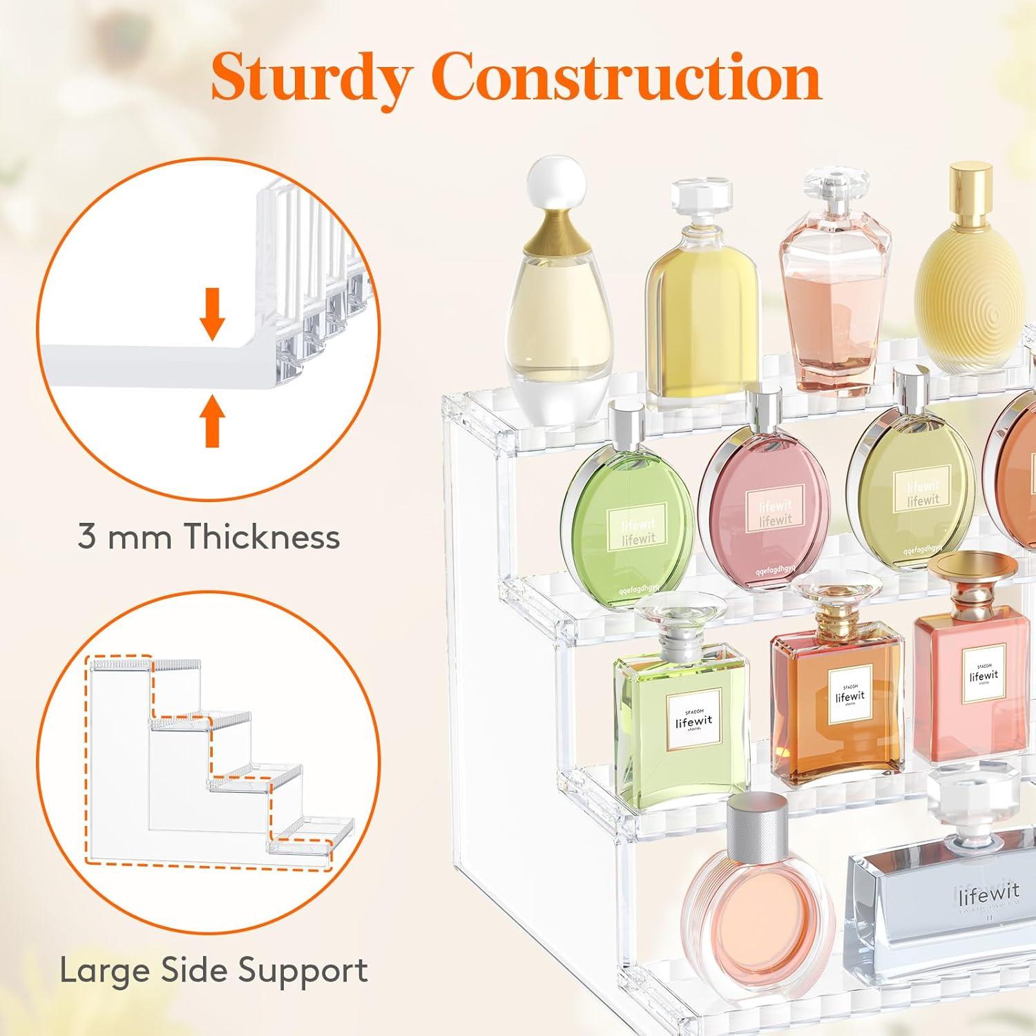 Perfume Organizer Choice: This 4-tier perfume stand with decorative fences effortlessly organizes and showcases your perfumes, elevating the aesthetics of your vanity while utilizing your dressing table space and making them easily accessible