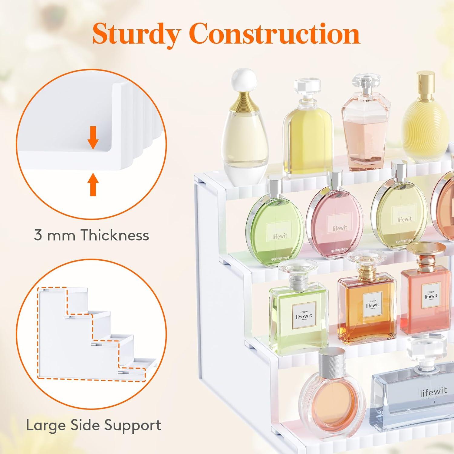 Perfume Organizer Choice: This 4-tier perfume stand with decorative fences effortlessly organizes and showcases your perfumes, elevating the aesthetics of your vanity while utilizing your dressing table space and making them easily accessible
