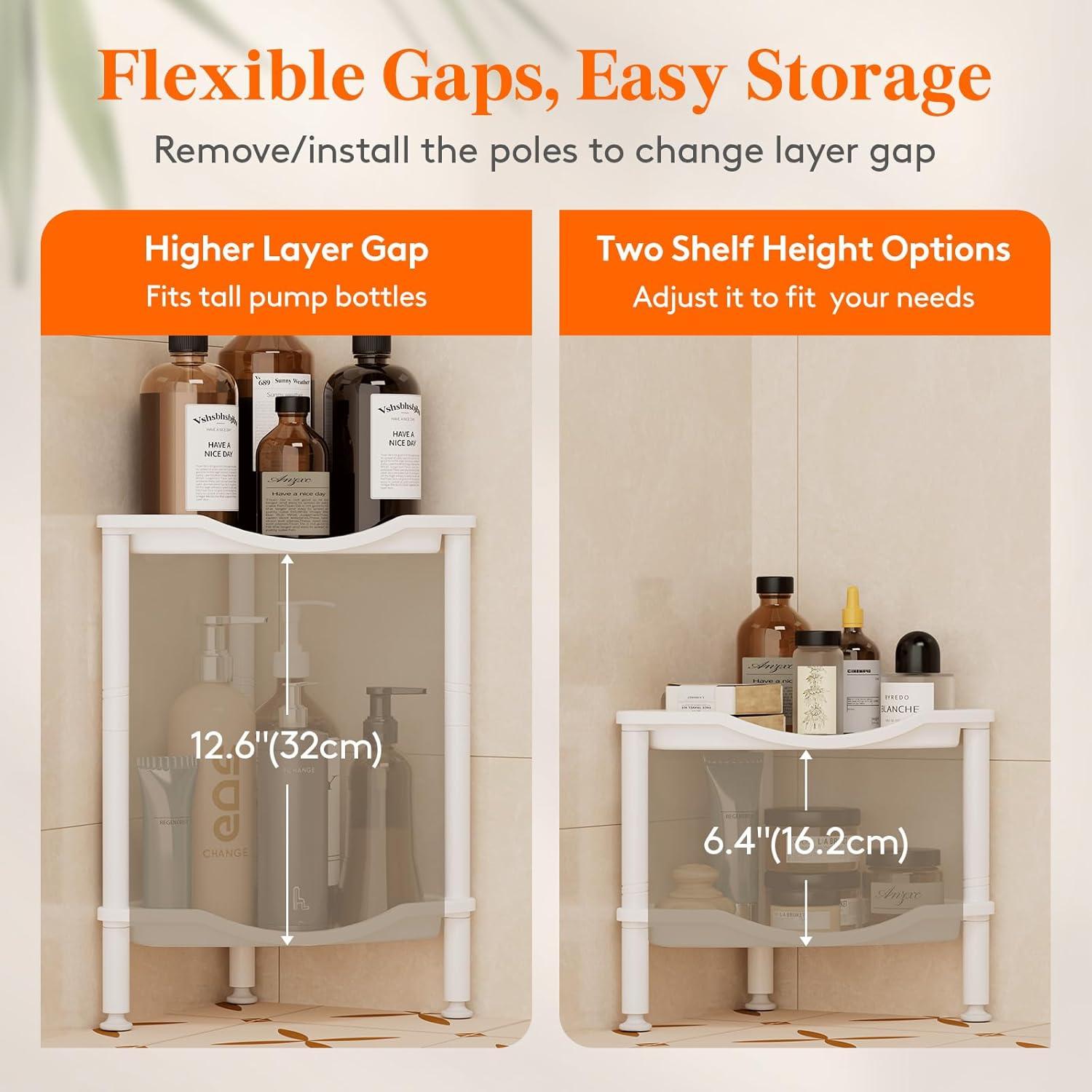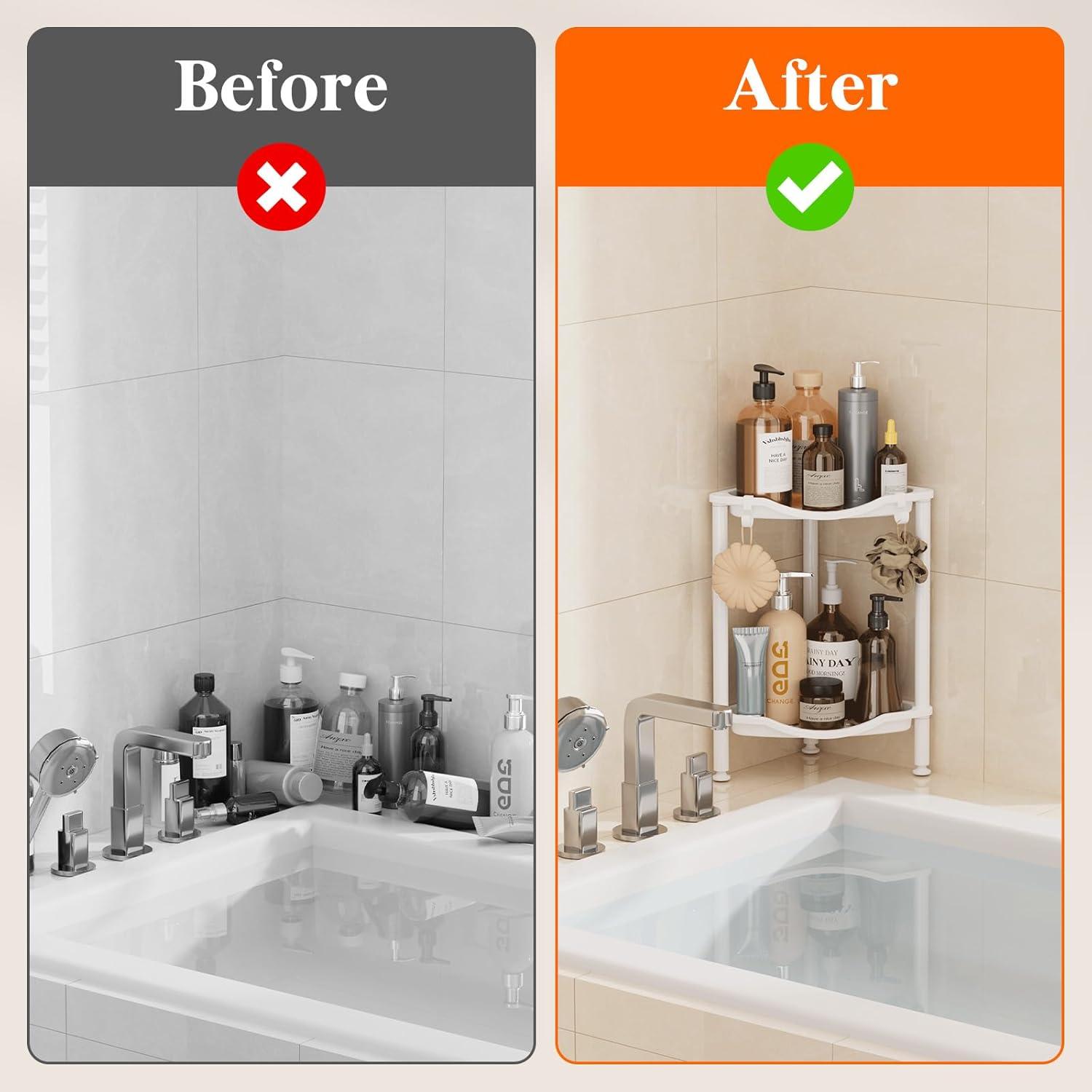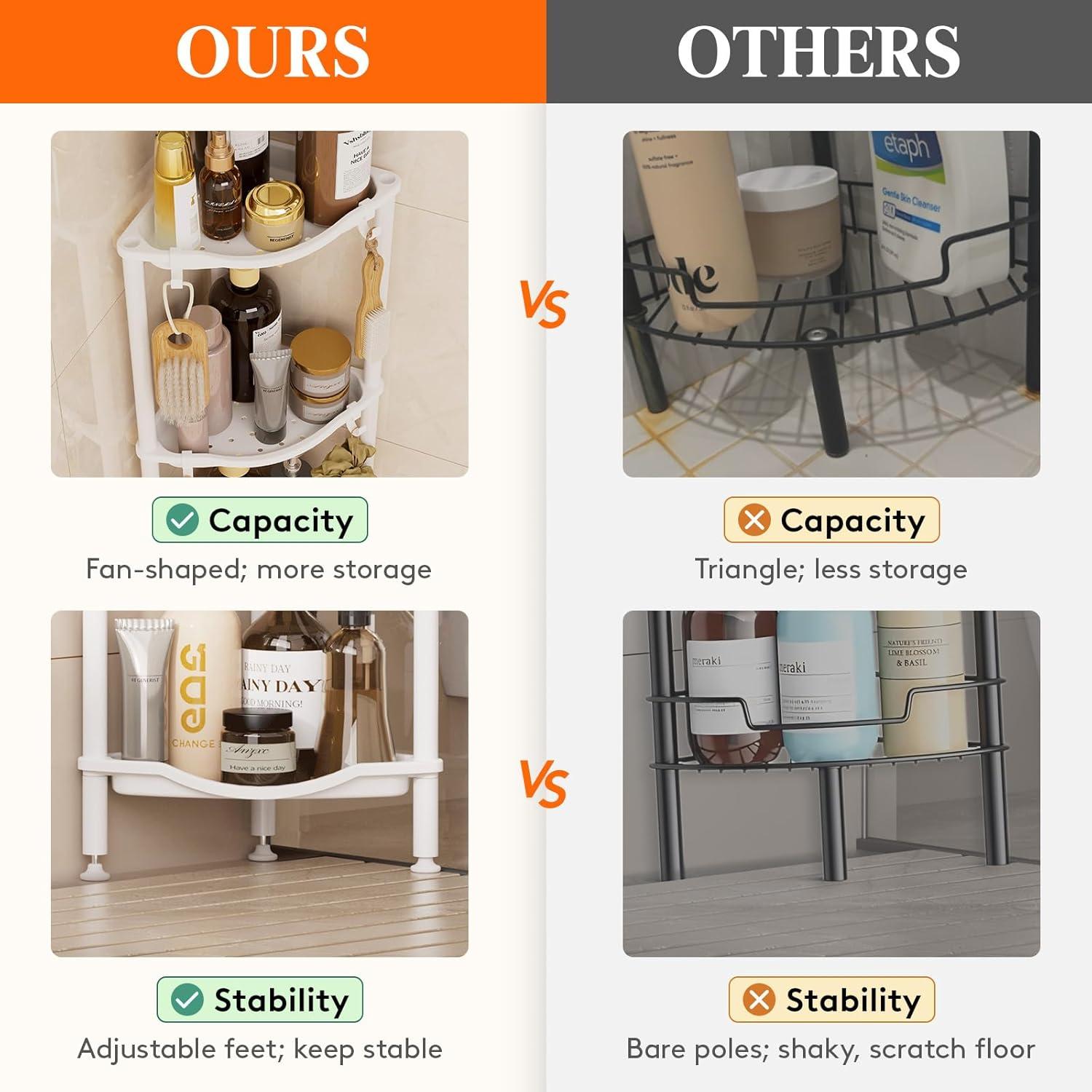 Perfect Use of Corner Space: The 90-degree right angle design fits corner spaces perfectly, effectively utilizes the previously unused corner space; the fan-shaped tray provides larger storage space to easily accommodate all toiletries