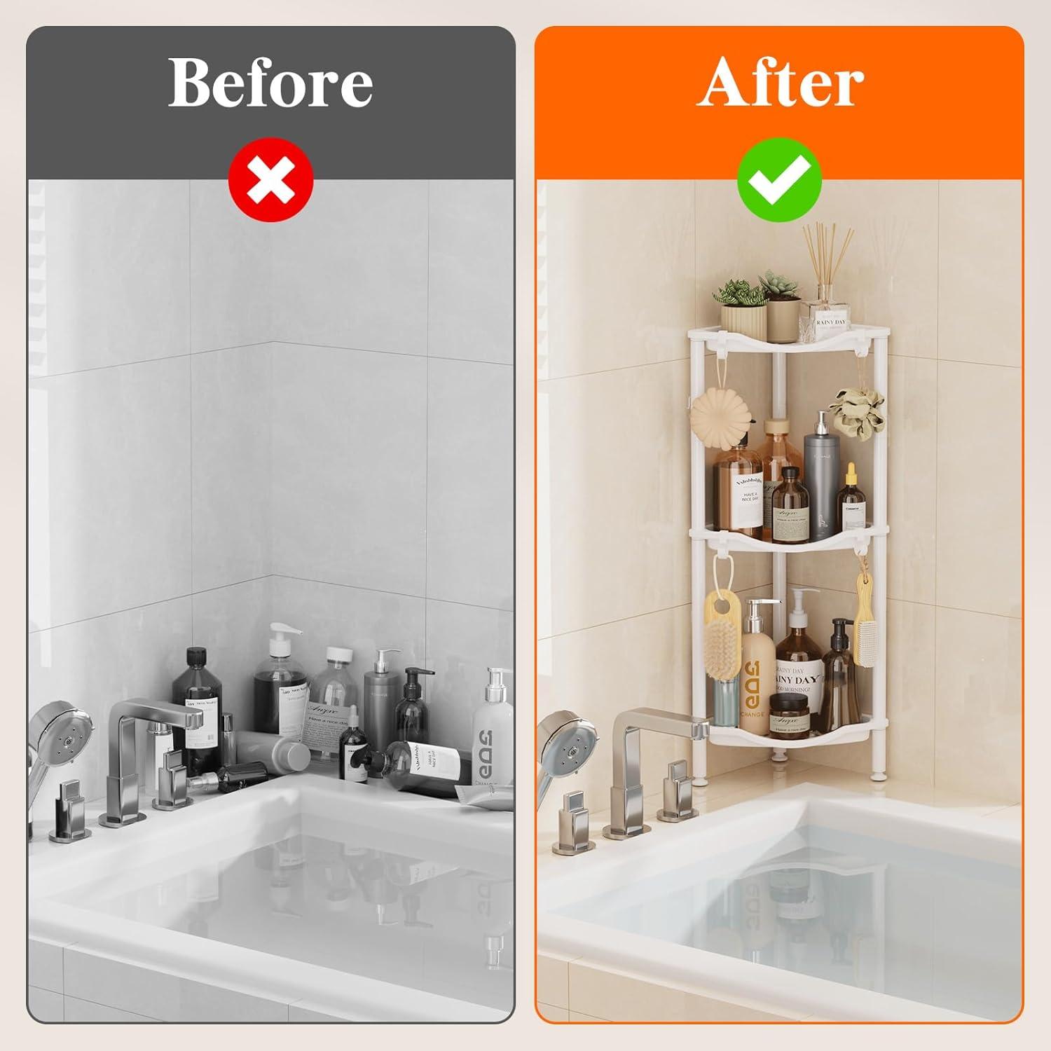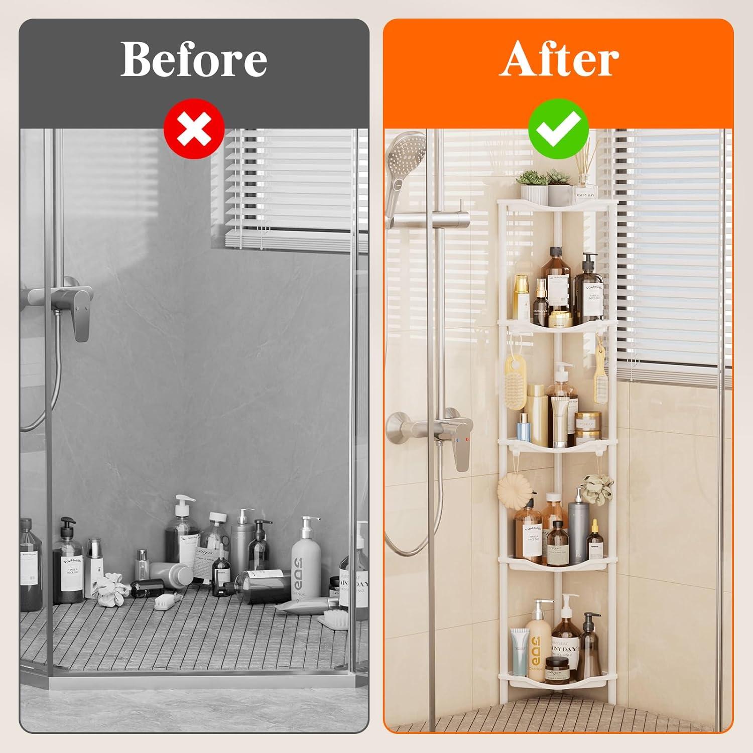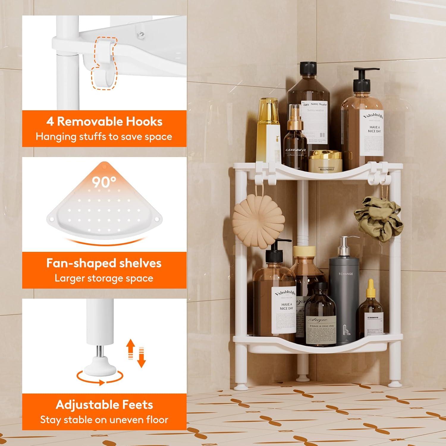 Adjustable Shelf Height: With a adjustable shelf height design, you can easily adjust the spacing to fit all your shower essentials, from tall to short items, without any worries; plus, it features four removable hooks for hanging razors, sponges, and brushes, saving your space