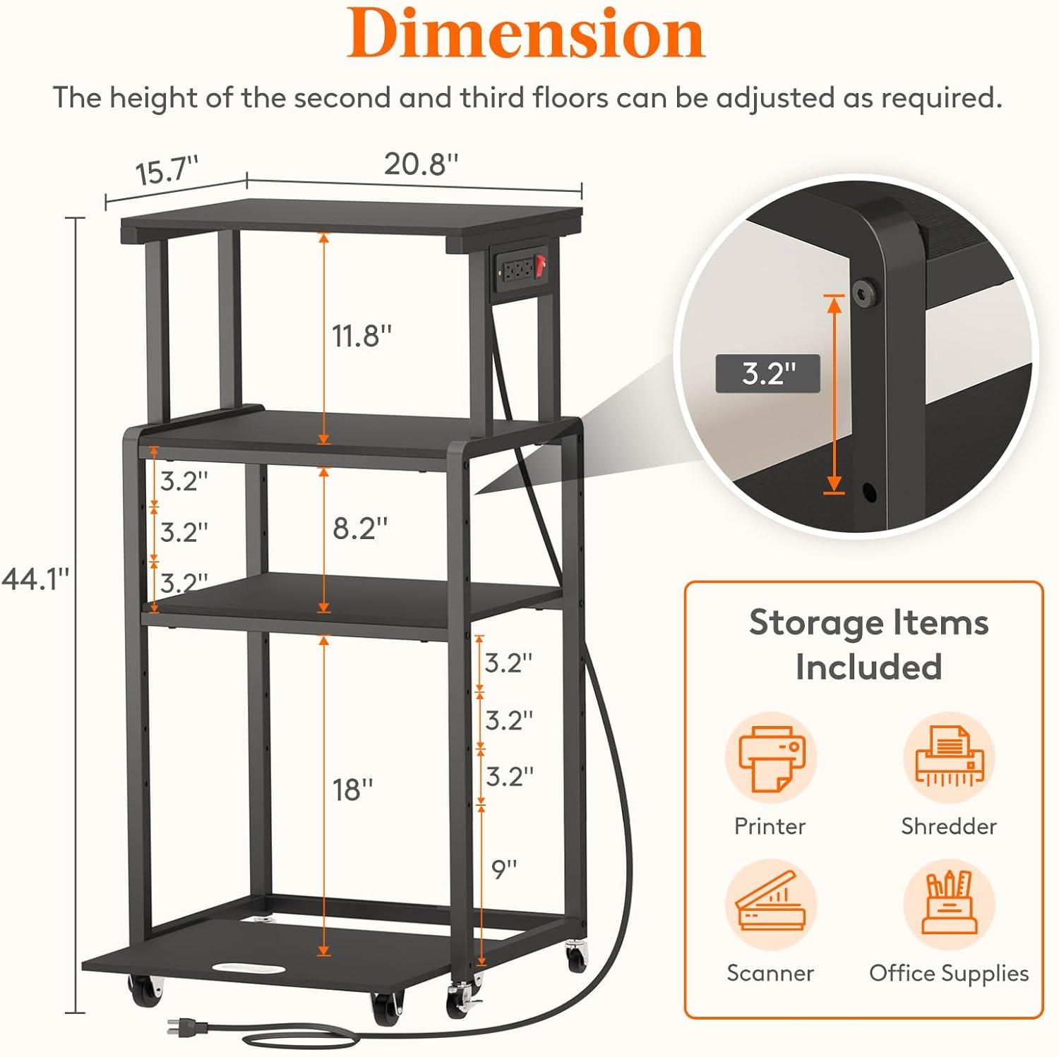 Adjustable Storage Space: Two middle shelves offer 7 levels of height adjustment. The detachable third shelf maintains stability. Customize space for scanners, CPUs, or fax machines by raising or removing the third shelf; lower the second shelf for taller printers. The bottom shelf rolls out for convenient access to a paper shredder.
