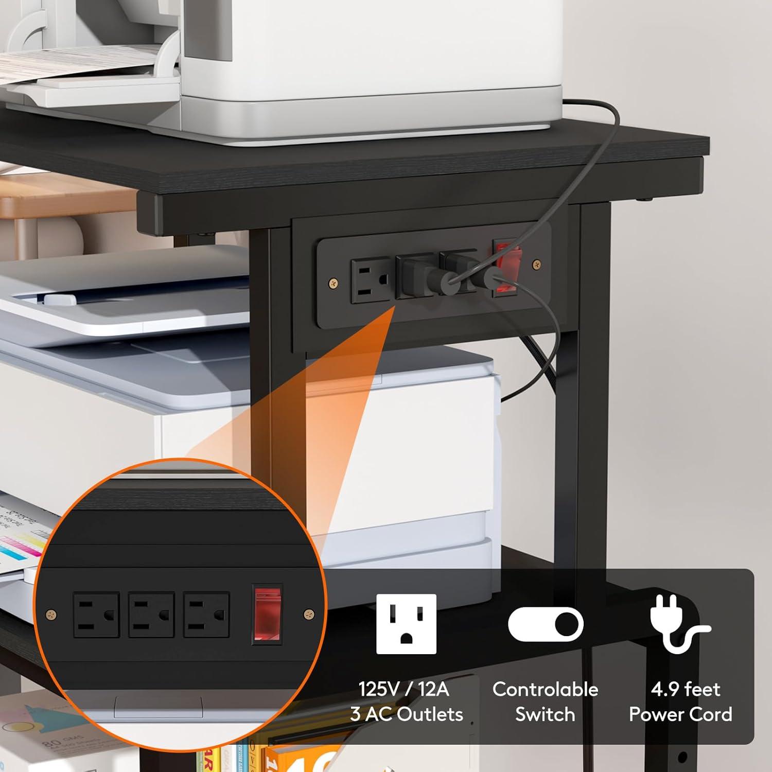 Power Socket: The printer desk features three triple outlets and a switch, allowing you to connect printers and other electronic devices simultaneously, enhancing office efficiency and avoiding messy wires and insufficient sockets. The 4.9-foot power cord enables easy movement of the entire stand for convenient machine use.