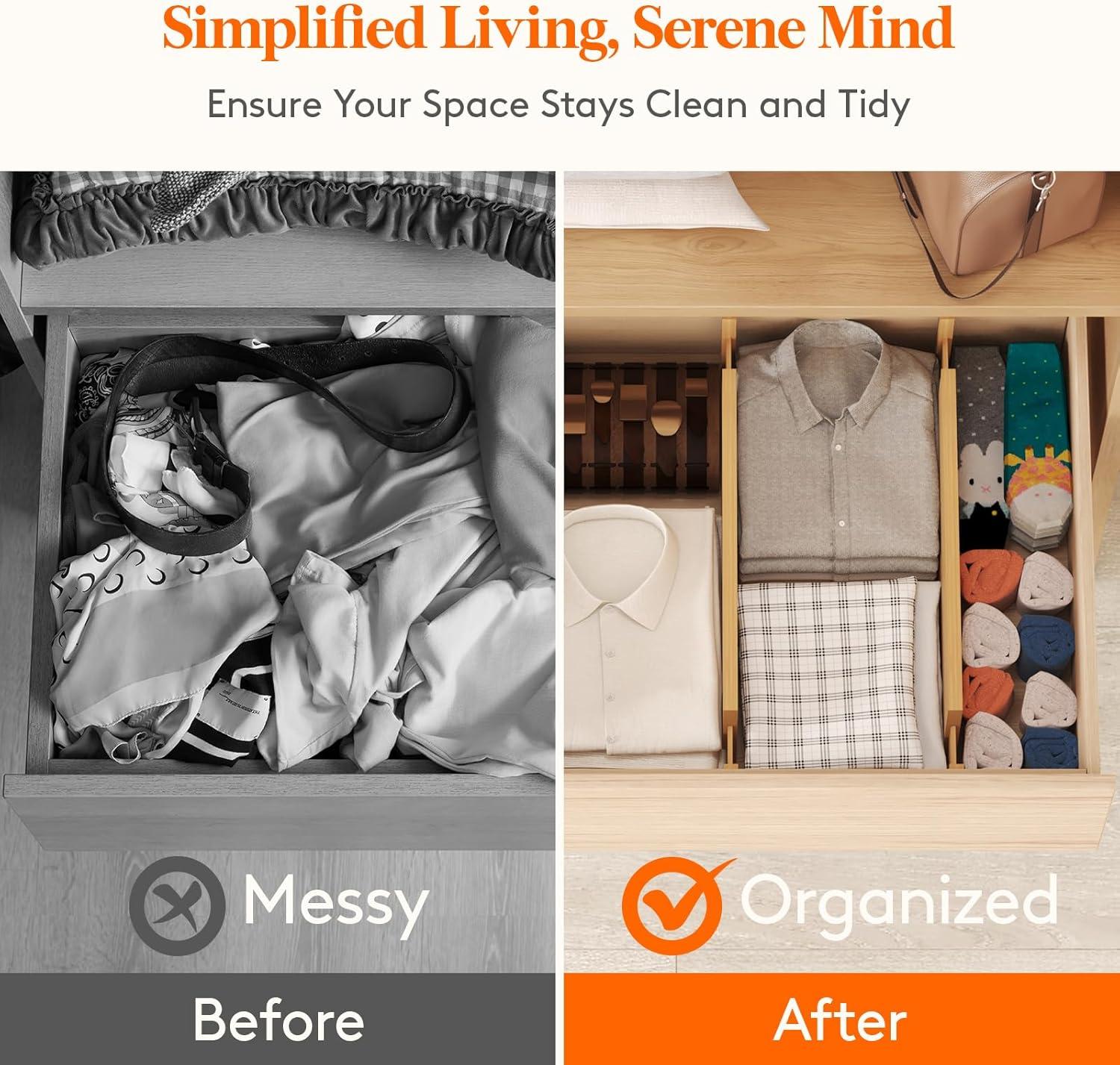 Quick Setup: The expandable dresser separators come with built-in springs for secure and stable placement; They can be easily adjusted in length to meet your specific needs; The minimalist and natural design enhances the aesthetic of most drawers