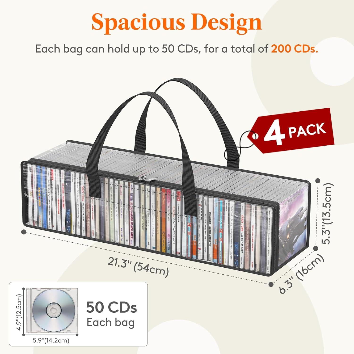 Large Capacity: 2-piece CD storage bag set, with each bag measuring 21.3″ (54 cm) x 6.3″ (16 cm) x 5.3″ (13.5 cm). Each bag can hold up to 50 CDs, allowing for a total capacity of 100CDs—perfect for organizing extensive collections