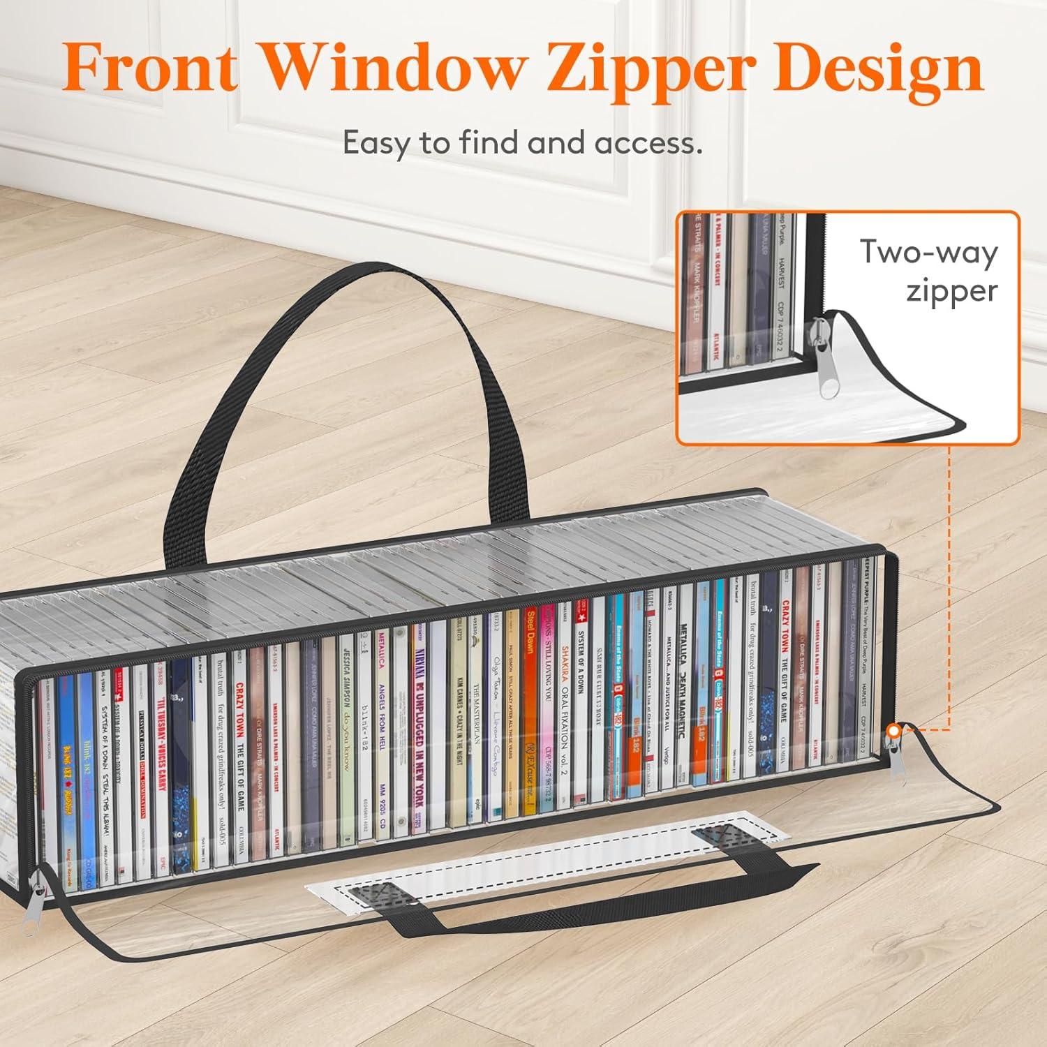Front Zipper Window Design: Convenient front window with zipper on the CD storage box enables easy access while maintaining stackability