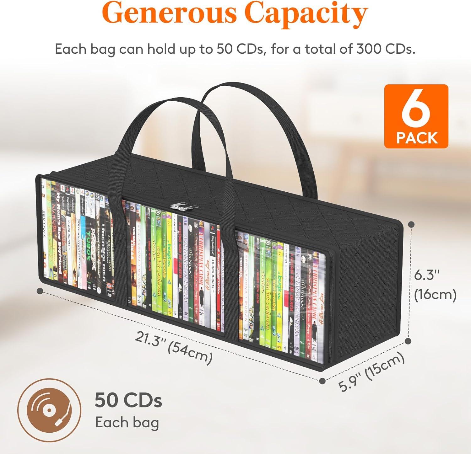Spacious Capacity: This set of 6 DVD storage bags features individual dimensions of 20.5″(52 cm)*7.1''(18 cm)*9.1”(23 cm), each capable of holding approximately 40 DVDs, totaling up to 240 DVDs