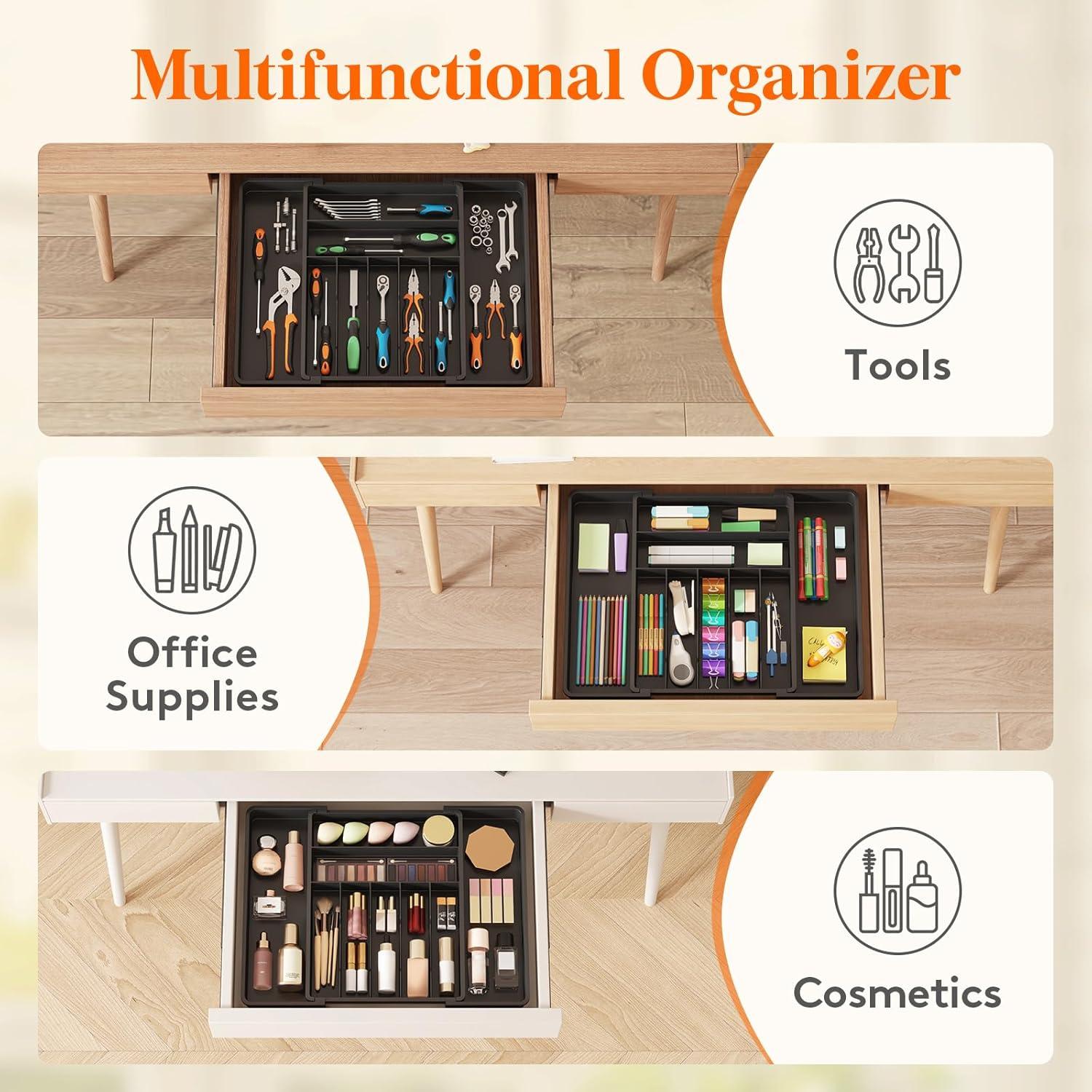 Adjustable Design: The width can be adjusted between 13 – 22.3 inches (33 – 56.7 cm), making it compatible with various drawer sizes. When fully expanded, its dimensions are 22.3 x 16.7 x 1.9 inches (56.7 × 42.4 × 4.9 cm), and when collapsed, it reduces to 13 x 16.7 x 1.9 inches (33 × 42.4 × 4.9 cm)