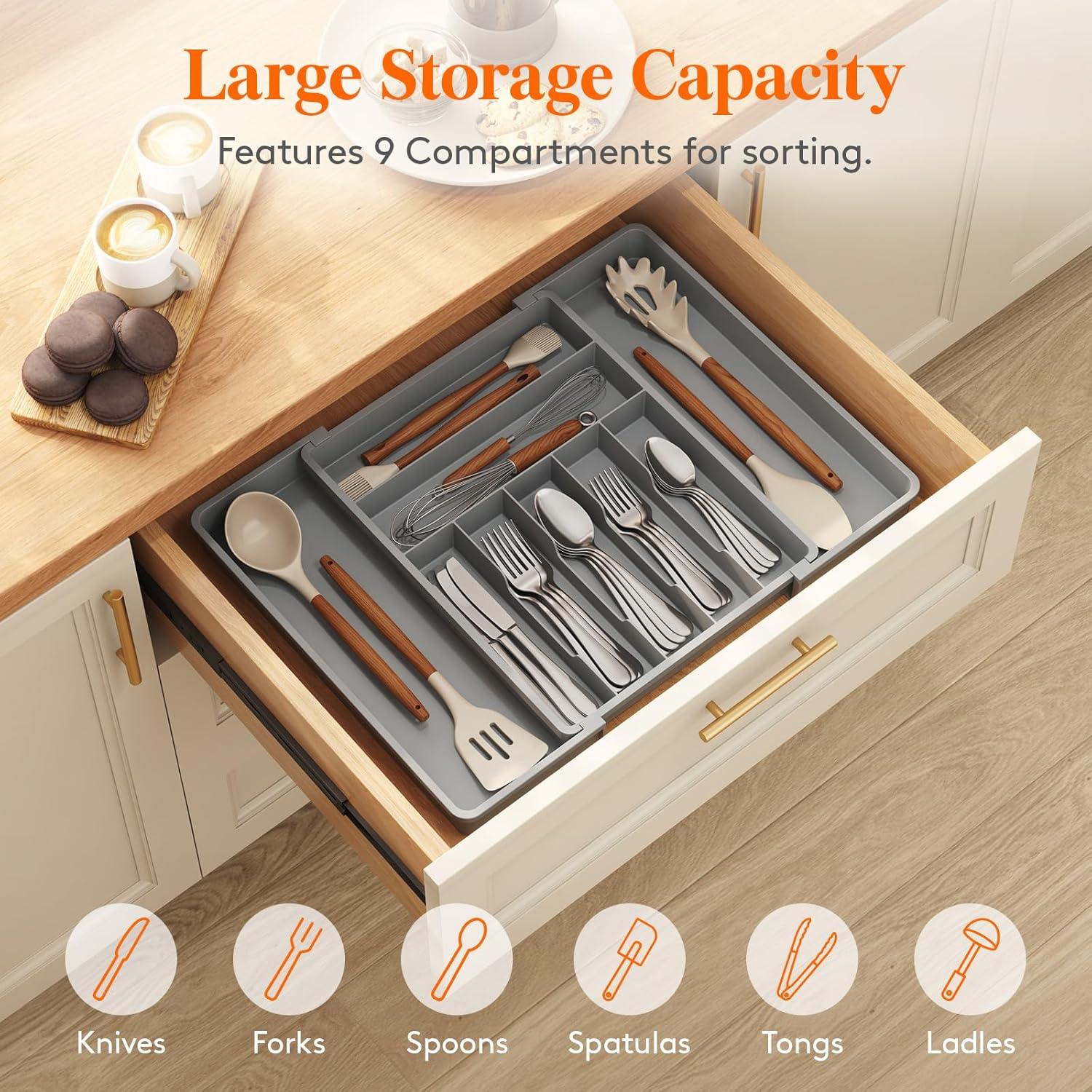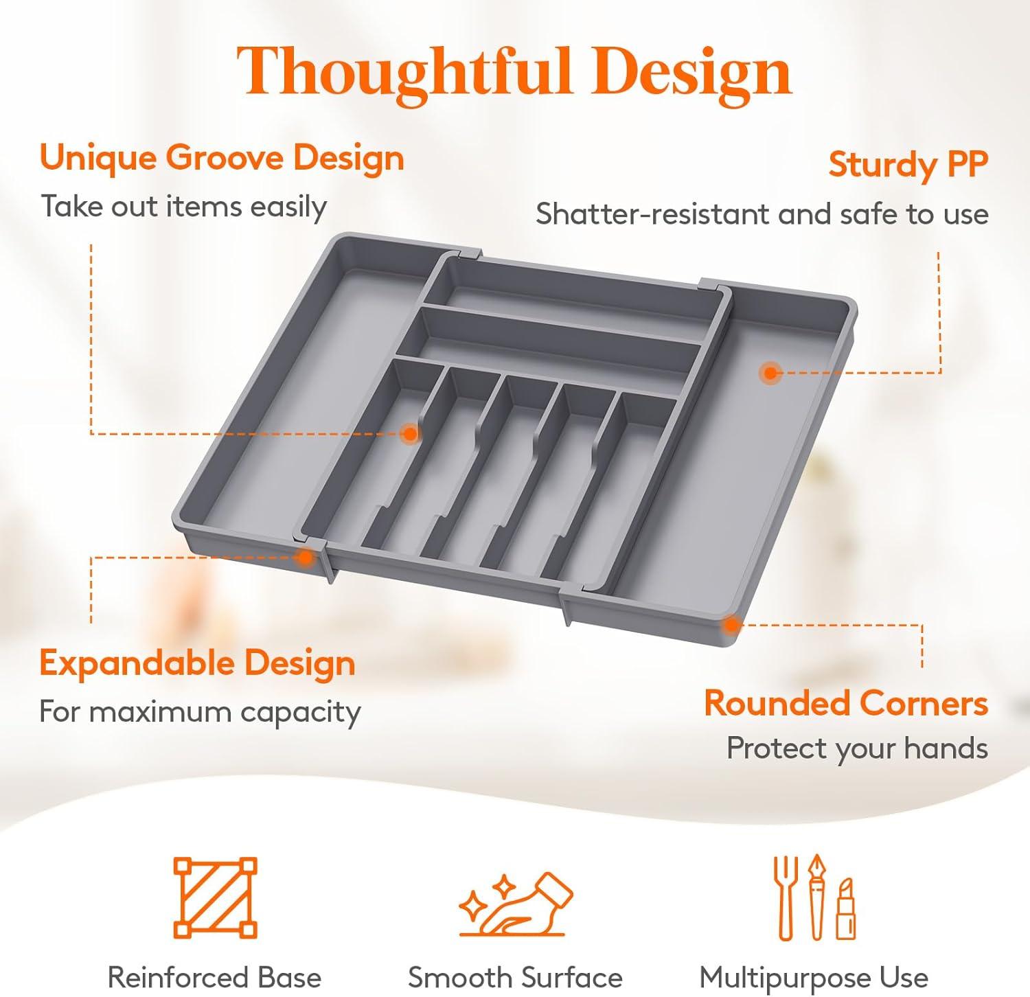 Large Capacity: This silverware organizer helps tidy up your kitchen drawers and free up more space. Both sides have expandable panels for storing knives, forks, spoons and more kitchen utensils