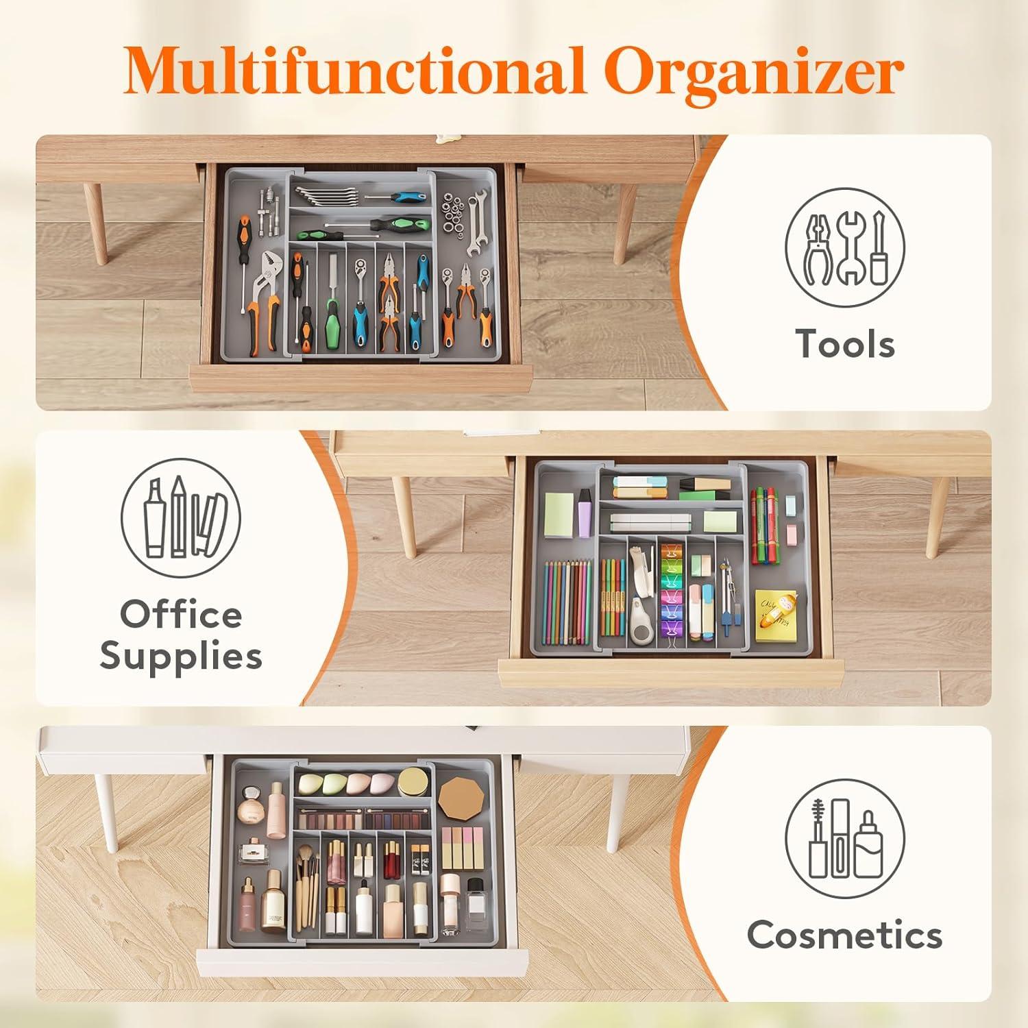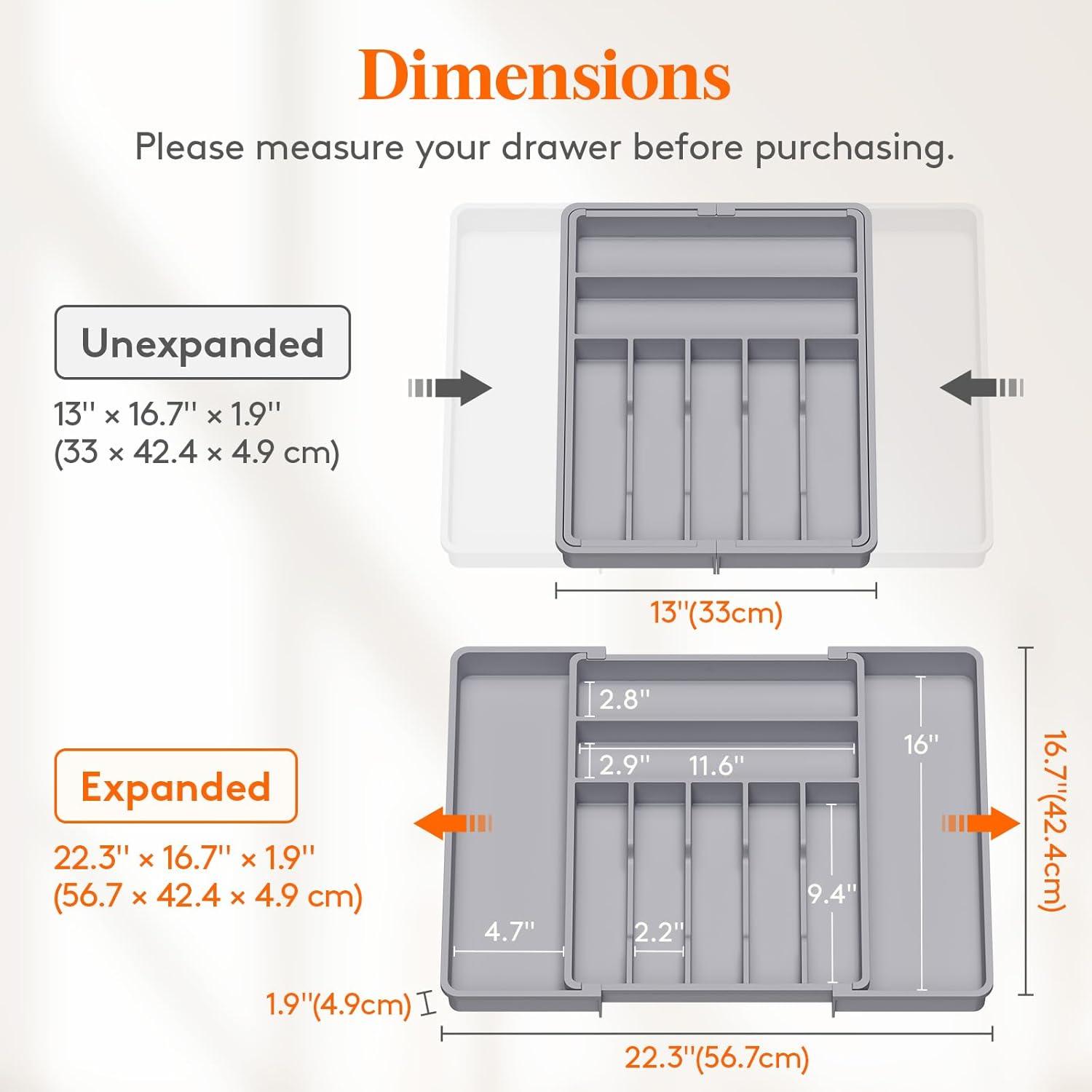 Adjustable Design: The width can be adjusted between 13 – 22.3 inches (33 – 56.7 cm), making it compatible with various drawer sizes. When fully expanded, its dimensions are 22.3 x 16.7 x 1.9 inches (56.7 × 42.4 × 4.9 cm), and when collapsed, it reduces to 13 x 16.7 x 1.9 inches (33 × 42.4 × 4.9 cm)