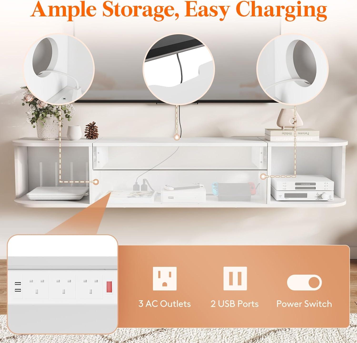 Built-in Power Strip: Equipped with a built-in power strip (three outlets and two USB ports) for powering your TV, router, and gaming console; open shelves on both sides have cable holes for easy cable management