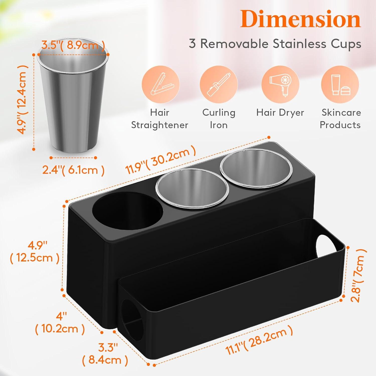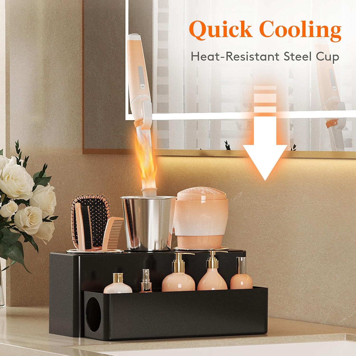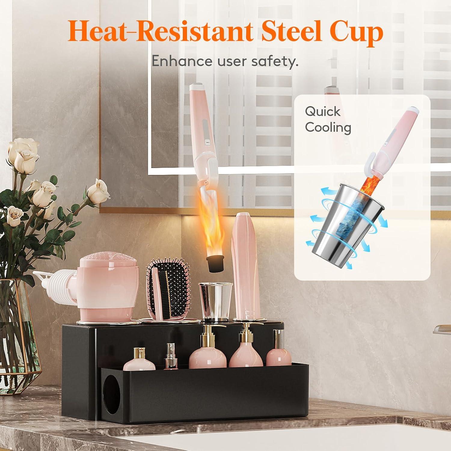 Heat-Resistant Tool Holder: This hot tools organizer comes with four heat-resistant stainless steel cups, which serve as holders for your dryer and curlers, helping them cool down quickly. The cups feature a deep design to ensure stability and prevent tipping