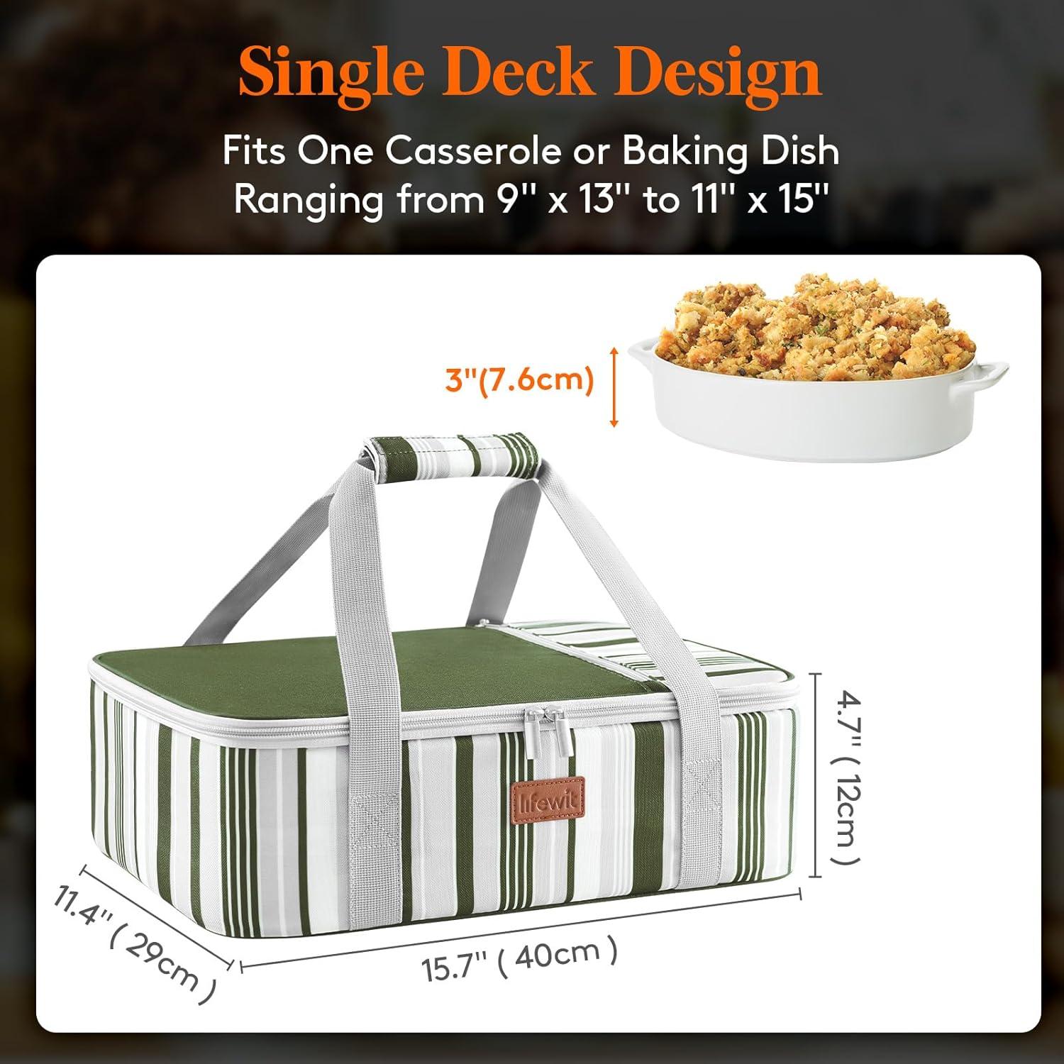 Single Deck Design: The external dimensions of the casserole carrier for hot and cold food measures 15.7 x 11.4 x 4.7 inches (L x W x H). It is compatible with casseroles and baking dishes ranging from 9 x 13 inches to 11 x 15 inches (not included).
