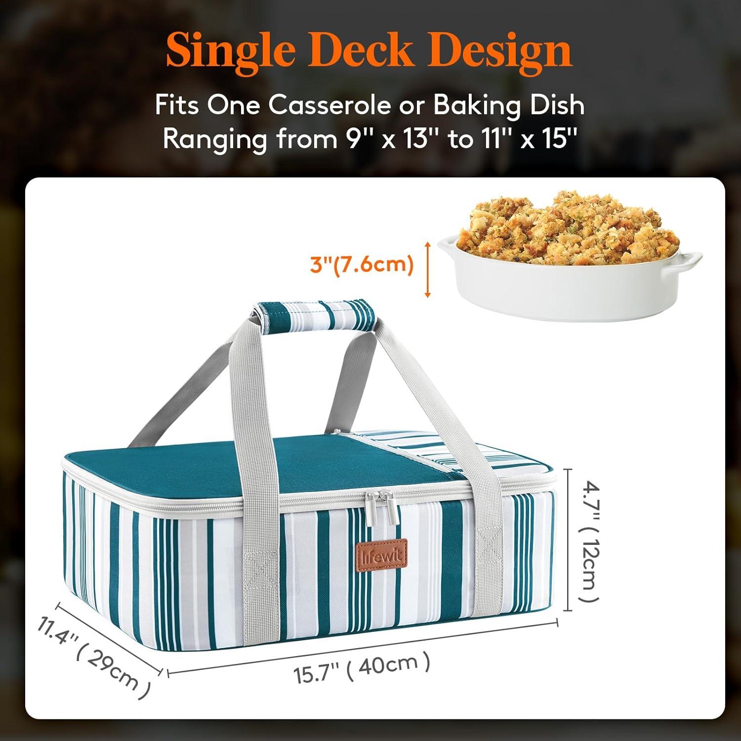 Single Deck Design: The external dimensions of the casserole carrier for hot and cold food measures 15.7 x 11.4 x 4.7 inches (L x W x H). It is compatible with casseroles and baking dishes ranging from 9 x 13 inches to 11 x 15 inches (not included).
