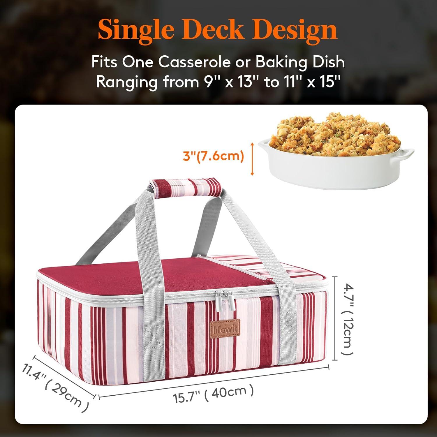 Single Deck Design: The external dimensions of the casserole carrier for hot and cold food measures 15.7 x 11.4 x 4.7 inches (L x W x H). It is compatible with casseroles and baking dishes ranging from 9 x 13 inches to 11 x 15 inches (not included).