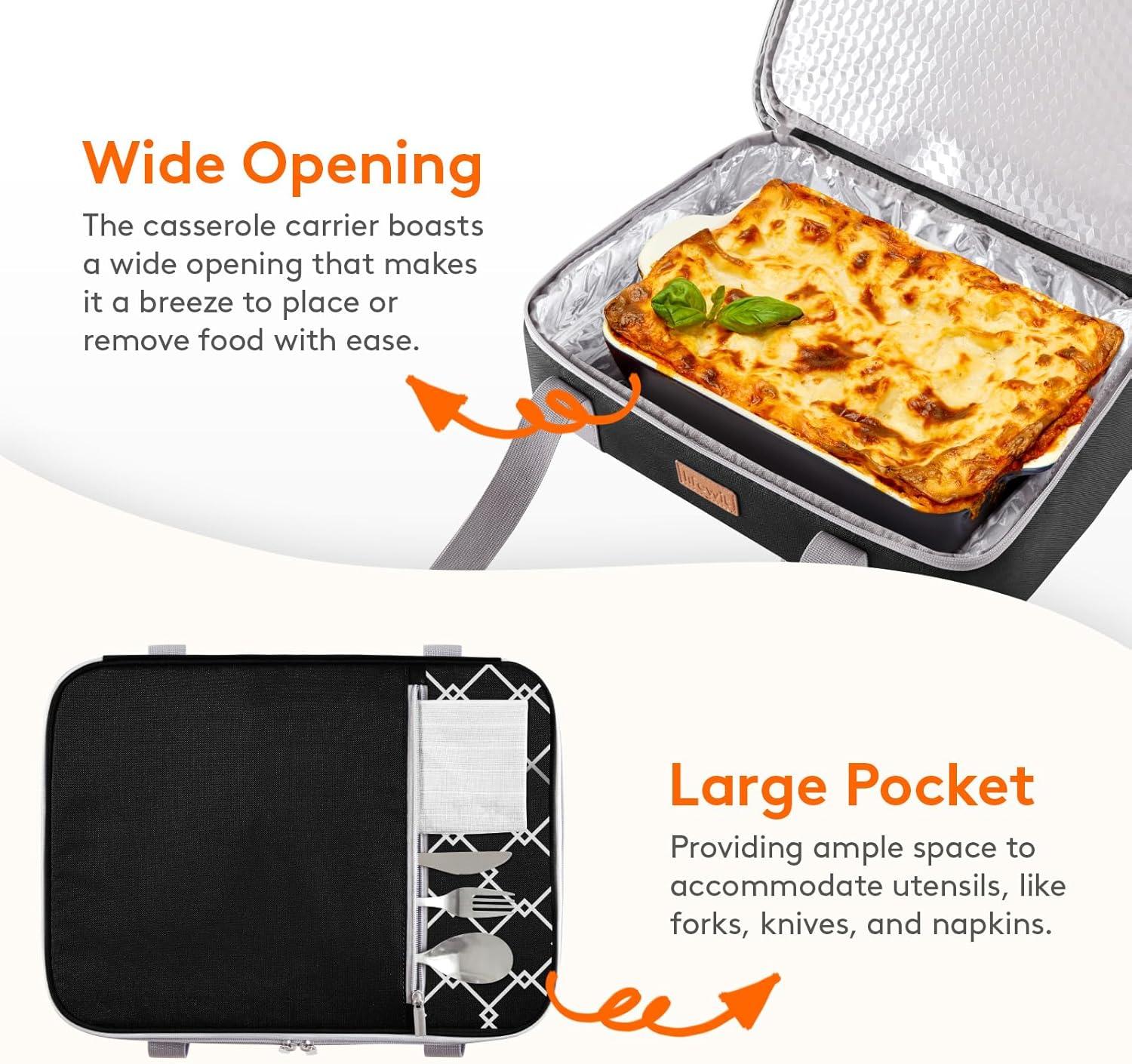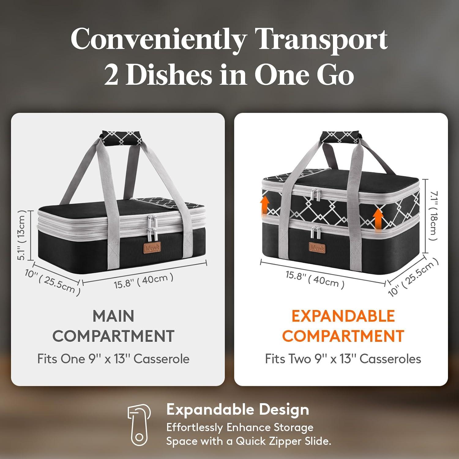 Expandable Design: The external dimensions of the casserole carrier for hot and cold food measures 15.8″ x 10″ x 5.1″. The top compartment is expandable, expanded size: 15.8″ x 10″ x 7.1″. It is compatible with casseroles and baking dishes ranging from 9 x 13 inches to 11 x 15 inches (not included)