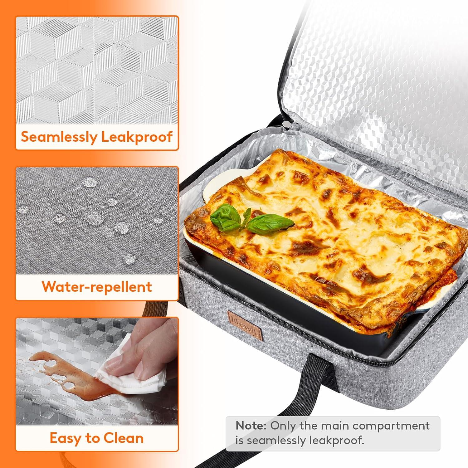 Leakproof: Our casserole dish carrier with lid is crafted from hot-pressed leak-proof aluminum foil, which prevents leaks and spills while perfectly maintaining food temperature. It is also effortlessly easy to clean, making it perfect for on-the-go use