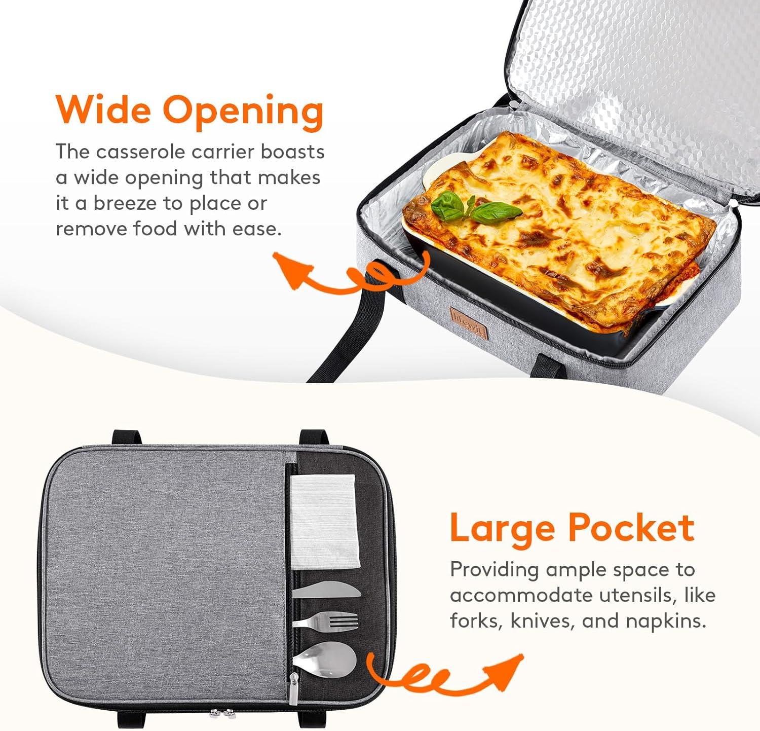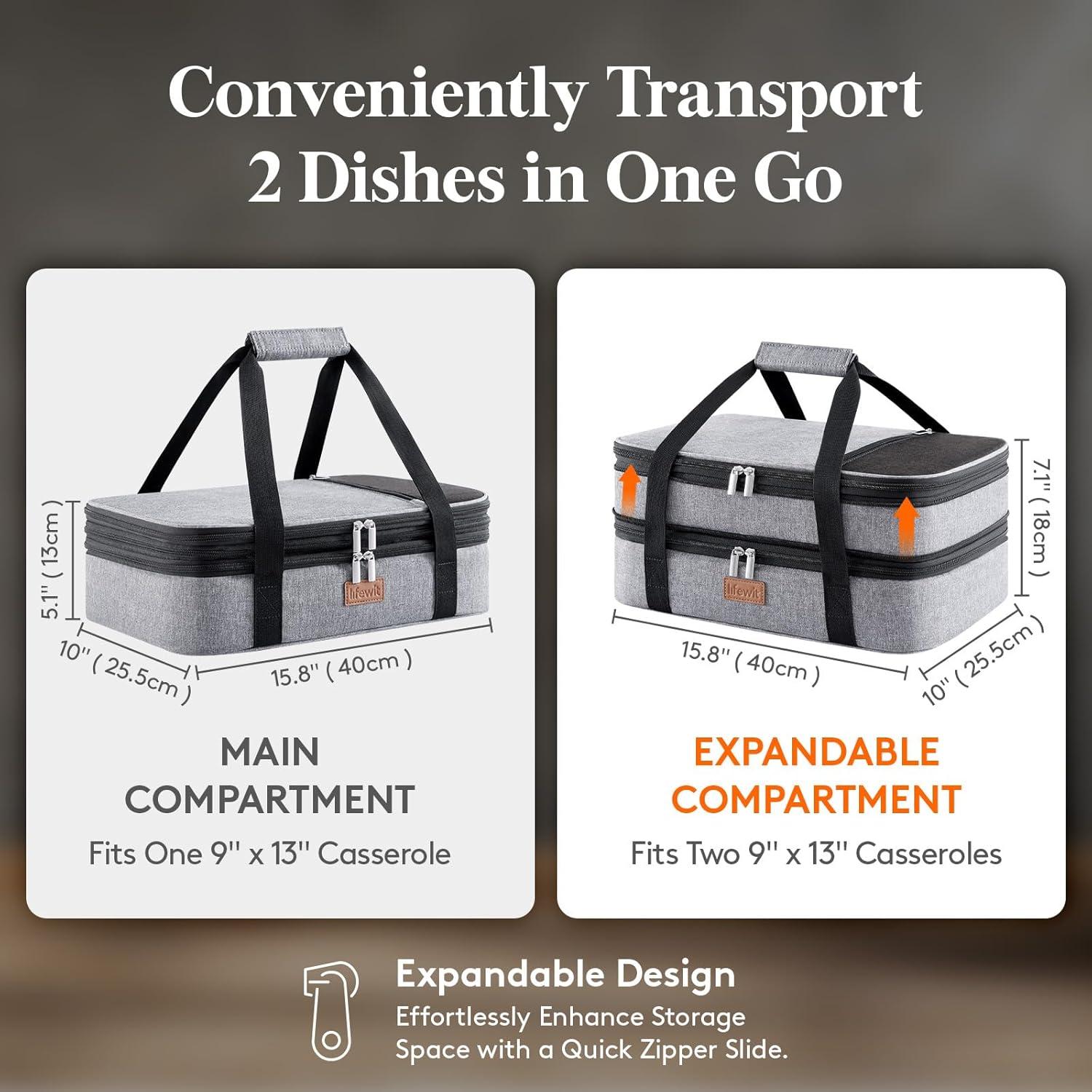 Expandable Design: The external dimensions of the casserole carrier for hot and cold food measures 15.8″ x 10″ x 5.1″. The top compartment is expandable, expanded size: 15.8″ x 10″ x 7.1″. It is compatible with casseroles and baking dishes ranging from 9 x 13 inches to 11 x 15 inches (not included)