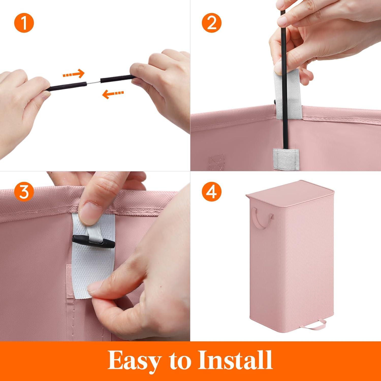 Firm & Stable: Constructed from 300D cationic fabric and 1.2mm adhesive coated EVA foam, this laundry hamper is fitted with 2mm cardboard inserts on top and bottom for structure stability. Along with a steel rod and 6 supporting glass fiber pole rods, this hamper is built solid and firm for use.