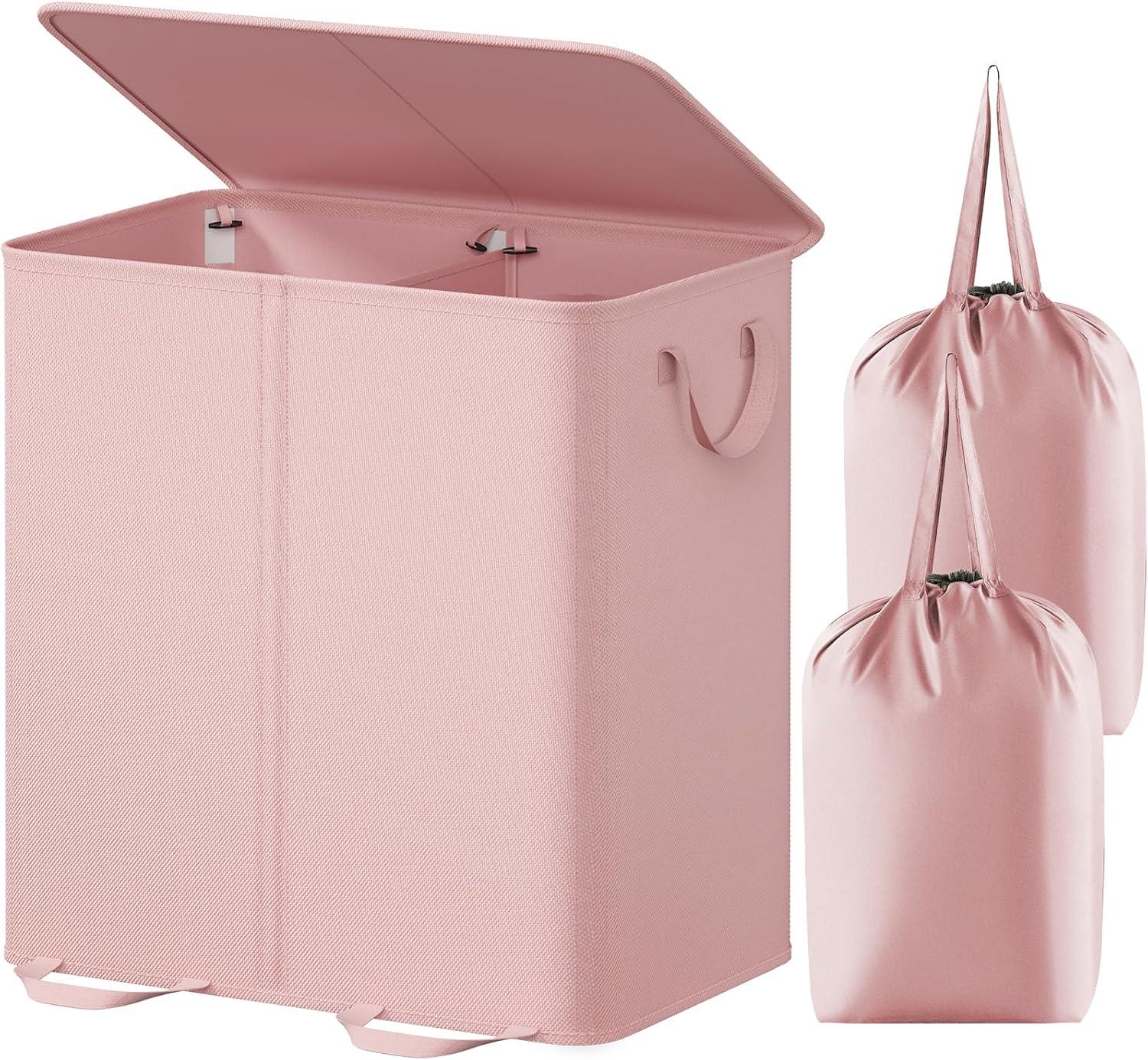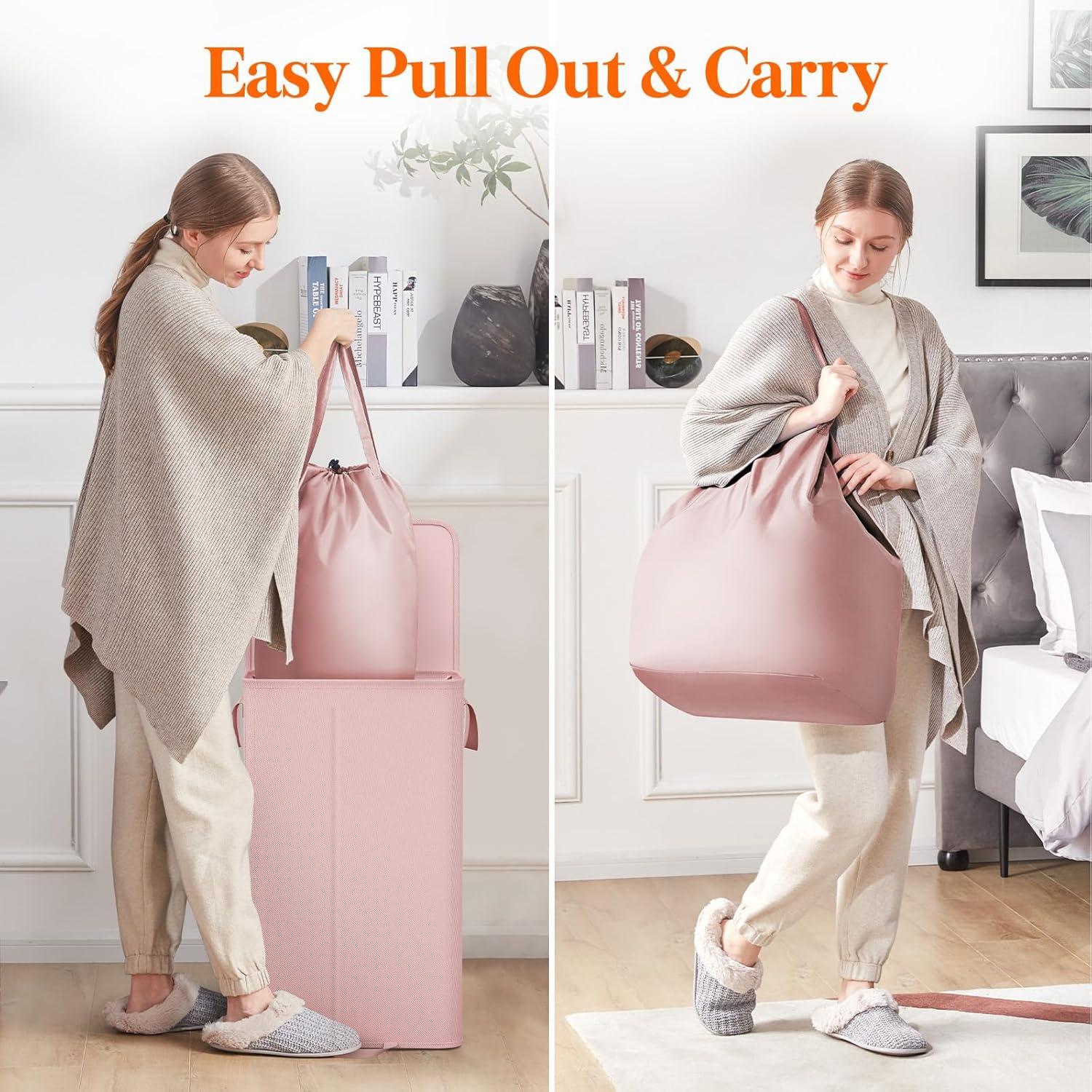 Two Large Compartments: With 2 large divided sections, you can easily separate darks and lights, clothing from linens, his and her items, or adult pieces. Two included laundry bags with handles fits onto the hamper firm and tight with drawstring stoppers. Use the handles to easily pull out the removable laundry bags with dirty laundry for wash.