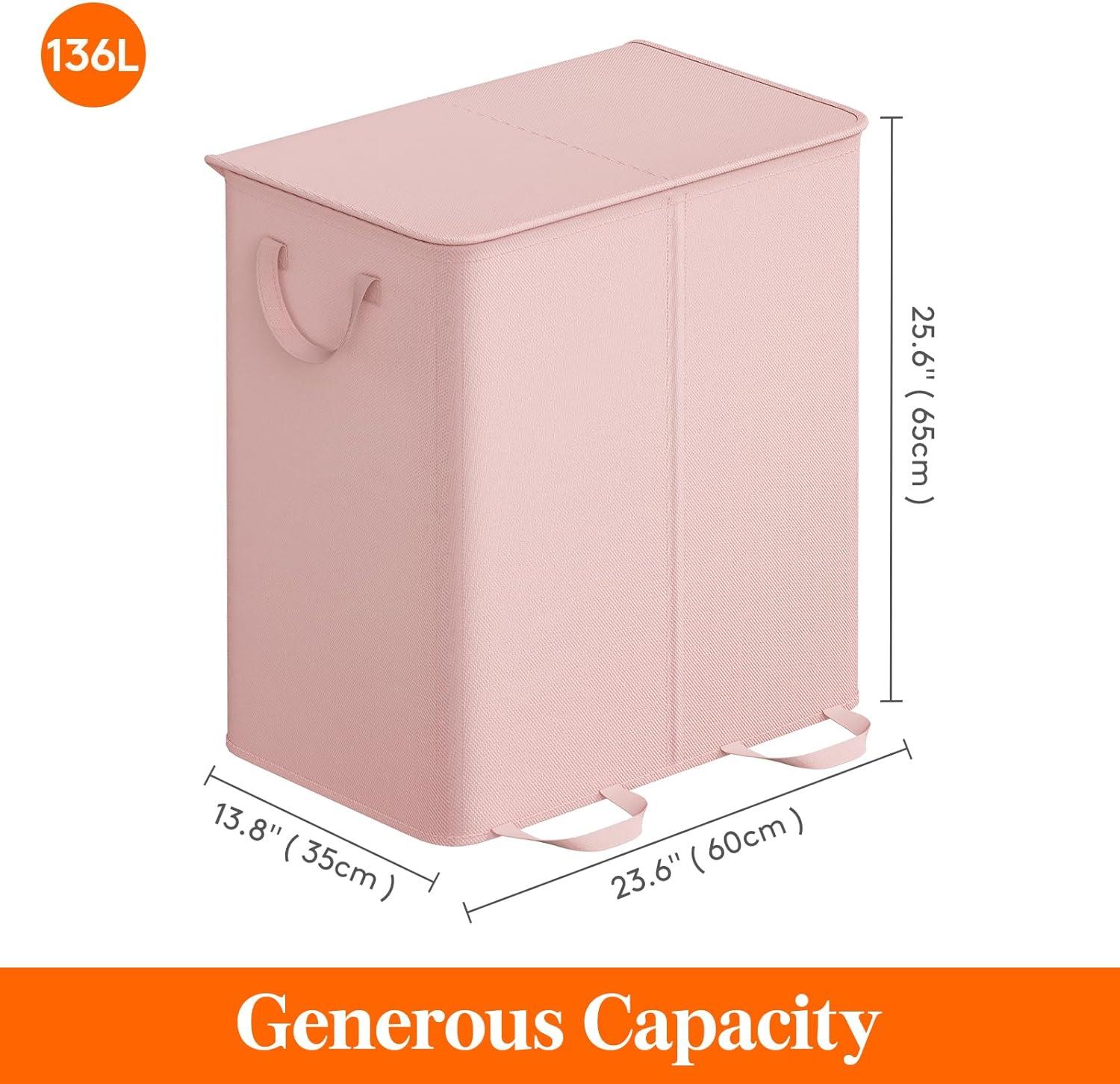 Generous Capacity: The overall dimension of the entire hamper is 23.6'' ( 60cm ) x 13.8'' ( 35cm ) x 25.6'' ( 65cm ), and the capacity is 136L, which can hold 3 – 4 loads of laundry. The capacity of each compartment is 68L, and they both can hold 1.5 – 2 loads respectively.