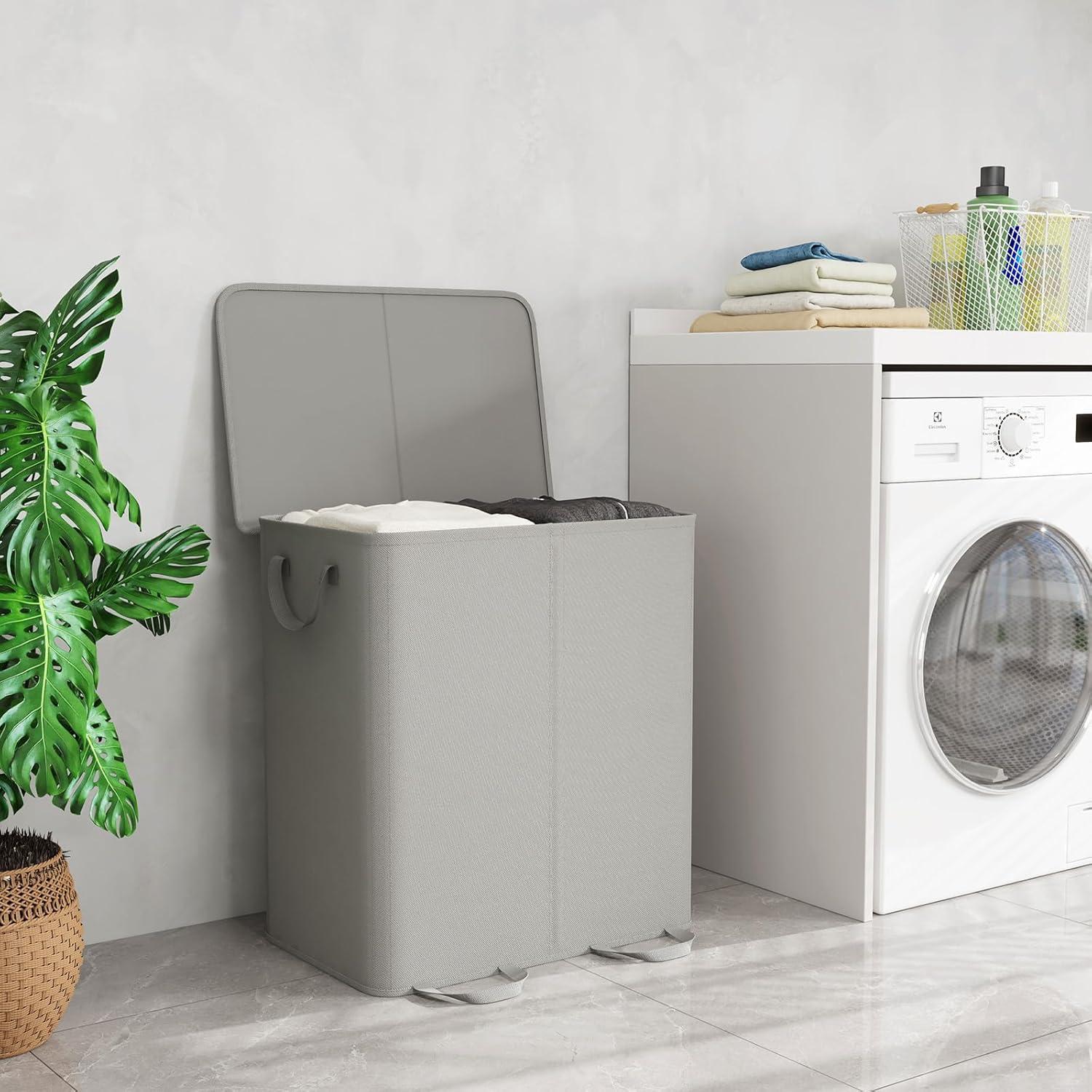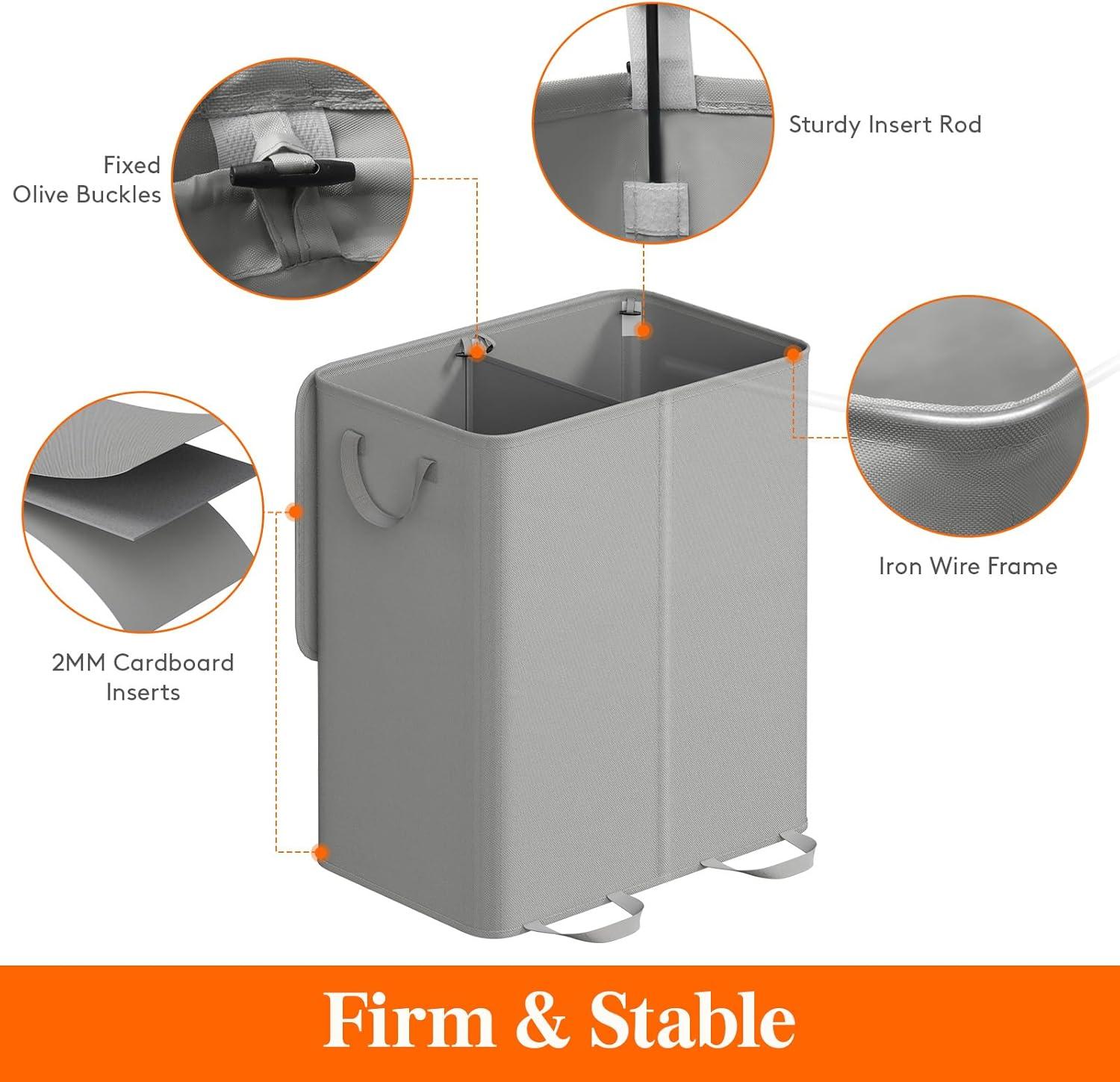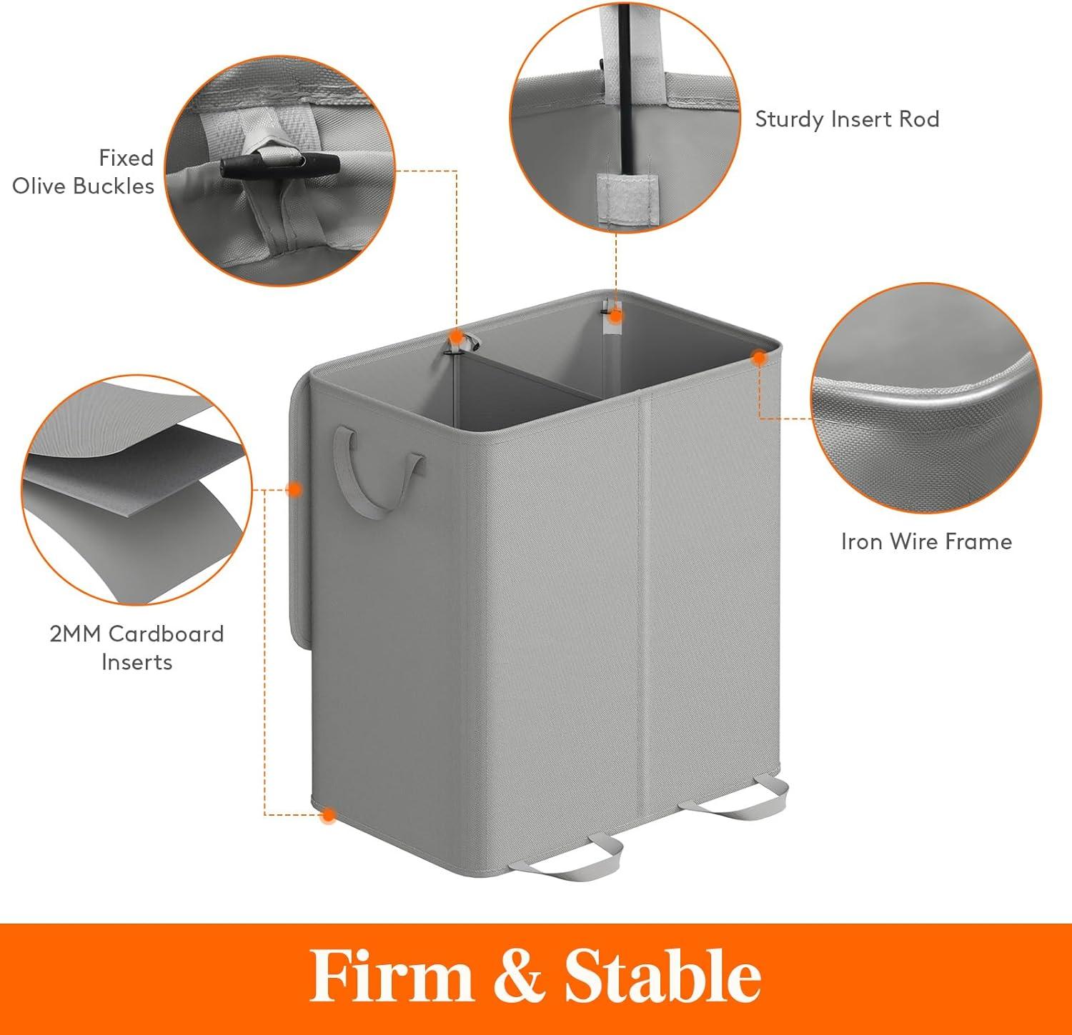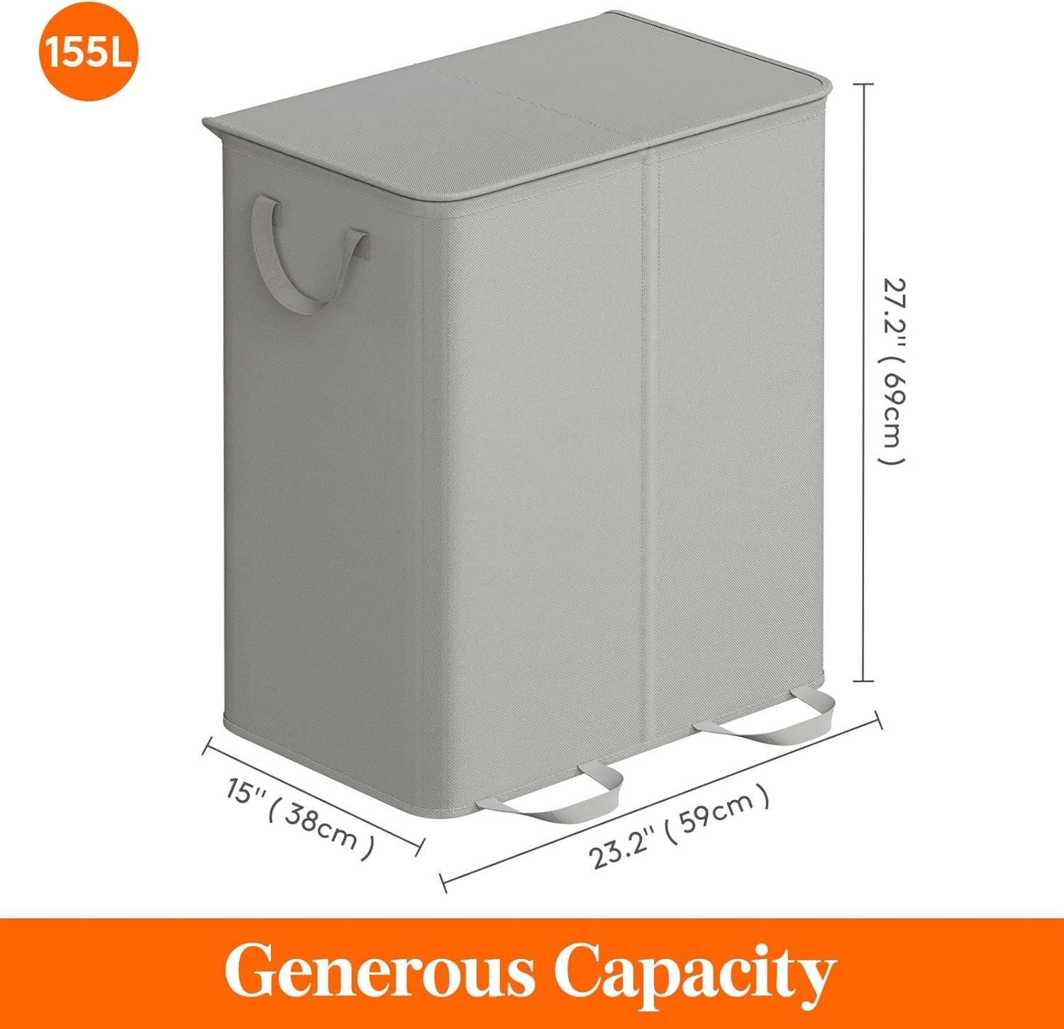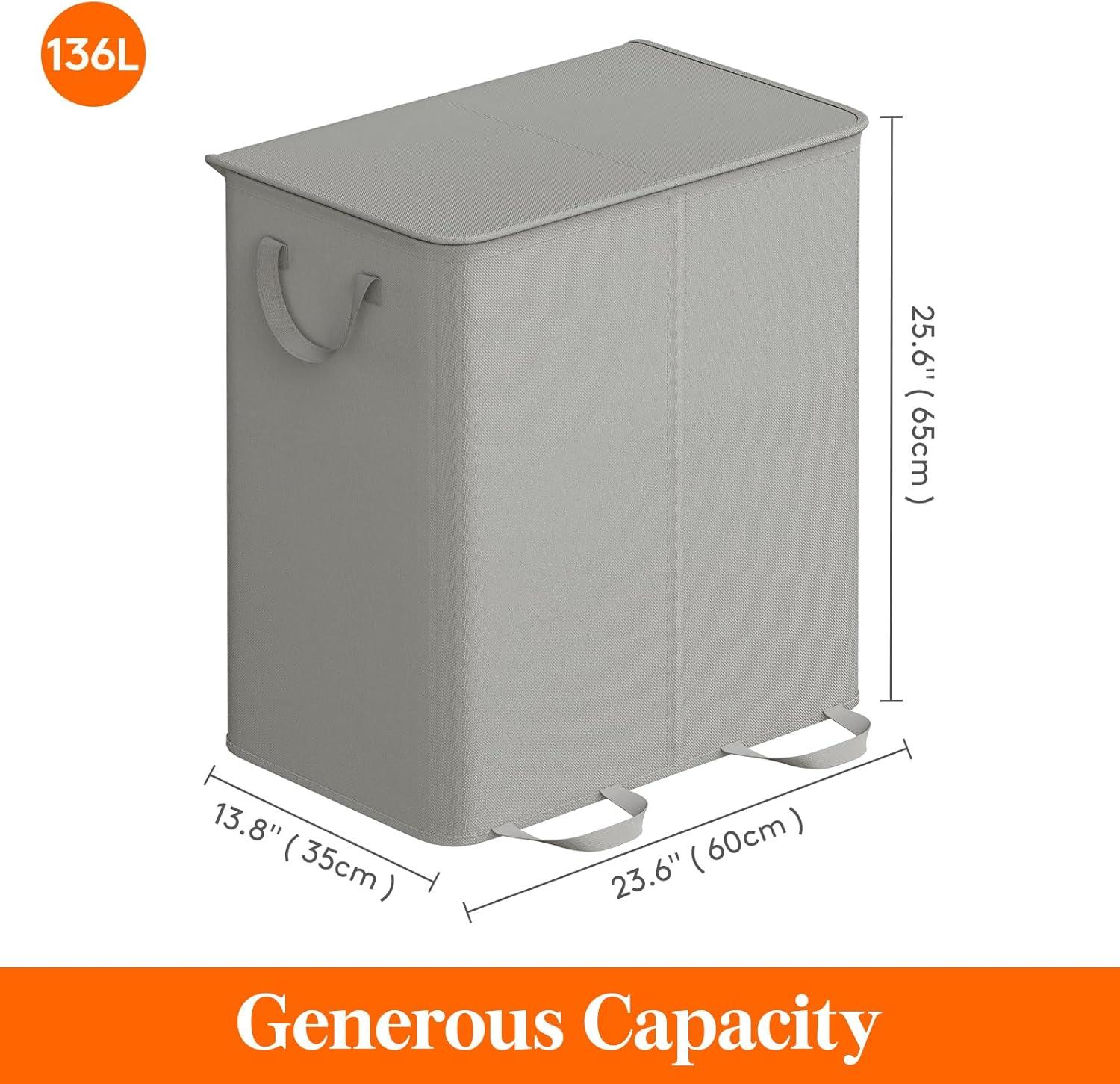 Generous Capacity: The overall dimension of the entire hamper is 23.6'' ( 60cm ) x 13.8'' ( 35cm ) x 25.6'' ( 65cm ), and the capacity is 136L, which can hold 3 – 4 loads of laundry. The capacity of each compartment is 68L, and they both can hold 1.5 – 2 loads respectively.