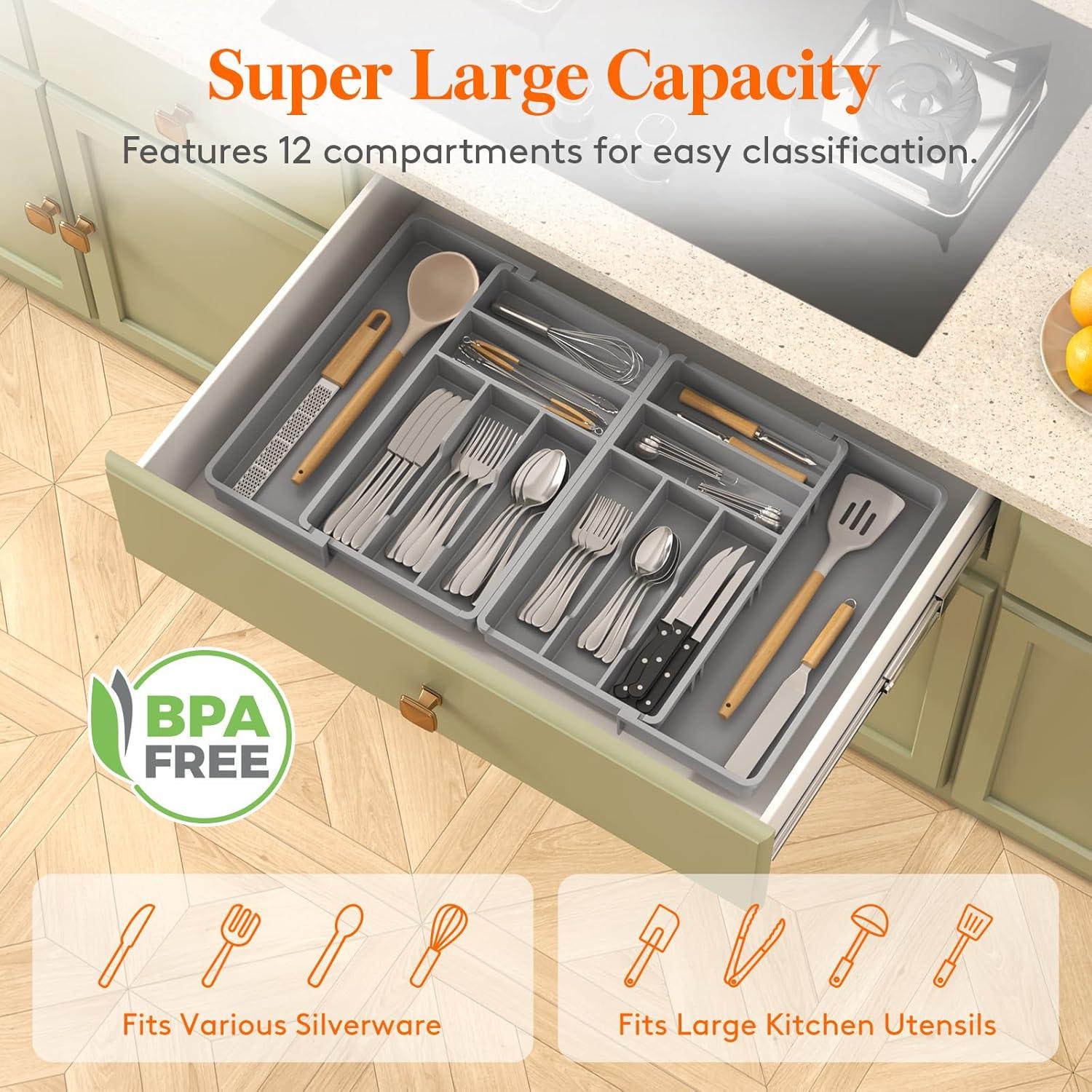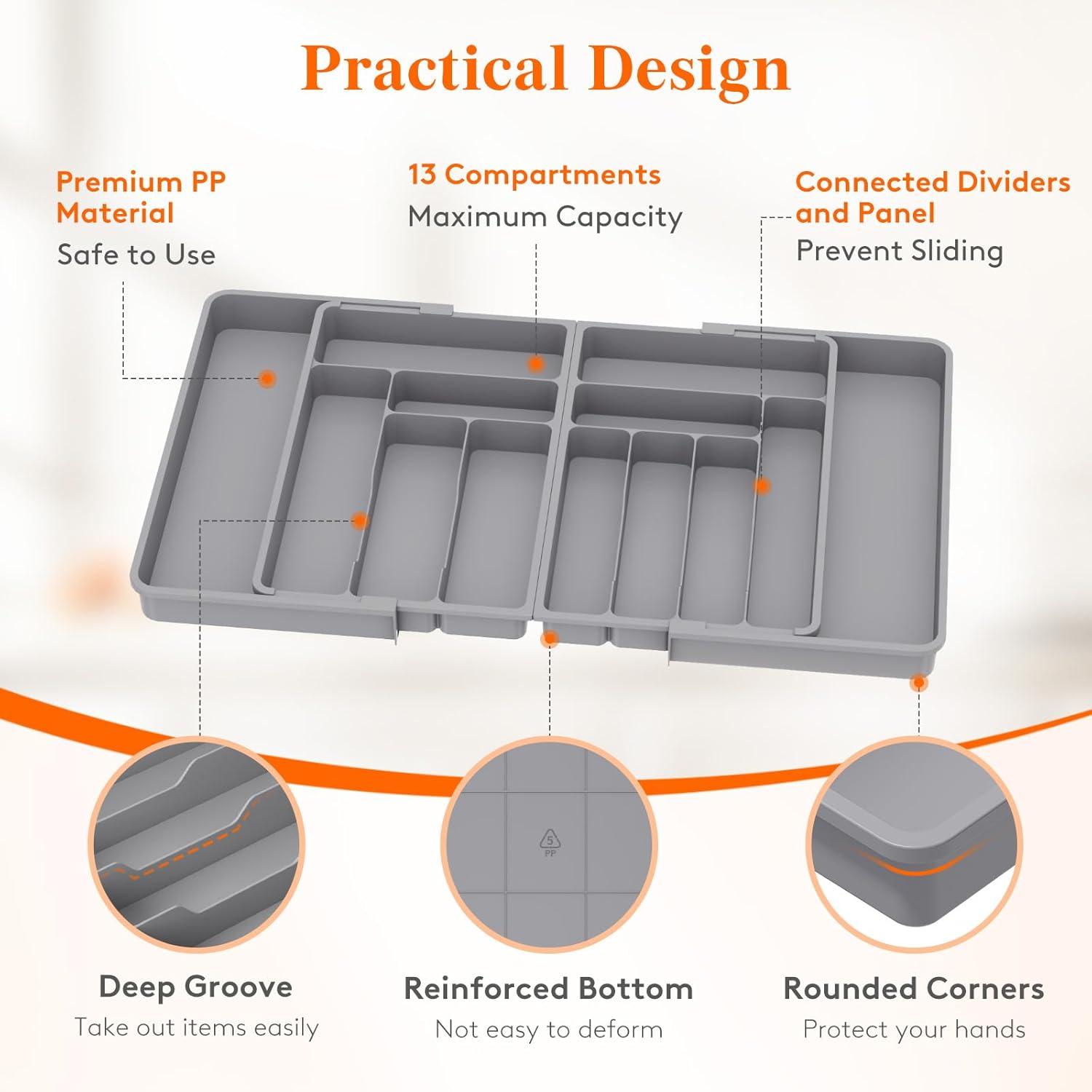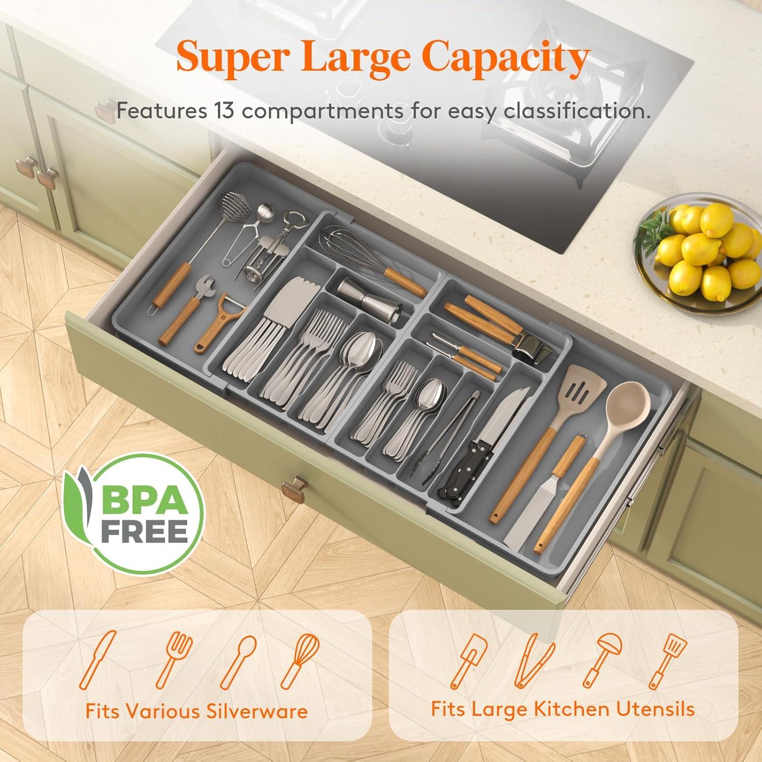 Super Large Capacity: This silverware tray features 11 compartments in the middle and 2 expandable layers. The expandable compartments are great for storing large kitchen utensils, while the middle compartments are perfect for cutlery and small tools. Maximize the storage capacity of your extra-wide kitchen drawers.