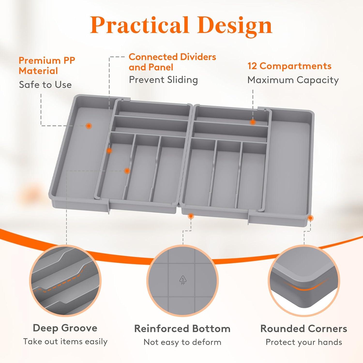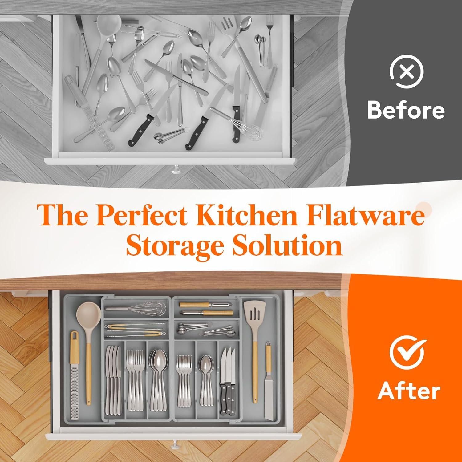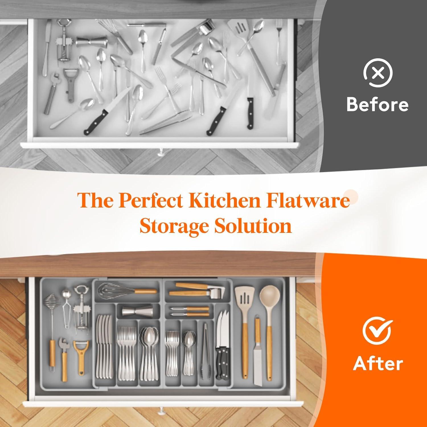 Super Large Capacity: This silverware tray features 11 compartments in the middle and 2 expandable layers. The expandable compartments are great for storing large kitchen utensils, while the middle compartments are perfect for cutlery and small tools. Maximize the storage capacity of your extra-wide kitchen drawers.